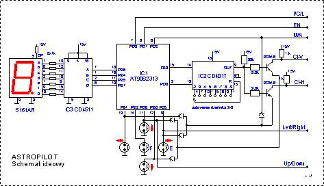 Układ AstroPilota jest dość prosty, składa się z 3 układów scalonych, wyświetlacza 7 segmentowego, 5 klawiszy oraz kilku elementów dyskretnych. 'Sercem' Astropilota jest mikrokontroler umożliwiający zaprogramowanie wszystkich funkcji układu. Większość parametrów może być ustawiona programowo. W szczególności, częstotliwość podstawową impulsowania można ustawić z klawiatury pilota, co umożliwia sterowanie pilotem praktycznie każdego montażu (dokładniej, możliwe jest dopasowanie szybkości obrotowej silnika krokowego do przełożnia mechanicznego używanego montażu). Jeśli zdecydujesz się na wykonanie samodzielne, lub z moją pomocą AstroPilota, otrzymasz bezpłatnie program do sterowania Astropilotem. Jeśli jesteś zainteresowany - proszę o kontakt. Tu znajdziesz dokumentację opisującą działanie AstroPilota i pozwalającą na samodzielne jego złożenie (Uwaga !, plik samorozpakowujący się 414kB !). Zdjęcie 3. Schemat AstroPilota. |