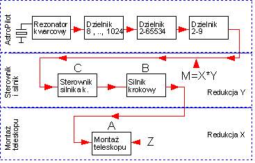 | Krok 1- określenie przełożenia mechanicznego X montażu teleskopu w osi RA. | Jest to pierwszy krok w procedurze. Może być wykonany tylko z konkretnym montażem teleskopowym. Polega na ustaleniu wielkości X czyli wymaganej prędkości obrotowej przełożenia mechanicznego montażu. Do wyliczenia wartości X niezbędna jest znajomość przełożenia przekładni mechanicznej - Z montażu oraz prędkości obrotu sfery niebieskiej. Prędkość ta jest stała i wynosi w przybliżeniu ok. 15 stopni w ciągu jednej godziny ruchu nieba (dokładna prędkość obrotu sfery niebieskiej wynosi (za El Capitano) 15.041 sekundy łuku/sekundę ). Przełożenie Z można wyliczyć sprawdzając o jaki kąt obróci się montaż teleskopu przy jednym obrocie osi napędu w miejscu gdzie dołączony będzie silnik krokowy. Najlepiej jest zrobić to wykonując wiele obrotów a żądaną wielkość wyliczyć dzieląc kąt o jaki obróci się montaż przez ilość wykonanych obrotów. Błąd pomiaru jest tym mniejszy im więcej obrotów zostanie wykonanych do celów pomiarowych. Z= (kąt obrotu montażu) / (ilość obrotów osi montażu). Ogólnie biorąc im większa jest redukcja mechaniczna tym lepiej. Pożadane wielkości przełożenia Z powinny mieścić się pomiędzy 0.72 stopnia/1 obrót a 0.24 stopnia/1 obrót,, minimalna wartość to nie mniej niż 3.6 stopnia/1 obrót. łuku/1sekundę. Wielkość X wyliczymy dzieląc prędkość obrotową nieba przez Z. Wartość X określa o jaki kąt w ciągu sekundy musi obrócić się oś napędowa montażu teleskopu aby montaż podążał synchronicznie za obserwowanym obiektem na niebie. Dla przykładu, jeśli nasza przekładnia ma Z=0.72 stopnia/1 obrót to X wynosi: X = (15.041" / sek ) /(0.72stopnia/1 obrót) = (15.041)/(0.72*60*60) obrotów/1sek = 0.0058029 obrotów/ sek. W równaniu tym 0.72 stopnia zamieniłem na sekundy mnożąc przez 60 (minuty) i drugi raz przez 60 (sekundy) dla ujednolicenia jednostek.