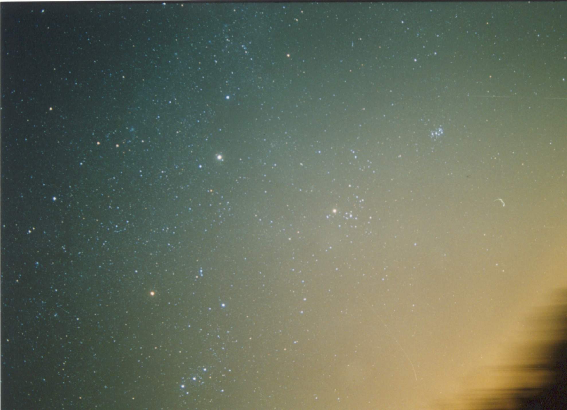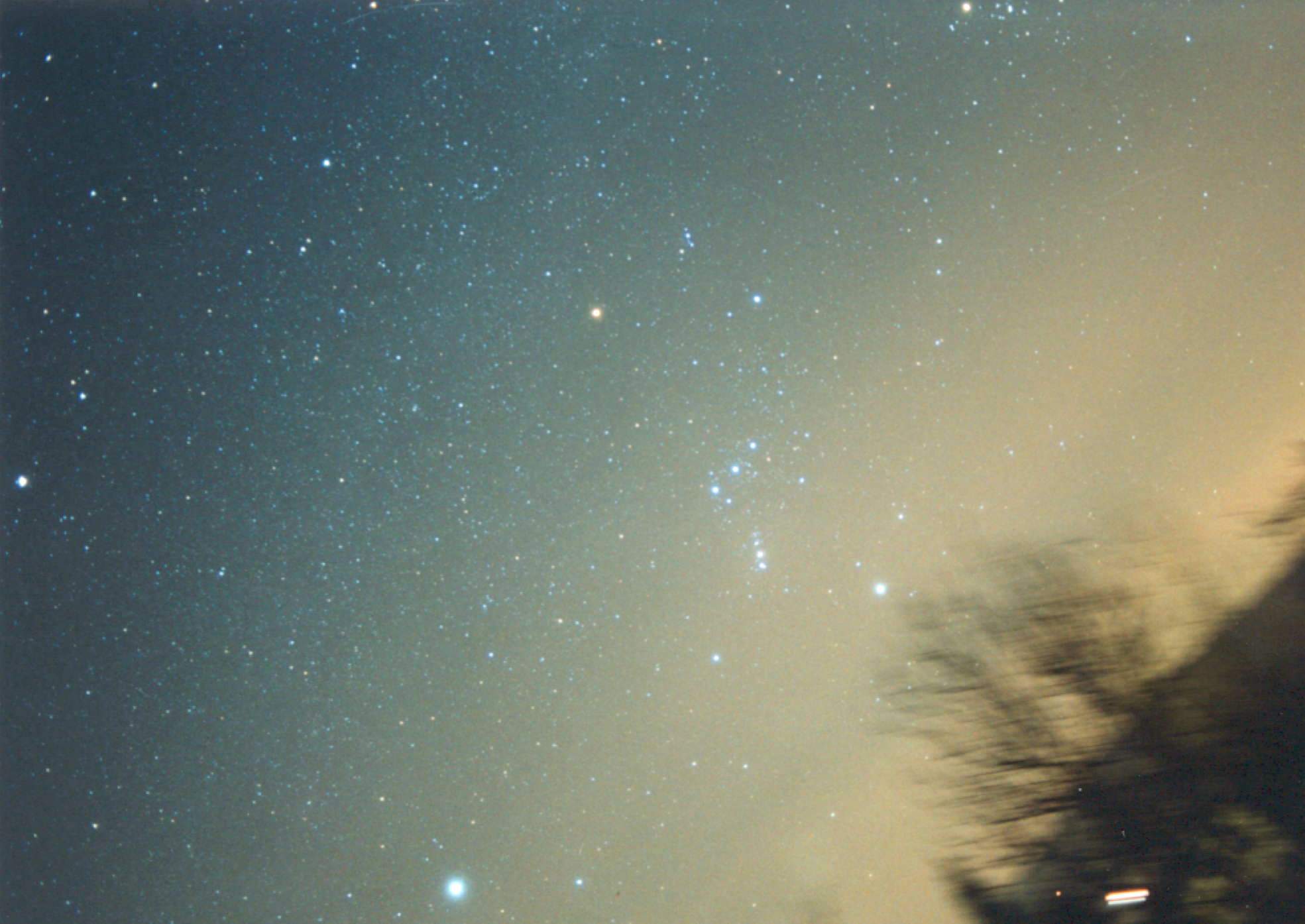 Wszystkie zdjęcia wykonał Bogdan Matyja (Bogdan ) podczas dwóch sesji (pierwsza w lutym, druga w kwietniu 2003r.) testujących zarówno sprzęt fotograficzny jak i możliwości jego głowicy astrofotograficznej wspomaganej moim sterownikiem oraz pilotem. Wszystkie zdjęcia prezentuję za zgodą Bogdana. Zdjęcie nr 1 to niebo tuż po zachodzie słońca w okolicy gwiazdozbioru Oriona -obiektyw cosina 28/2.8 -czas ekspozycji ok. 15 minut |