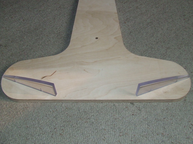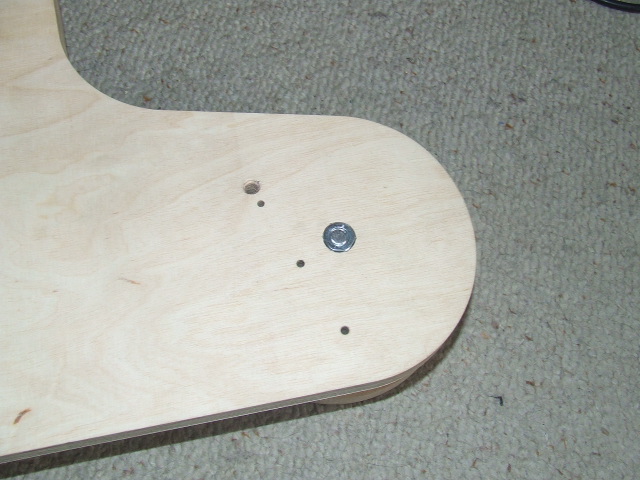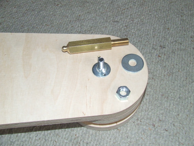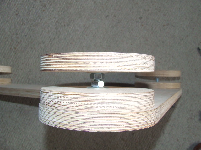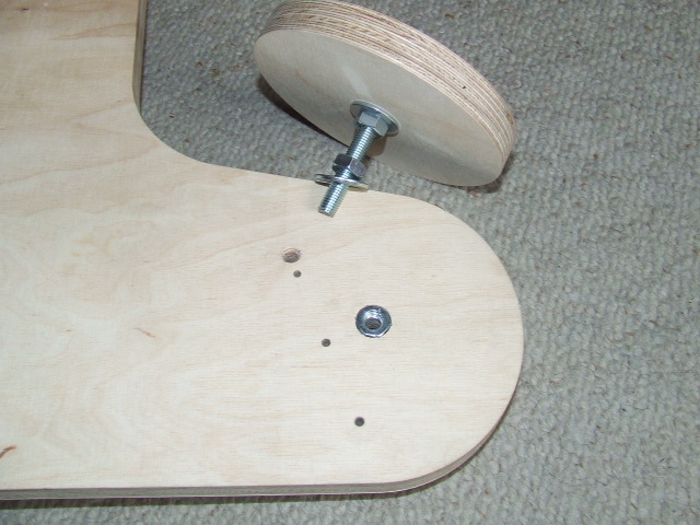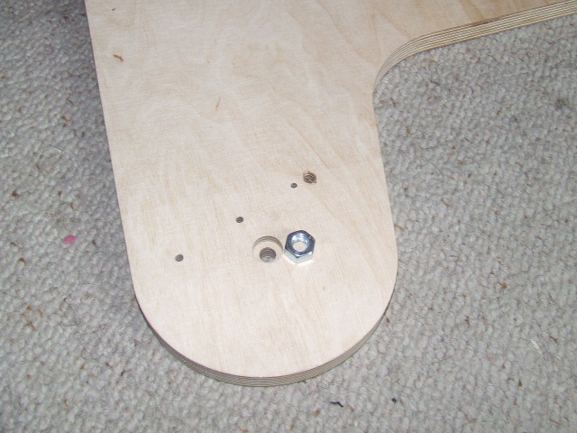 Step 4 - Mounting nuts in leg supportsLegs are fastened in bottom plate with supports (playwood #12mm) and butterfly nuts. Supports are mounted from bottom side of bottom plate. Nut M10 should be placed (inserted) into whole as described before in step 3. to do it use universal key, additional M10 nut and washer. Right leg support (under stepper engine side) has only M10 hole and nuts are mounted on both side of leg screw. This leg has always the same position. Support with big excentric hole is mounted on narrow side of bottom plate. |
