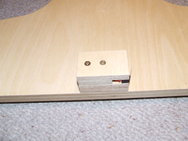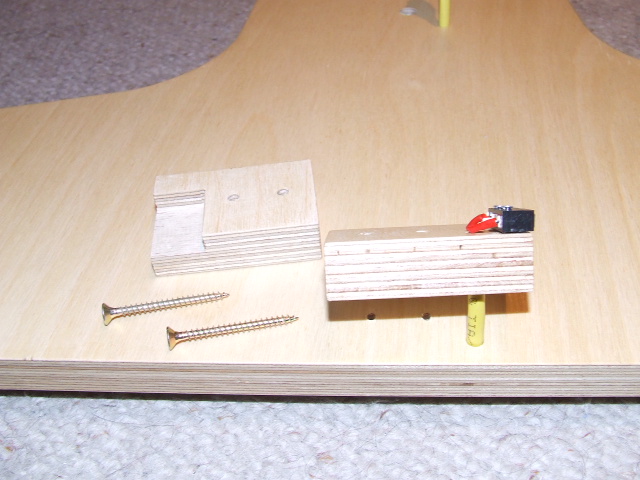 Step 11 - Run limiter mountingRun limiter consist of two playwood elements and switch with cable. Switch is already assembled to the bottom part of limiter. First insert switch cable into hole in bottom plate. Next, cover limiter with top part and finally connect together with bottom plate wih 2 screws. Switch activate sound buzzer whwn platform will reach end of track. |