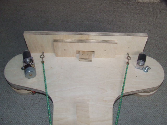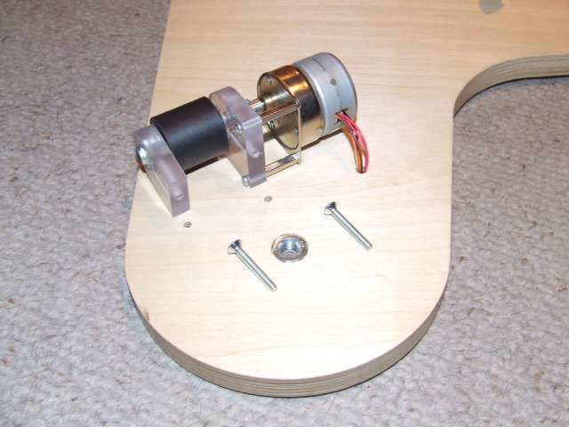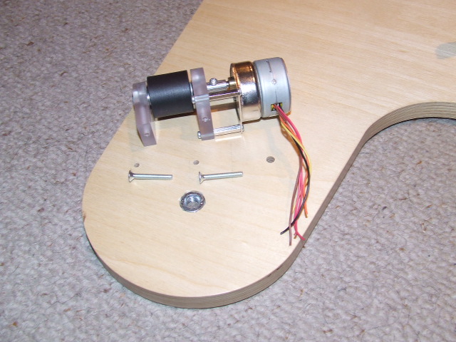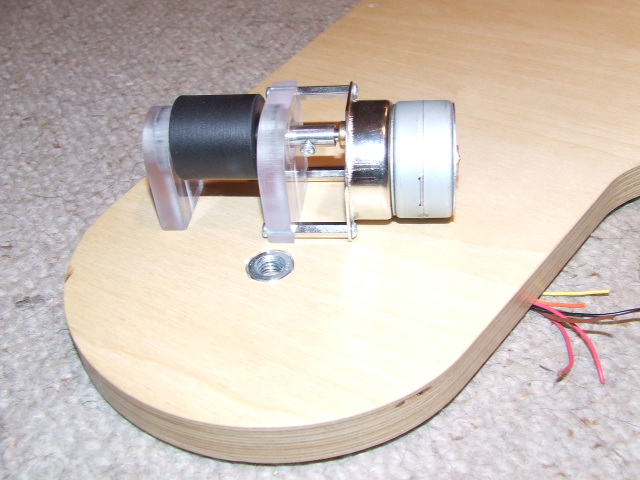 Step 10 - Active roller mountingActive roller (right side of bottom plate) is delivered as already assembled set of parts with bearings, polycarbon supports and stepper motor. Active roller set is mounted similar to the passive roller with two screws from bottom side of plate. Similar to step 9, in this step leg support should be first disasembled and assembled again. The only difference is stepper motor engine cable which must be passed throught hole under engine on bottom side of plate. |