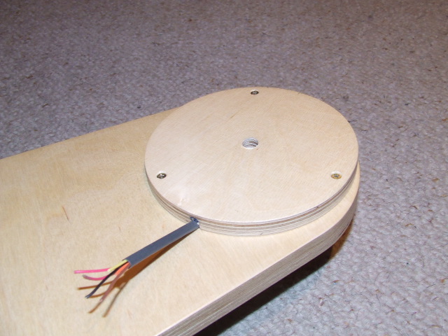 Step 5 - Mounting legs supports on bottom side of bottom plateOn the picture is showed support mounted on south side of platform. The excentric hole shoud be centered just equal to hole for south bearing pivot. To correct mount support use M10 screw inserted in both holes. Leg supports are fastened with three screws. Support behind stepper engine has special route for engine cable so should be fastened with cable holes in the line. |