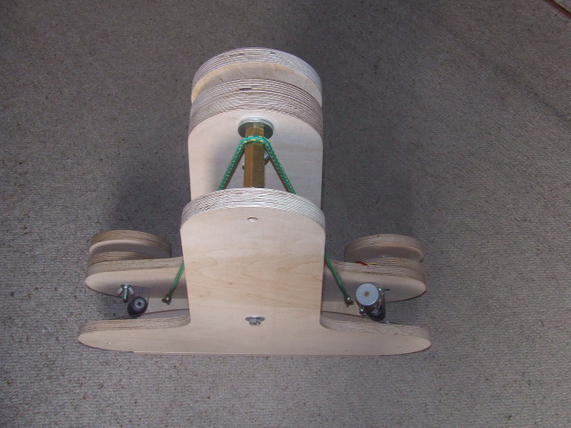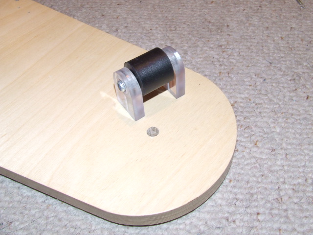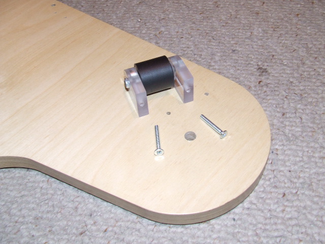 Step 9 - Passive roller mountingPassive roller (left side of bottom plate) is delivered as already assembled set of parts with bearings and polycarbon supports. Passive roller set is mounted with two screws from bottom side of bottom plate. To do it, first should be dissasembled leg support described in step 5. Leg support should be mounted again on place after passive roller mounting. |
