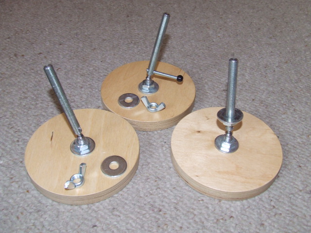Step 3 - Mounting legs Platform standing on 3 playwood legs #18mm. Two of them are regulated and third leg, behind stepper, should be set once according to the local latitude. Every leg has playwood circle, M10 screw with nut and washer. To properly mount leg use universal or M10 key (key nr 17). Screw should be inserted into circle from bigger whole side and nut with washer from another side. Head of the screw should 'dive' in playwood. Additional elements of legs are butterfly nuts and washers which helps to setup legs on right place during platform regulation. |