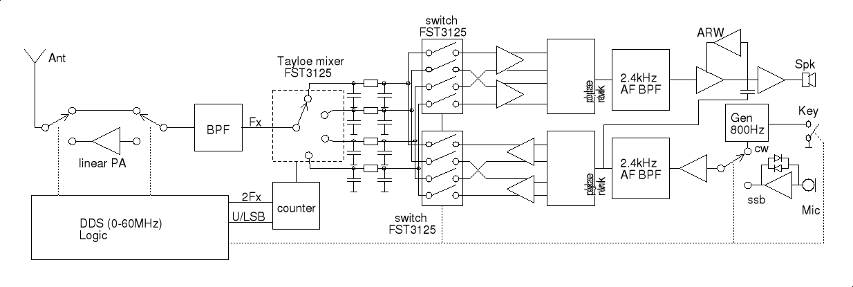 Wykonany przeze mnie transceiver z bezpośrednią przemianą jest wynikiem połączenia kilku sprawdzonych już wcześniej konstrukcji. W zasadzie wzorowałem się na trzech następujących konstrukcjach: - na konstrukcji transceivera Piligrim skąd zaczerpnąłem pomysł podwójnego użycia jako mieszczacza cyfrowego układu FST3125 - na konstrukcji transceivera OH7SV/OH2NLT skąd pochodzi pomysł oddzielenia torów nadawczego i odbiorczego oraz filtr pasmowy m.cz. - na konstrukcji transceivera QRP2004 skąd pochodzi pomysł na dwukrotne obniżenie częstotliwości heterodyny oraz filtry pasmowe w.cz - mój wkład w konstrukcję to układ sterowania mieszczaczem oraz przede wszystkim generator DDS (na AD9835!), który 'zmusiłem' do pracy aż do ponad 30MHz czyli do pasma 14MHz włącznie |