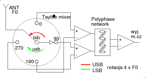 DC01 - zasada działania - przydatne linki źródłowe Układy DC (Direct Conversion - czyli z przemianą bezpośrednią) znane są od dość dawna choć dopiero ostatnio postęp w elektronice oraz technice odbioru spowodowały renesans tej konstrukcji. Wykorzystanie DC można spotkać w różnych wersjach, od konstrukcji czysto amatorskich przez systemy ze szczątkowym torem odbiorczym i obróbką cyfrową sygnału w PC (Software Defined Radio) aż do profesjonalnych rozwiązań w telefonii komórkowej. Ostatnio 'przebojem' w amatorskich rozwiązaniach tego rodzaju jest użycie cyfrowego mieszczacza opatentowanego przez Dan Tayloe. Istotą rozwiązania jest wydzielenie z odbieranego sygnału w.cz składowej m.cz. przez zmieszanie z sygnałem o częstotliwości zbliżonej do częstotliwości w.cz. oraz odpowiednie zsumowanie powstałych produktów przemiany w sposób, który zapewnia efekt sumowania dla jednej ze wstęg oraz odejmowania dla drugiej wstęgi co pozwala na całkowite formowanie sygnału w torach małej częstotliwości. |