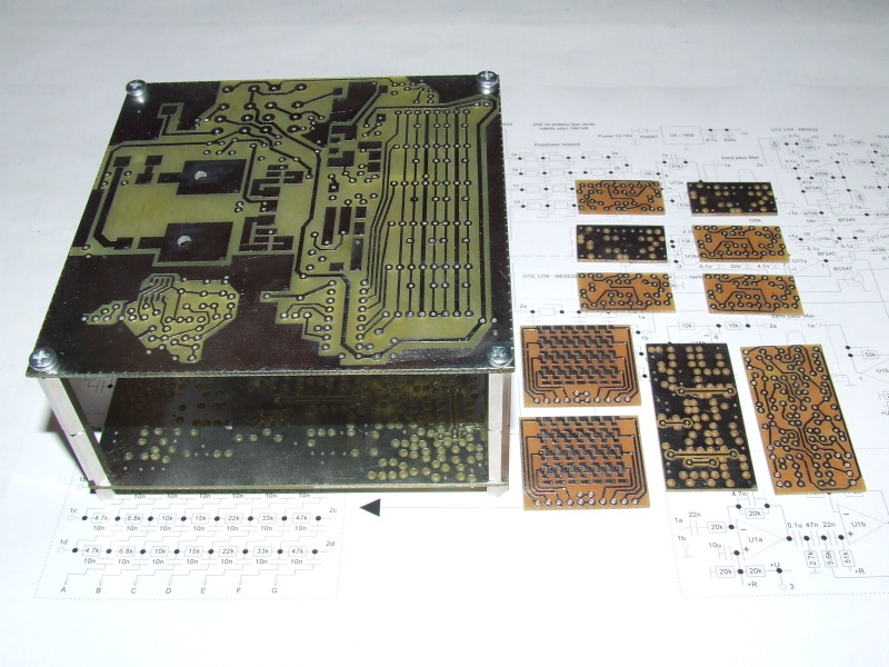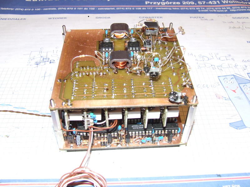 Podstawowy układ transceivera zawierający poza filtrami pasmowymi w.cz. oraz stopniem mocy wszystkie układy zmontowany został na płytce 100/100mm. PA nadajnika oraz filtry pasmowe zamontowane zostały również na płytce 100/100mm w taki sposób, że obie płytki połączone są na rogach za pomocą sześciokątnych tulejek dystansowych o wysokości 40mm a podukłady wzmacniaczy pasmowych m.cz. i w.cz. oraz filtry polifazowe montowane na obu tych płytkach umieszczone są ku środkowi tak powstałej konstrukcji. Obie płytki drukowane są obustronnie miedziowane. Jedna ze stron stanowi płaszczyznę uziemienia co wymaga aby otwory elementów nie łączonych z masą miały wykonane odpowiednie fazowania zapobiegające zwarciom. Całość zamknięta została w seryjnej obudowie 140/70/160mm. |