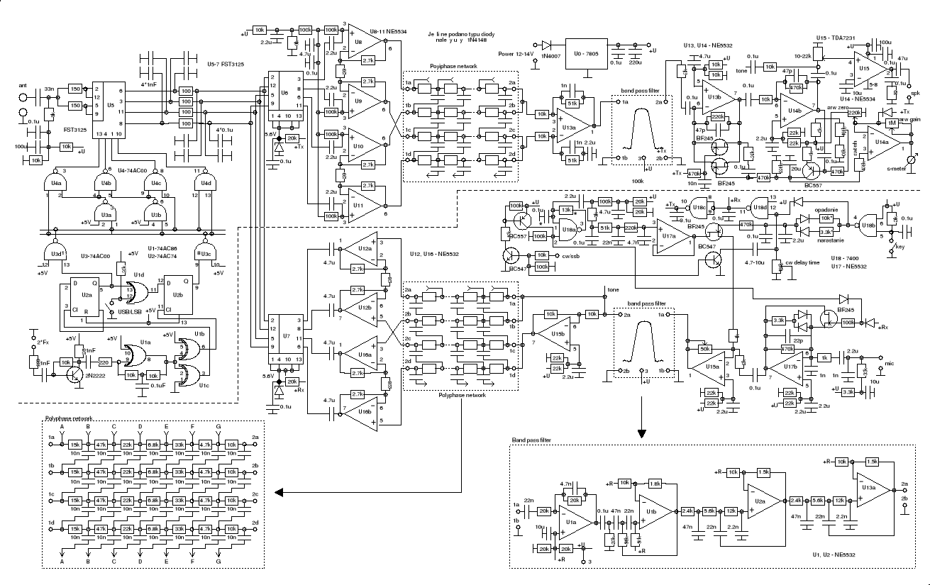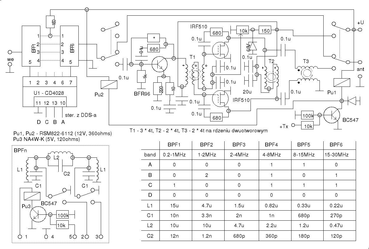 Pomysł na konstrukcję Zainteresowanie konstrukcjami opartymi na zaawansowanej technice DC powstał po zlocie QRP/2009 gdzie miałem możliwość pobieżnie zapoznać się z urządzeniami SDR ale przede wszystkim dowiedzieć się, że istnieją już konstrukcje oparte na mieszaczach cyfrowych z podstawowym formowaniem sygnału w zakresie akustycznym. Przez kilka tygodni pomysł powoli dojrzewał wspomagany studiowaniem istniejących już i opublikowanych konstrukcji by w końcu zmaterializował się w działającym prototypie. Od początku zakładałem, że urządzenie będzie wykorzystywać moją wcześniejszą konstrukcję - Tiny DDS ale ten układ oparty jest na przeciętnym generatorze AD9835 gdzie z trudem osiągałem ok. 20MHz na wyjściu generatora, co przy wymaganiu na 4 krotnie wyższą heterodynę oznaczało tylko możliwość odbioru sygnałów do ok. 5MHz a więc co najwyżej pracę w paśmie 3.5MHz. Tu z pomocą przyszło mi rozwiązanie z transceivera QRP2004 gdzie do przełączania wykorzystuje się oba zbocza sygnału heterodyny co w praktyce oznacza zmniejszenie częstotliwości heterodyny o połowę. Swój układ Tiny DDS zmodyfikowałem również tak, że po użyciu wzorca 64MHz oraz podniesieniu pasma wzmacniacza dla wyższych częstotliwości udało się 'wydusić' z niego sygnał do ok. 32MHz co przekłada się się na pokrycie zakresu pracy transceivera praktycznie od zera do ok. 16MHz. W związku z tym uklad nie posiada przełącznika pasmowego. Po prostu odbiera i nadaje na częstotliwości na jakiej akurat pracuje. Zespół filtrów pasmowych na płytce PA przełączany jest za pomocą dekodera 1 z 10 za pomocą trzech binarnych sygnałów z układu DDS. Przełaczenie następuje przy częstotliwościach: 1MHz, 2MHz, 4MHz, 8MHz oraz 15 MHz. Ten sam binalny sygnał sterujący będzie można wykorzystać również do sterowania np. filtrami wyjściowymi w zewnętrznym wzmacniaczu mocy. Schemat blokowy Schemat blokowy urządzenia zawiera w części odbiorczej zespół filtrów oktawowych BPF przełączanych automatycznie w miarę jak zmienia się częstotliwość pracy, mieszczacz cyfrowy na przełączniku FST3125 sterowany z heterodyny DDS o dwukrotnie większej częstotliwości niż częstotliwość pracy, zespół przełączników FST3125 załączających tor odbiorczy lub nadawczy, filtr polifazowy części odbiorczej, wzmacniacz pasmowy m.cz., stopień ARW oraz wzmacniacz słuchawek/głośnika. W części nadawczej znajduje się elementarna automatyka O/N, wzmacniacz mikrofonowy oraz generator tonu, filtr polifazowy oraz ten sam mieszczacz cyfrowy skąd sygnał w.cz. poddawany jest filtrowaniu we wspólnym filtrze oktawowym oraz wzmocniony we wzmacniaczu aperiodycznym. Moc wyjściowa to ok. 1W w antenie a więc urządzenie w pełni zasługuje na miano QRP. Na schemacie blok DDS oznakowano, że działa w zakresie do 60MHz co zapewniłoby pokrycie wszystkich pasm do 28MHz ale w tej bieżącej realizacji, z układem AD9835, osiągam na razie pasma do 14MHz włącznie. W torze odbiorczym i nadawczym pracują dwa jednakowe stopnie: wzmacniacz pasmowy oraz filtr polifazowy. Zdecydowałem się na takie rozwiązanie świadomie dla zwiększenia czytelności rozwiązania kosztem zwiększenia złożoności układu. Zarówno wzmacniacz pasmowy jak i filtr polifazowy wykonane są na oddzielnych płytkach drukowanych i łatwo mogą być wymienione na pomiędzy sobą jak i na układy o innych parametrach pod warunkiem zachowania zgodności wyprowadzeń co pozwoli na dalsze eksperymentowanie. Filtr pasmowy w.cz. oraz PA nadajnika Na wejściu toru odbiorczego pracują oktawowe filtry pasmowe działające do 30MHz w 6 podzakresach. Wybór odpowiedniego filtra zależy od aktualnej częstotliwości heterodyny i ustawiany jest przez aktywny sygnał z dekodera 1 z 10 (CD4028) sterowanego z logiki układu DDS. W tabeli wyliczone zostały wszystkie elementy pasywne wchodzące w skład każdego z filtrów pasmowych oraz sekwencja sygnałów sterujących umożliwiająca wybór odpowiedniego filtra. Każdy z filtrów wykonany został w postaci oddzielnej płytki a sam filtr aktywowany jest miniaturowym przekaźnikiem. Użycie filtrów oktawowych zapewnia działanie odbiornika zarówno w paśmach amatorskich jak i poza nimi a więc umożliwia pracę w całym zakresie 0-30MHz, niemniej możliwe jest zastosowanie filtrów pasmowych 'przykrojonych' dokładnie do pasm amatorskich co zapewni lepszą separację od sygnałów poza pasmowych. Na tej samej płytce co filtry pasmowe zamontowany został stopień PA nadajnika wykonany jako przedwzmacniacz na tranzystorze BFR96 oraz wzmacniacz przeciwsobny na tranzystorach MOSFET IRF510. Punkt pracy tranzystorów MOSFET ustawia się potencjometrem polaryzującym bramki tranzystorów w taki sposób aby prąd spoczynkowy miał wartość ok. 100-150mA Układ transceivera Większośc podstawowych układów transceivera zamonowanych jest na jednej płytce drukowanej. Dodatkowo, zarówno w torze odbiornika jak i nadajnika zastosowano oddzielne płytki filtra pasmowego m.cz. oraz filtra polifazowego pokazanych na schemacie w formie bloku i w formie rozwiniętej. Przy odbiorze sygnał podawany wprost z anteny (układ może działać bez filtrów wejściowych w.cz. czyli bez jednego obwodu rezonansowego !!!) trafia do cyfrowego mieszacza na układzie FST3125 sterowanego z układu podwajającego częstotliwość z generatora DDS. Zmianę wstęgi odbieranego sygnału umożliwia zmiana kierunku przełączania wyjść mieszacza. Sygnały z mieszacza cyfrowego są wzmacniane za pomocą wzmacniaczy niskoszumnych a następnie po przejściu przez filtr polifazowy sumowane i wzmacniane we wzmacniaczu objętym pętlą ARW z możliwością pomiaru siły sygnału (s-metr). Ostatecznie sygnał użytkowy m.cz. wzmacniany jest w monolitycznym wzmacniaczu m.cz. W torze nadawczym działa układ logiki N/O sterowany za pomocą klucza cw lub przycisku ptt. W zależności od try