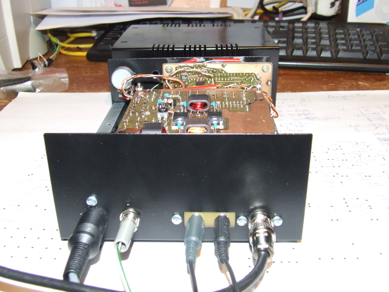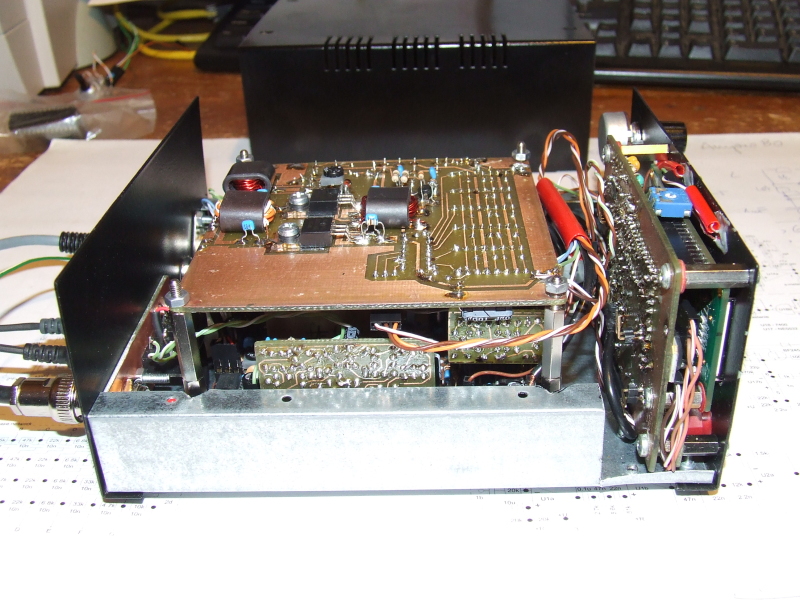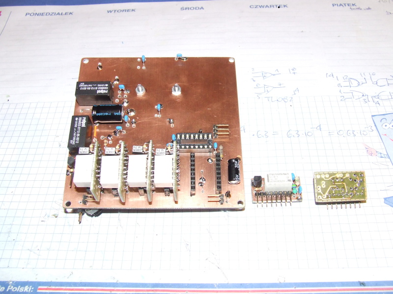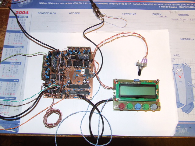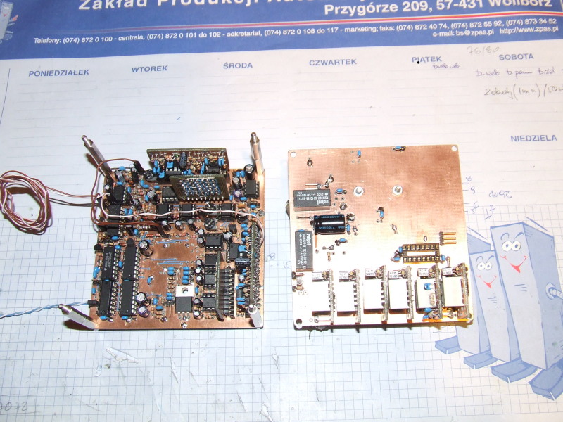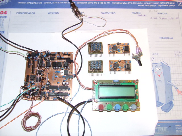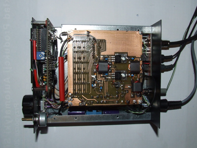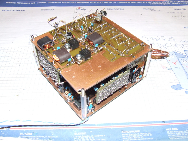 Podstawowa płytka transceivera Początkowo zaprojektowałem i uruchomiłem podstawową płytkę transceivera, którą montowałem kolejno uruchamiając poszczególne stopnie. Płytka ma rozmiary 100/100mm i w rogach ma otwory mocujące wsporniki sześciokątne 40mm, na których powyżej zamontowana jest płytka filtrów pasmowych w.cz. i stopnia mocy nadajnika. Na płytce widać dodatkowe elementy w torze nadawczym i odbiorczym - filtry pasmowe m.cz. oraz filtry polifazowe osadzone na płytce w łączówkach. Podczas uruchomienia wykryłem kilka błędów druku oraz konstrukcyjnych. W szczególności okazało się, że pętla ARW,,mktóra początkowo działała w obrębie jednego wzmacniacza operacyjnego wymaga większego sygnału i obecnie obejmuje dwa kaskadowo połączone ze sobą wzmacniacze. Ostatnie ze zdjęć w tej serii pokazuje odddzielnie moduły wzmacniaczy pasmowych m.cz. oraz filtry polifazowe. Transceiver uruchamiałem korzystając z oryginalnej konstrukcji Tiny DDS jako heterodyny dołączając antenę bezpośrednio do wejścia mieszacza. Efekt jaki uzyskałem przeszedł moje oczekiwania. Okazało się, że bez jednego obwodu rezonansowego da się zrobić odbiornik o całkiem niezłych parametrach. druk trx-a druk bpf m.cz. i w.cz. oraz f. polif. druk pa![]() W plikach pdf znajdują się rysunki płytek drukowanych i montażowe głównej części transceivera oraz wzmacniacza pasmowego m.cz. i filtra polifazowego Płytka filtrów pasmowych w.cz. oraz PA nadajnika Płytka ta ma również rozmiary 100/100mm i wykonana jest w taki sposób, że płytki fitrów pasmowych w.cz skierowane są ku dołowi zapełniając przestrzeń miedzxy obu głównymi płytkami połączonymi tulejkami dystansowymi. Ponieważ większość wymaganych połaczeń zewnętrznych znajduje się na przegach płytek to w ten sposób udało się wykonać konstrukcję w sposób zwarty, o niewielkich rozmiarach. Konstrukcja płytki filtrów pasmowych w.cz. oraz PA nadajnika przewiduje, że filtry w.cz. montowane są do wewnątrz na złączkach a wzmacniacz PA montowany jest na zewnątrz metodą montażu powierzchniowego. Na pokazanych zdjęciach widać, że choć wykonane są wszystkie płytki filtrów pasmowych to nie wszystkie filtry zostały zmontowane. Również elementy dodatkowe w części wzmacniacza PA wskazują, że stan tej części uchwycony został jeszcze w fazie uruchamiania układu. schemat pa i bpf rysunek montażowy pa ![]() W plikach pdf znajdują się rysunki płytek drukowanych i montażowe płytki wzmacniacza mocy i filtrów pasmowych w.cz. oraz filtra pasmowego m.cz. i filtra polifazowego. Obudowa i mechanika Jako obudowę transceivera wykorzystałem seryjnie produkowane pudełko o wymiarach 140/70/160mm zbudowane jako podwójne U. Na płycie przedniej zamontowany został układ DDS oraz pokrętła impulsatora i regulatora wzmocnienia odbiornika. Wolne miejsce na płycie czołowej przeznaczone będzie prawdopodobnie na przełącznik funkcyjny współpracujący z układem DDS lub na regulator pasma przenoszenia wzmacniacza niskiej częstotiwości odbiornika. Ponieważ ten element funkcjonalny nie został jeszcze ostatecznie określony (01-2010) nie mogłem zrobić również odpowiedniej maskownicy płyty przedniej. Na płycie tylnej znajdują się wszystkie gniazda od anteny poczynając przez wejścia klucza i mikrofonu na wyjściu słuchawek/głośnika i gnieździe zasilania kończąc. Na ostatnim zdjęciu górna płytka została odsunięta poza obudowę ukazując płytkę dolną przymocowaną do obudowy. Po tygodniowej przerwie zapadła ostateczna decyzja co do kształtu płyty czołowej. W wolnym miejscu znajdzie się potencjometr regulacji pasma m.cz. na układzie MAX7480, który już zamówiłem. Zrobiłem również generator regulowany potencjometrem, którym sterowane będzie pasmo przenoszenia wzmacniacza dolnoprzepustowego odbiornika. Regulacja pasma działać będzie w zakresie od 600Hz do 2kHz. Dokończyłem również montowanie filtrów pasmowych więc mogłem podłączyć sterowanie nimi z układu DDS-a. Dokonałem również wstępnego przeprogramowania układu Tiny DDS pod kątem pracy w transceiverze DC01. Działa przełączanie rodzaju pracy (CW/SSB), przełączanie odbieranej wstęgi oraz przełączanie filtrów pasmowych w.cz. przy częstotliwościach 1MHz, 2MHz, 4MHz, 8MHz oraz 15MHz. prawdopodobna atrapa urządzenia ![]() ![]() ...a oto atrapa na swoim miejscu, zrobiłem też opis gniazd z tyłu urządzenia ;-) Przy okazji instrukcja jak szybko można zrobić taka atrapę. Trzeba oczywiście zrobić projekt i dać do druku laserowego na samoprzylepnej folii przeźroczystej (koszt strony A4 to ok. 7 PLN). Ja przygotowuję materiał do wydruku jako plik pdf i wtedy nie ma problemu z wydrukiem (przynajmniej tam gdzie robię). Niestety, przeźroczysta folia naklejona na ciemne tło obudowy nie daje właściwego efektu więc najpierw naklejam ją na plastykową okładkę teczki na dokumenty. Taka teczka ma przednią stronę przeźroczystą a więc nie przydatną ale za to strona tylna jest wykonana z litego barwnego plastyku. Kolory najlepiej widać na białym tle więc polecam teczki z okładką w tym kolorze a jeśli dodatkowo mają nieco chropowatą (kropkowaną) fakturę to sytuacja jest idealna bo na mikrokropkach łatwo odprowadzić pęcherze powietrzne spod folii. Teraz rysunek jest ładnie widoczny na białym tle. Następnie podklejam atrapę dwustronną folią do wykładzin podłogowych a w końcowej fazie wykonuję otwory: okrągłe za pomocą korkoborów o odpowiedniej średnicy a prostokątne za pomocą nożyka. Tak przygotowana atrapa jest wodoodporna i średnio wytrzymała mechanicznie. Niemniej na szybki prototyp jak znalazł. 16-02-2010 (postęp prac do tego dnia) Układ regulowanego filtra dolnoprzepustowego został zrobiony i dołączony do systemu na zmodyfikowanej płytce wzmacniacza PA. Układ filtra wtrącony jest w sygnał idący do potencjometru si