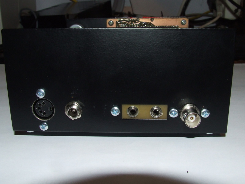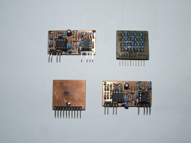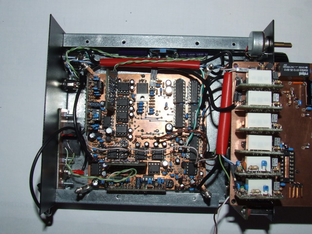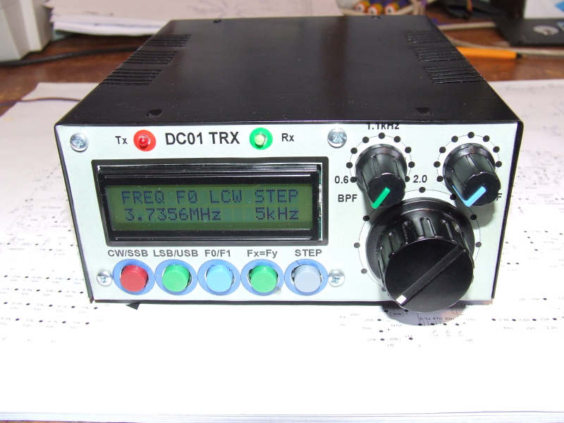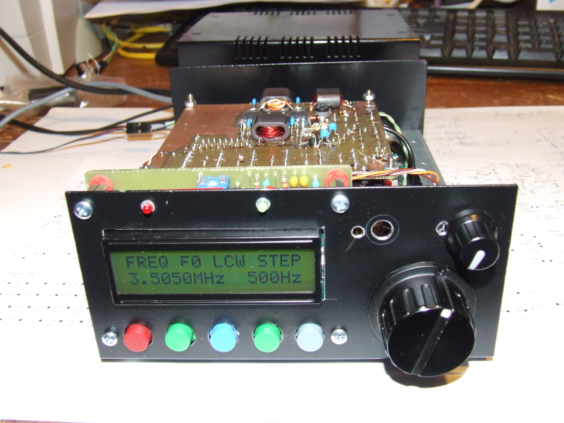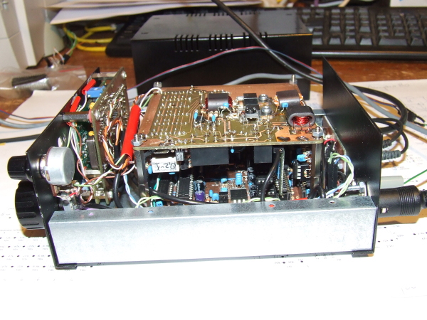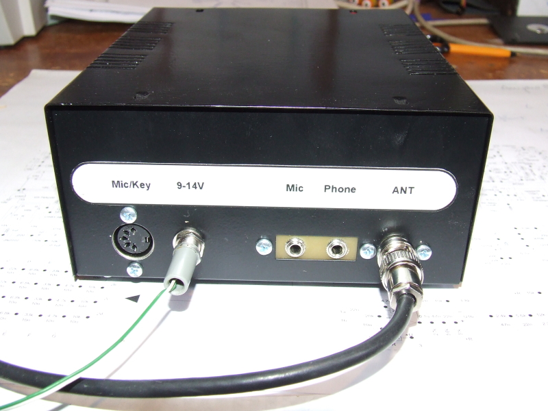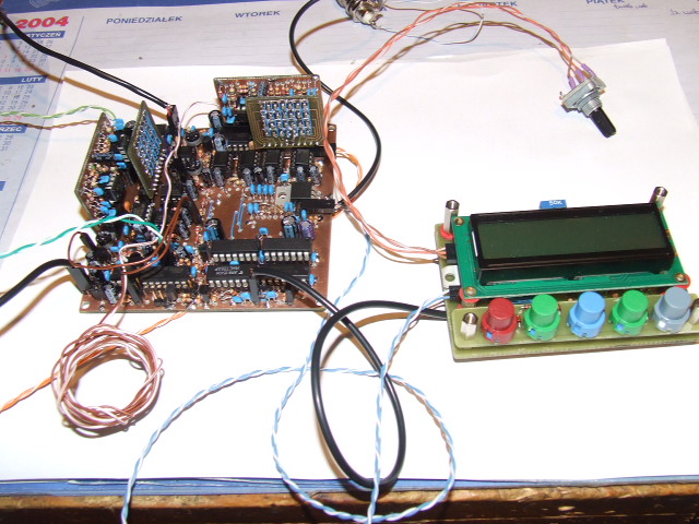 Podstawowa płytka transceivera Początkowo zaprojektowałem i uruchomiłem podstawową płytkę transceivera, którą montowałem kolejno uruchamiając poszczególne stopnie. Płytka ma rozmiary 100/100mm i w rogach ma otwory mocujące wsporniki sześciokątne 40mm, na których powyżej zamontowana jest płytka filtrów pasmowych w.cz. i stopnia mocy nadajnika. Na płytce widać dodatkowe elementy w torze nadawczym i odbiorczym - filtry pasmowe m.cz. oraz filtry polifazowe osadzone na płytce w łączówkach. Podczas uruchomienia wykryłem kilka błędów druku oraz konstrukcyjnych. W szczególności okazało się, że pętla ARW,,mktóra początkowo działała w obrębie jednego wzmacniacza operacyjnego wymaga większego sygnału i obecnie obejmuje dwa kaskadowo połączone ze sobą wzmacniacze. Ostatnie ze zdjęć w tej serii pokazuje odddzielnie moduły wzmacniaczy pasmowych m.cz. oraz filtry polifazowe. Transceiver uruchamiałem korzystając z oryginalnej konstrukcji Tiny DDS jako heterodyny dołączając antenę bezpośrednio do wejścia mieszacza. Efekt jaki uzyskałem przeszedł moje oczekiwania. Okazało się, że bez jednego obwodu rezonansowego da się zrobić odbiornik o całkiem niezłych parametrach. druk trx-a druk bpf m.cz. i w.cz. oraz f. polif. druk pa![]() W plikach pdf znajdują się rysunki płytek drukowanych i montażowe głównej części transceivera oraz wzmacniacza pasmowego m.cz. i filtra polifazowego Płytka filtrów pasmowych w.cz. oraz PA nadajnika Płytka ta ma również rozmiary 100/100mm i wykonana jest w taki sposób, że płytki fitrów pasmowych w.cz skierowane są ku dołowi zapełniając przestrzeń miedzxy obu głównymi płytkami połączonymi tulejkami dystansowymi. Ponieważ większość wymaganych połaczeń zewnętrznych znajduje się na przegach płytek to w ten sposób udało się wykonać konstrukcję w sposób zwarty, o niewielkich rozmiarach. Konstrukcja płytki filtrów pasmowych w.cz. oraz PA nadajnika przewiduje, że filtry w.cz. montowane są do wewnątrz na złączkach a wzmacniacz PA montowany jest na zewnątrz metodą montażu powierzchniowego. Na pokazanych zdjęciach widać, że choć wykonane są wszystkie płytki filtrów pasmowych to nie wszystkie filtry zostały zmontowane. Również elementy dodatkowe w części wzmacniacza PA wskazują, że stan tej części uchwycony został jeszcze w fazie uruchamiania układu. schemat pa i bpf rysunek montażowy pa ![]() W plikach pdf znajdują się rysunki płytek drukowanych i montażowe płytki wzmacniacza mocy i filtrów pasmowych w.cz. oraz filtra pasmowego m.cz. i filtra polifazowego. Obudowa i mechanika Jako obudowę transceivera wykorzystałem seryjnie produkowane pudełko o wymiarach 140/70/160mm zbudowane jako podwójne U. Na płycie przedniej zamontowany został układ DDS oraz pokrętła impulsatora i regulatora wzmocnienia odbiornika. Wolne miejsce na płycie czołowej przeznaczone będzie prawdopodobnie na przełącznik funkcyjny współpracujący z układem DDS lub na regulator pasma przenoszenia wzmacniacza niskiej częstotiwości odbiornika. Ponieważ ten element funkcjonalny nie został jeszcze ostatecznie określony (01-2010) nie mogłem zrobić również odpowiedniej maskownicy płyty przedniej. Na płycie tylnej znajdują się wszystkie gniazda od anteny poczynając przez wejścia klucza i mikrofonu na wyjściu słuchawek/głośnika i gnieździe zasilania kończąc. Na ostatnim zdjęciu górna płytka została odsunięta poza obudowę ukazując płytkę dolną przymocowaną do obudowy. Po tygodniowej przerwie zapadła ostateczna decyzja co do kształtu płyty czołowej. W wolnym miejscu znajdzie się potencjometr regulacji pasma m.cz. na układzie MAX7480, który już zamówiłem. Zrobiłem również generator regulowany potencjometrem, którym sterowane będzie pasmo przenoszenia wzmacniacza dolnoprzepustowego odbiornika. Regulacja pasma działać będzie w zakresie od 600Hz do 2kHz. Dokończyłem również montowanie filtrów pasmowych więc mogłem podłączyć sterowanie nimi z układu DDS-a. Dokonałem również wstępnego przeprogramowania układu Tiny DDS pod kątem pracy w transceiverze DC01. Działa przełączanie rodzaju pracy (CW/SSB), przełączanie odbieranej wstęgi oraz przełączanie filtrów pasmowych w.cz. przy częstotliwościach 1MHz, 2MHz, 4MHz, 8MHz oraz 15MHz. prawdopodobna atrapa urządzenia ![]() ![]() ...a oto atrapa na swoim miejscu, zrobiłem też opis gniazd z tyłu urządzenia ;-) Przy okazji instrukcja jak szybko można zrobić taka atrapę. Trzeba oczywiście zrobić projekt i dać do druku laserowego na samoprzylepnej folii przeźroczystej (koszt strony A4 to ok. 7 PLN). Ja przygotowuję materiał do wydruku jako plik pdf i wtedy nie ma problemu z wydrukiem (przynajmniej tam gdzie robię). Niestety, przeźroczysta folia naklejona na ciemne tło obudowy nie daje właściwego efektu więc najpierw naklejam ją na plastykową okładkę teczki na dokumenty. Taka teczka ma przednią stronę przeźroczystą a więc nie przydatną ale za to strona tylna jest wykonana z litego barwnego plastyku. Kolory najlepiej widać na białym tle więc polecam teczki z okładką w tym kolorze a jeśli dodatkowo mają nieco chropowatą (kropkowaną) fakturę to sytuacja jest idealna bo na mikrokropkach łatwo odprowadzić pęcherze powietrzne spod folii. Teraz rysunek jest ładnie widoczny na białym tle. Następnie podklejam atrapę dwustronną folią do wykładzin podłogowych a w końcowej fazie wykonuję otwory: okrągłe za pomocą korkoborów o odpowiedniej średnicy a prostokątne za pomocą nożyka. Tak przygotowana atrapa jest wodoodporna i średnio wytrzymała mechanicznie. Niemniej na szybki prototyp jak znalazł. 16-02-2010 (postęp prac do tego dnia) Układ regulowanego filtra dolnoprzepustowego został zrobiony i dołączony do systemu na zmodyfikowanej płytce wzmacniacza PA. Układ filtra wtrącony jest w sygnał idący do potencjometru si