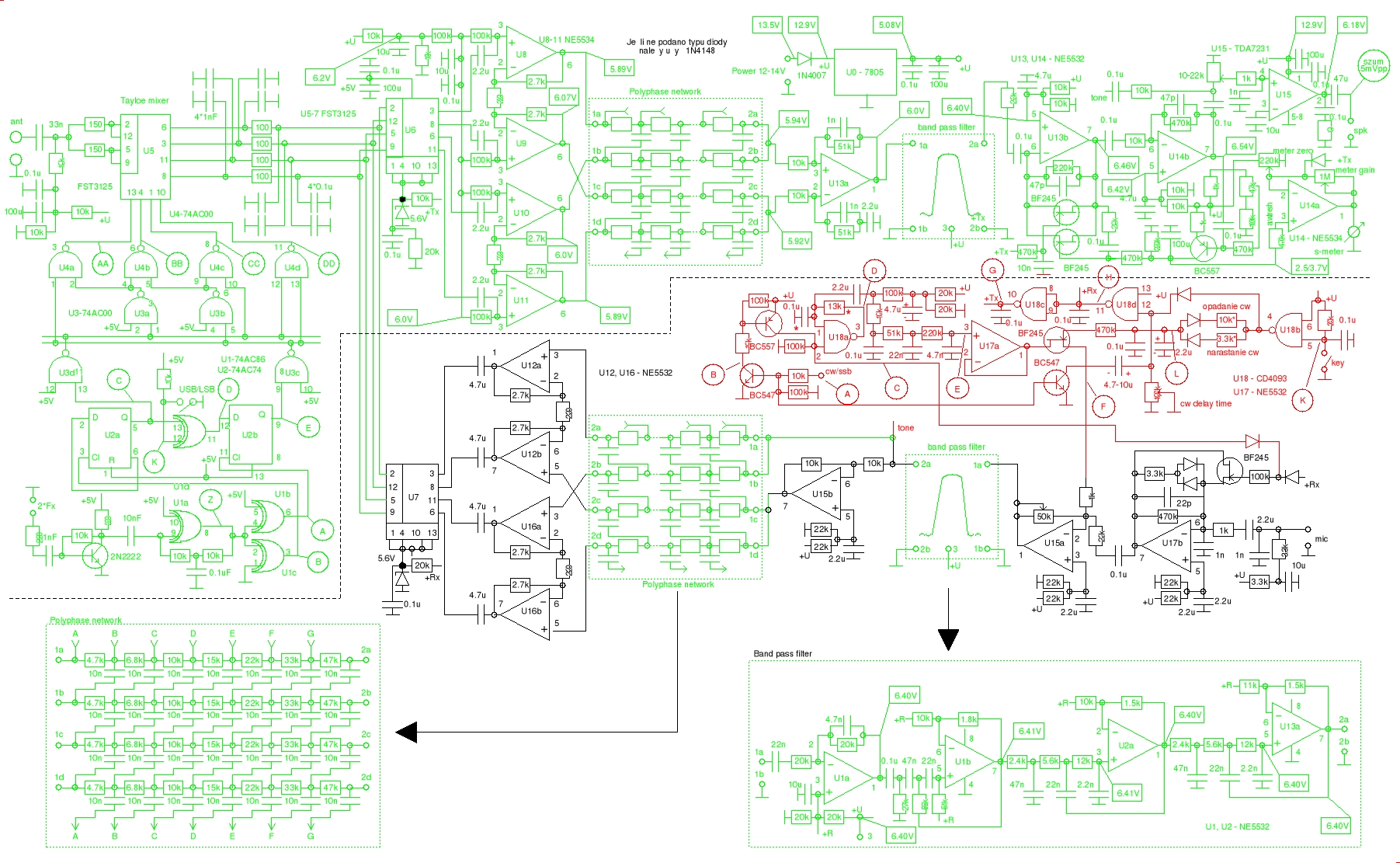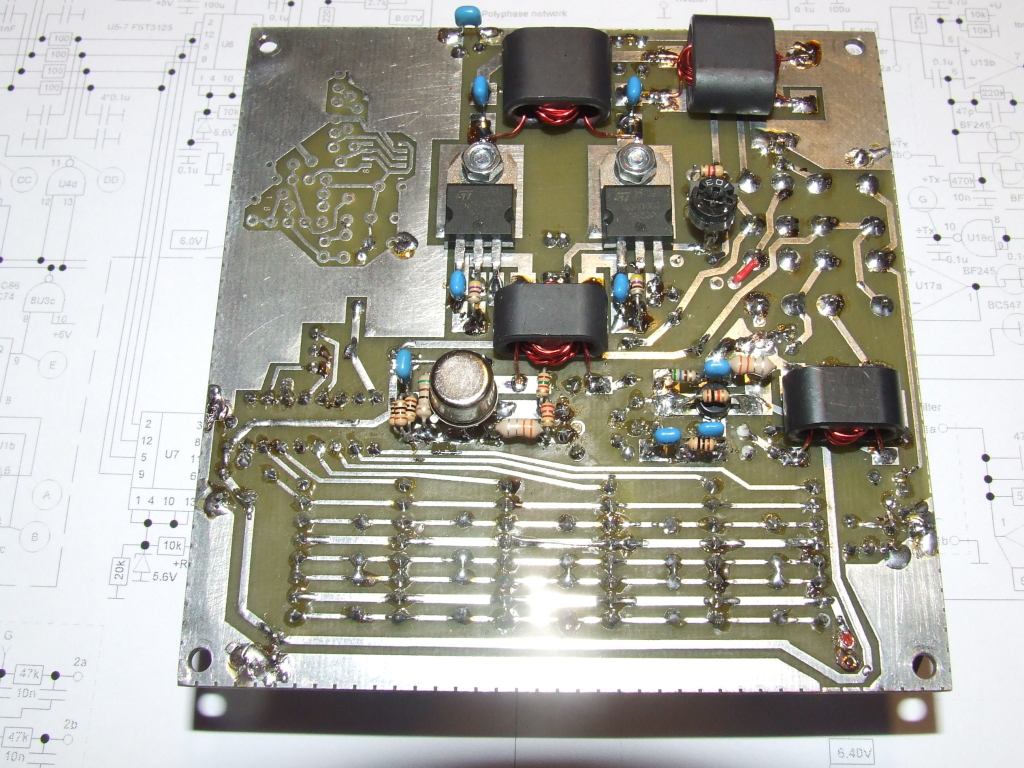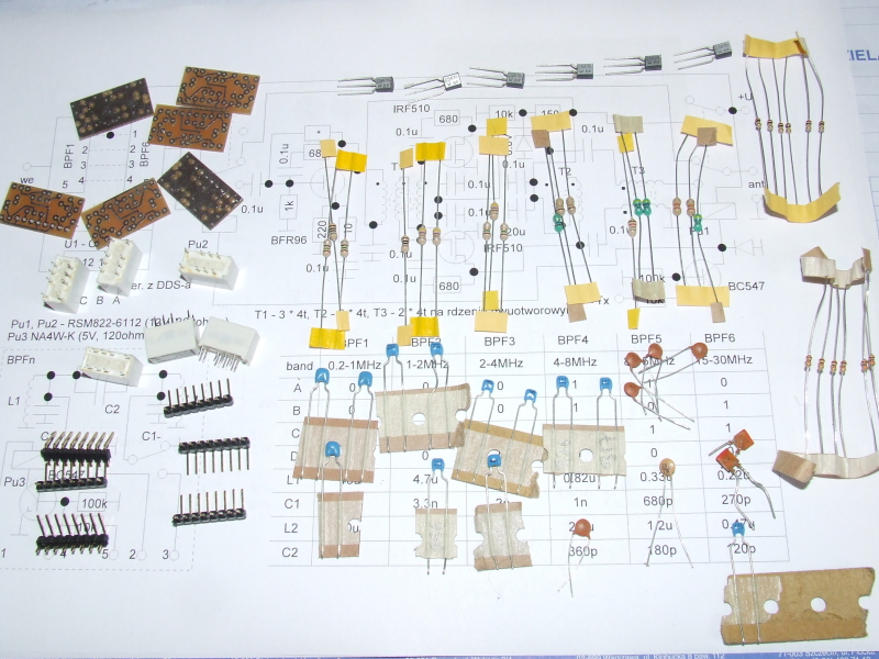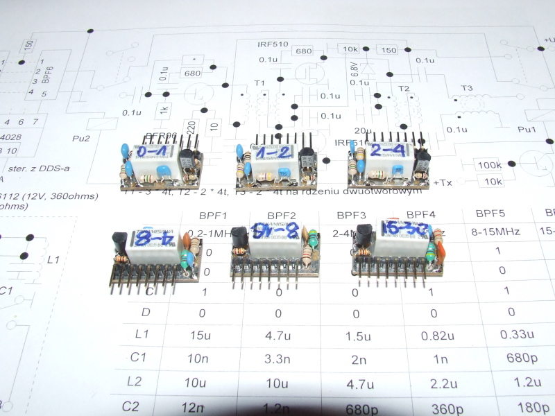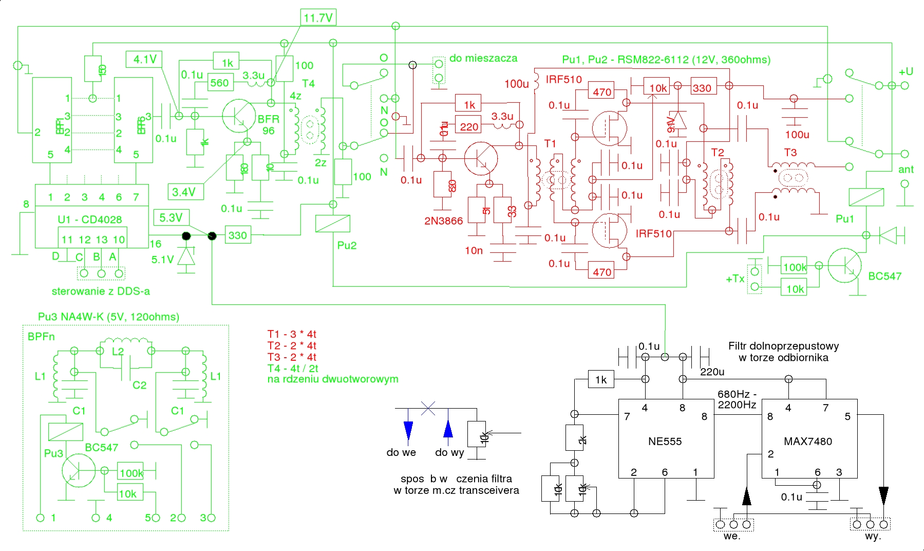 Krok15 - Wzmacniacz mocy nadajnika Nadajnik mieści się na górnej płytce transceivera i w przeważającej części zmontowany jest metodą powierzchniową. Pozwala to na zmianę wartości elementów podczas uruchomienia stopnia mocy.. Wzmacniacz mocy jest dwustopniowy. Sygnał wzmocniony we wspólnym wzmacniaczu z filtrami pasmowymi doprowadzony jest do drivera stopnia mocy na tranzystorze 2N3866. Wzmocnienie tego stopnia regulowane jest przez pętlę sprzężenia C-E z opornikiem 220 omów i dławikiem 3.3uH oraz obwodem RC w emiterze (10nF oraz 3.3 om. Opornik 3.3 ohma został wykonany z trzech oporników 10 omów połączonych równolegle. Właściwy stopień mocy działa na przeciwsobnym wzmacniaczu z tranzystorami mosfet IRF510. Punkt pracy tych tranzystorów ustawiony jest za pomocą potencjometru 10k w taki sposób aby prąd spoczynkowy miał wartość 50-80mA. Takie warunki można ustawić mierząc prąd jaki pobiera cały trx podczas nadawania regulując prąd startując od położenia suwaka potencjometru w pobliżu uziemionego końca kiedy stopień mocy jest zablokowany. Stabilność pracy wzmacniacza końcowego zapewniają obwody RC działające pomiędzy drenem a bramką tranzystorów. Transformator Tr2 zasila stopień mocy a Tr3 służy do odprowadzenia mocy w.cz. Nawijając transformatory należy zwrócić uwagę na sposób połączenia uzwojeń sygnalizowany na schemacie kropką przy początku każdego uzwojenia. Ostatnie zdjęcie pokazuje transceiver zamknięty w obudowie i gotowy do pracy. ![]() cdn... |