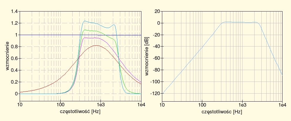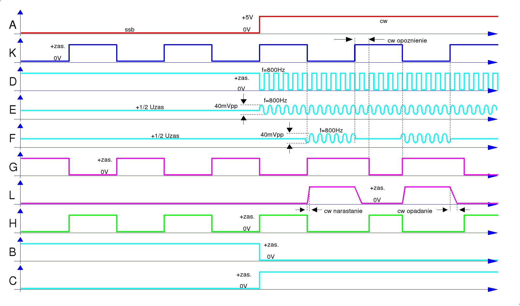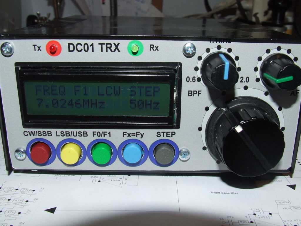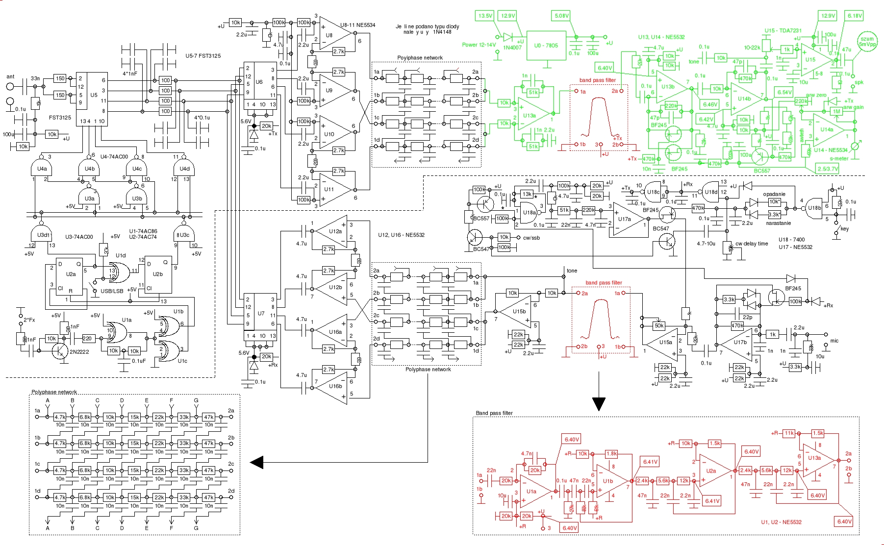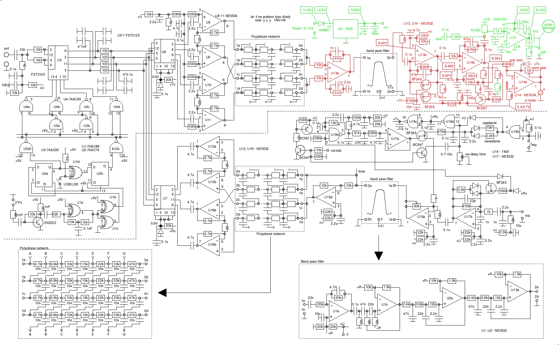 Krok15 - Wzmacniacz mocy nadajnika Nadajnik mieści się na górnej płytce transceivera i w przeważającej części zmontowany jest metodą powierzchniową. Pozwala to na zmianę wartości elementów podczas uruchomienia stopnia mocy.. Wzmacniacz mocy jest dwustopniowy. Sygnał wzmocniony we wspólnym wzmacniaczu z filtrami pasmowymi doprowadzony jest do drivera stopnia mocy na tranzystorze 2N3866. Wzmocnienie tego stopnia regulowane jest przez pętlę sprzężenia C-E z opornikiem 220 omów i dławikiem 3.3uH oraz obwodem RC w emiterze (10nF oraz 3.3 om. Opornik 3.3 ohma został wykonany z trzech oporników 10 omów połączonych równolegle. Właściwy stopień mocy działa na przeciwsobnym wzmacniaczu z tranzystorami mosfet IRF510. Punkt pracy tych tranzystorów ustawiony jest za pomocą potencjometru 10k w taki sposób aby prąd spoczynkowy miał wartość 50-80mA. Takie warunki można ustawić mierząc prąd jaki pobiera cały trx podczas nadawania regulując prąd startując od położenia suwaka potencjometru w pobliżu uziemionego końca kiedy stopień mocy jest zablokowany. Stabilność pracy wzmacniacza końcowego zapewniają obwody RC działające pomiędzy drenem a bramką tranzystorów. Transformator Tr2 zasila stopień mocy a Tr3 służy do odprowadzenia mocy w.cz. Nawijając transformatory należy zwrócić uwagę na sposób połączenia uzwojeń sygnalizowany na schemacie kropką przy początku każdego uzwojenia. Ostatnie zdjęcie pokazuje transceiver zamknięty w obudowie i gotowy do pracy. ![]() cdn... |