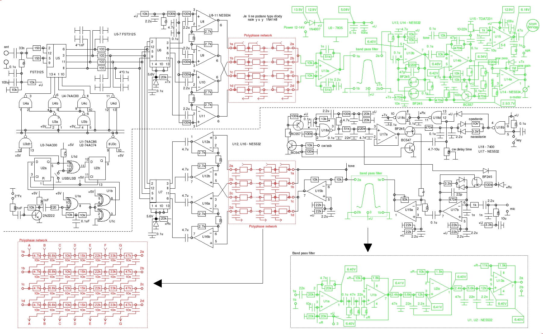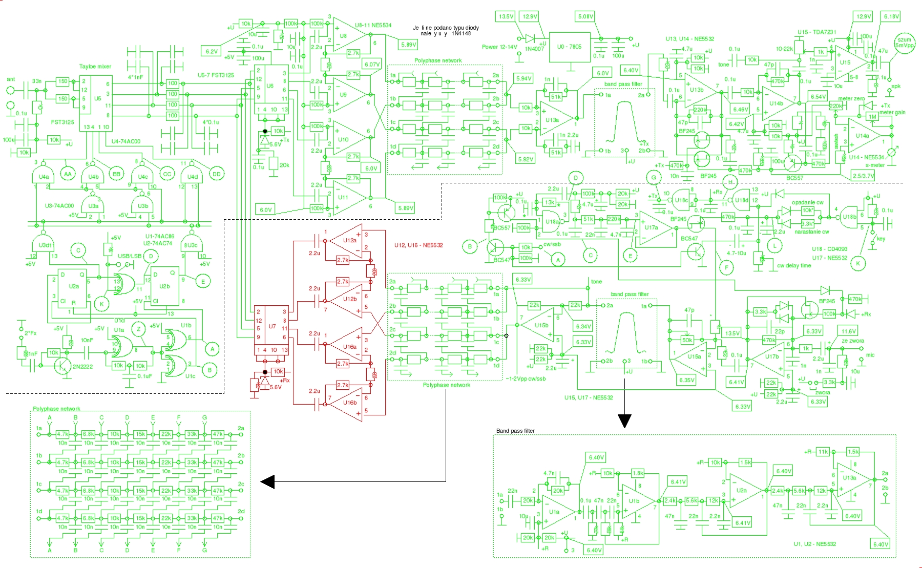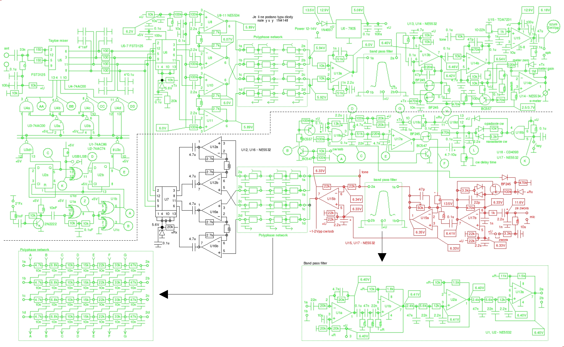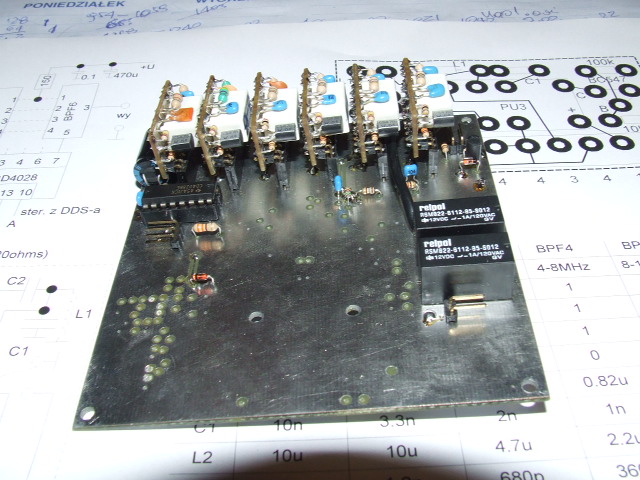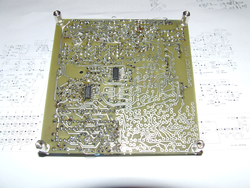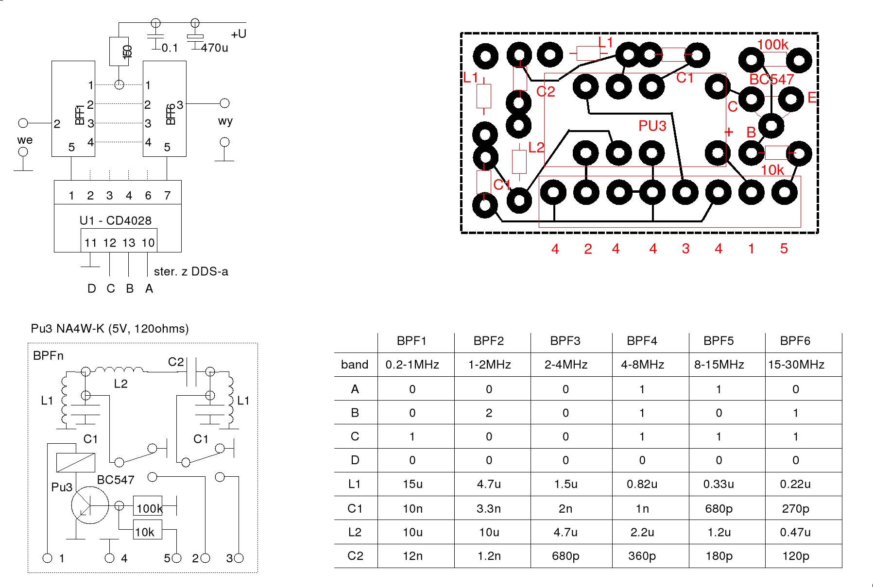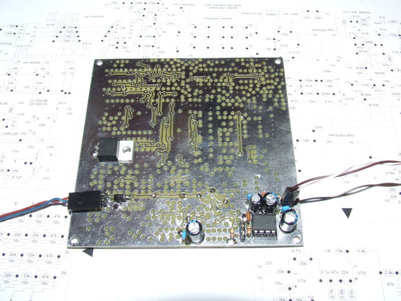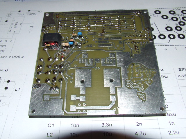 Krok1 - obwody drukowane Jeśli potrafisz sam zrobić obwody drukowane to ich opis znajdziesz w sekcji. prototyp funkcjonalny. Mozna jednak już nabyć gotowy komplet wszystkich płytek, łącznie z płytkami do DDS-a w firmie ZUF w Poznaniu. Komplet płytek do DDS-a to koszt ok. 25 PLN a do transceivera DC01 to koszt ok. 100 PLN. Płytki są jedno i dwustronne, pokryte cyną oraz wiercone. Zamawiając płytki należy podać nazwę DDS oraz DC01. W ostateczności mozna użyć zdjęcia na którym są wszystkie płytki do DC01. Przy zamówieniu należy podac również średnicę otworów. Proponuję podać wartość 0.8mm co pozwoli montować zarówno elementy o typowych rozmiarach jak i np. diodę 1N4007 oraz piny styków. Na zdjęciach pokazane są tylko płytki drukowane do DC01. Na pierwszym zdjęciu widać wszystkie płytki, na drugim sposób zmontowania dwóch głównych płytek (mniejsze płytki znajdą się wewnątrz tej konstrukcji) a na trzecim zdjęciu pokazane są płytki, które będą użyte w pierwszych etapach montażu. Opis płytek do DDS-a znajdziesz w sekcji Tiny DDS. Na początek proponuję montować zgodnie z zaproponowaną kolejnością. Ponieważ nie miałem okazji sprawdzić prawidłowości wykonania płytek to postaram się zamieścić wszystkie uwagi na ten temat więc posuwanie się moim śladem może okazać się najbezpieczniejszą metodą i pozwoli uniknąć moich ewentualnych będów. Na początek ostrzegam, że płytki cynowane, są z jednej strony bardzo wygodne w lutowaniu ale z drugiej strony, z tego samego powodu, bardzo łatwo jest złączyć sąsiednie ścieżki nadmiarem cyny. Należy więc lutować cienkim grotem, najlepiej używając tinolu oraz robić to ostrożnie a w razie zwarcia używać większej ilości kalafonii, która ułatwia rozdzielenie zwarcia. Krok2 - wzmacniacz końcowy m.cz odbiornika Do budowy wzmacniacza użyłem prostego ukladu scalonego TDA 7231 działającego z reguły w sprzęcie przenośnym audio. Uklad świetnie spisuje się ze słuchawkami ale może pracować również z głośnikiem - w tym przypadku lepsze efekty dają głośniki o oporności 8 omów i wyższej. Aktualnie montowane elementy zaznaczał będę na czerwono, elementy już zmontowane będą miały kolor zielony. W węzłowych punktach w prostokątach zaznaczę napięcia zakładając, że zasilam trx z napięcia ok. 13.5V a w kółkach podam wartości zmiennoprądowe odczytane z ekranu oscyloskopu. Pierwszy krok montażowy polega na złożeniu wzmacniacza końcowego m.cz. Na rysunku montazowym zaznaczyłem wszystkie elementy, które należy zamontować, a które czasami nie należą bezpośrednio do montowanego zespołu ale jak w tym przypadku opornik 100k. stanowią połączenie do masy minusa kondensatora 100uF. Grubszą czerowna linią zaznaczam połączenia w ciągu których znajdują się połączenia przewlekane prowadzone z obu stron płytki. W pierwszym kroku montażu należy zamontować również diodę szeregową 1N4007, stabilizator 7805 oraz piny służące do podłączenia zasilania co przyda się oczywiście w dalszej pracy. Na pierwszym zdjęciu widać wszystkie elementy (zwracam uwagę na zagięcie wyprowadzeń 7805 tuż przy samej obudowie pod kątem prostym) a na drugim zmontowany już podukład. Przed uruchomieniem zalecam sprawdzenie omomierzem czy oporność pomiędzy katodą diody 1N4007 a masą nie wykazuje zwarcia co mogłoby wskazywać na jakiś generalny błąd w ścieżce zasilania. Jeśli oporność jest większa niż 1k dla obu kierunków pomiaru to można podłączyć napięcie i sprawdzić czy stabilizator pracuje poprawnie a na pinie 1 układu TDA napięcie wynosi prawie 13.5V. Po tej próbie można wstawić w podstawkę układ TDA, dołączyć słuchawki oraz koniecznie potencjometr lub co najmniej opornik o wartości kilku k pomiędzy wejście 4 TDA a masę. Dopiero w takich warunkach poprawnie działający układ będzie miał na wyjściu (wyprowadzenie 2) napięcie w przybliżeniu równe połowie napięcia zasilania (wyprowadzenie 1). Poprawną pracę można zweryfikować także zbliżając rękę do wyprowadzenia 4 układu TDA lub do zewnętrznego krańca potencjometru co powinno wzbudzać dżwięk w słuchawkach. Układ generuje na wyjściu napięcie szumów ok. 5mVpp z obciążeniem słuchawkowym ok. 18 omów. Krok3 - wzmacniacz m.cz/ARW/s-meter W trakcie montażu tego stopnia okazało się, że na płytce odnalazło się kilka błędów w warstwie masy, które oznakowałem czerwonymi kółkami oraz stosownym opisem. W trzech punktach zabrakło podtrawień a w jednym miejscu takie podtrawienie zostało wykonane choć nie powinno być zrobione bo przez to miejsce uziemiany jest styk masy wzmacniacza pasmowego m.cz. Oczywiście tam gdzie brak podtrawień należy otwory sfazować od strony masy wiertłem a tam gdzie podtrawienie zostało omyłkowo wykonane należy dokonać stosownego połączenia z masą (patrz rysunek w formacie pdf!). Zwracam również uwagę na konieczność uziemienia pinów 4 obu układów scalonych. Ponieważ wewnątrz przestrzeni na układy scalone znajdują się montowane elementy to należy używać zamiast tradycyjnych podstawek linijki pinów precyzyjnych. Ten stopień jest z jednej strony dość ważny a z drugiej może sprawiać kłopoty z uruchomieniem. Dodatkowo należy pamiętać, że od układu U13a na lewo schematu patrząc zaczyna się część gdzie należy zadbać o symetrię elementów więc już teraz rezystory 51k, 10k, oraz kondensatory 1n montowane przy U13a powinny być dobierane jako identyczne. Sam układ U13a w tym kroku nie będzie uruchamiany ale ponieważ znajduje się w jednej obudowie z U13b więc i elementy z jego otoczenia warto zamontować teraz. Pierwszym krokiem montażowym powinno być wykonanie połączeń przewlekanych od strony masy. Ta część układu stanowi o wzmocnieniu odbiornika, pełni funkcję automatycznej regulacji wzmocnienia - ARW oraz może sterować w