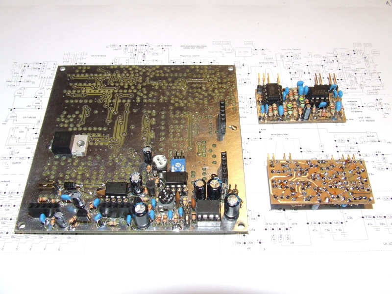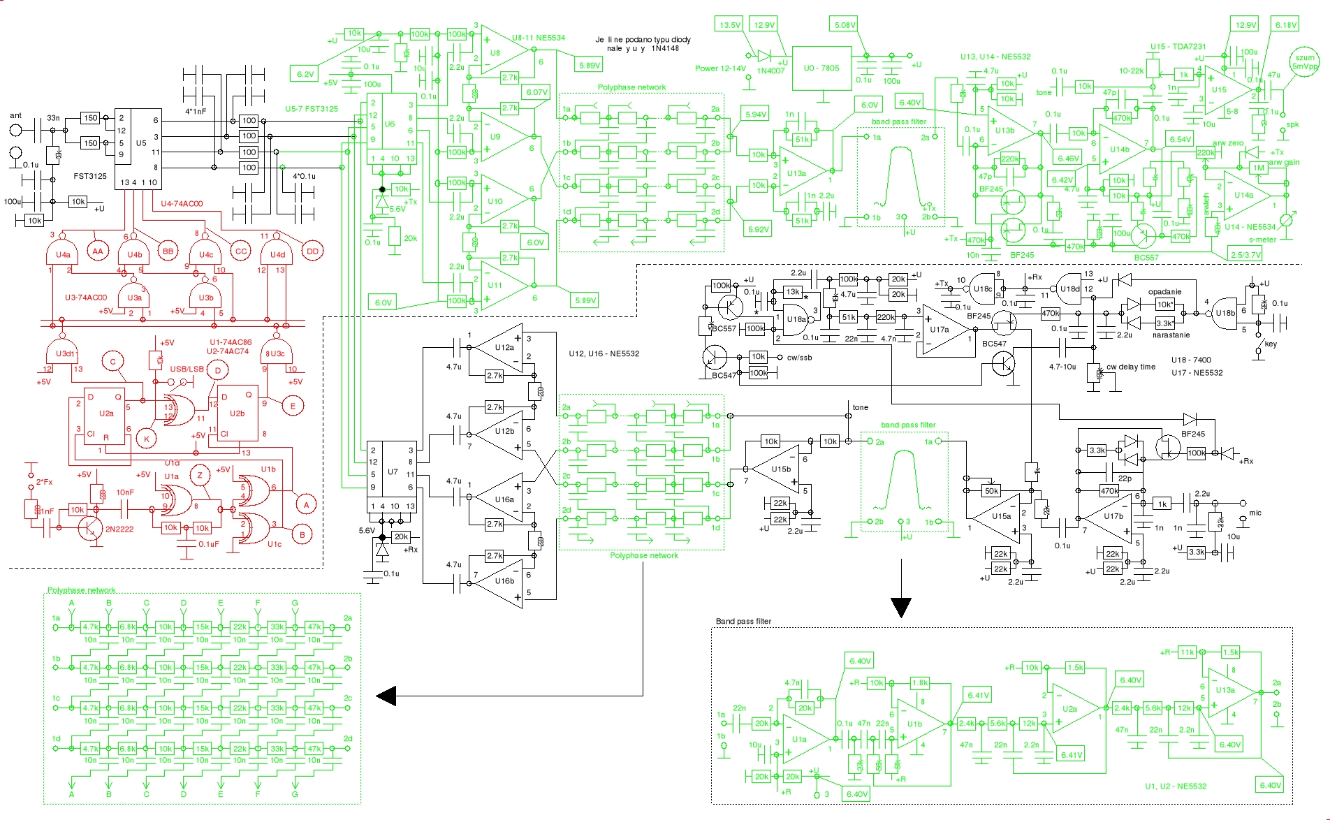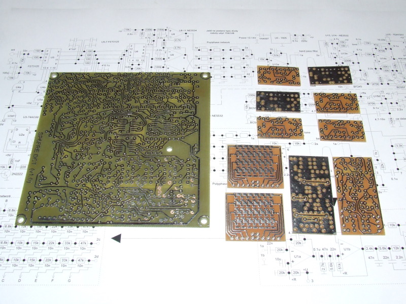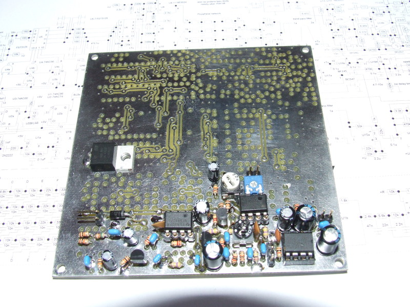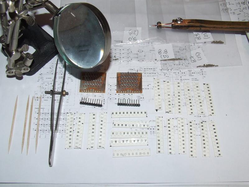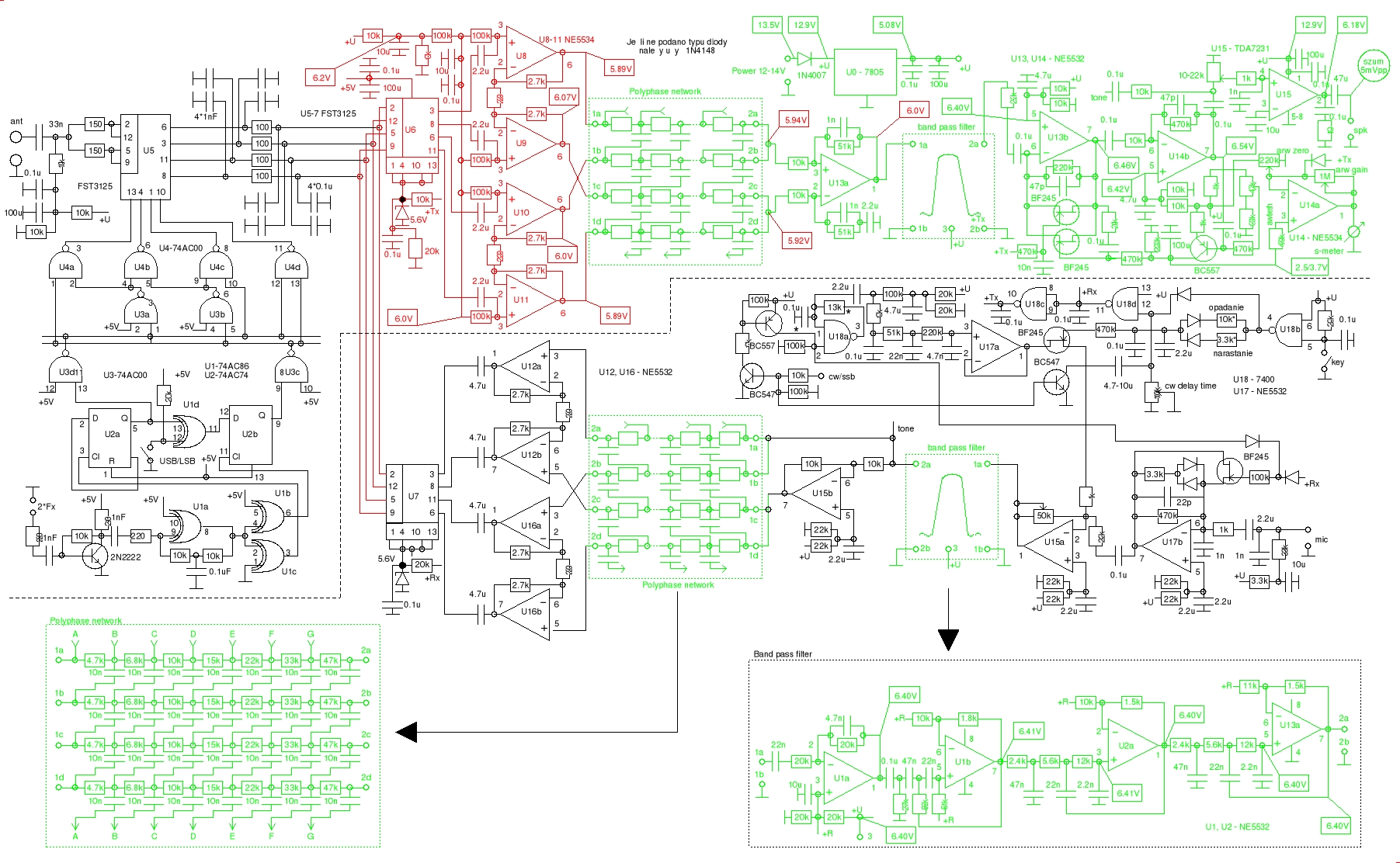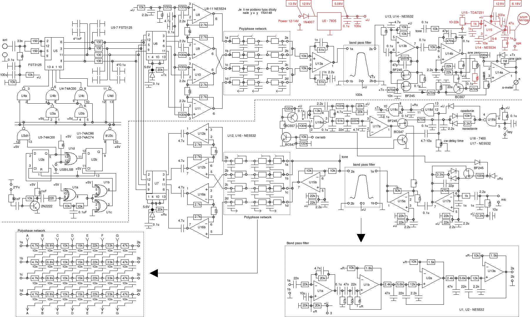 Krok1 - obwody drukowane Jeśli potrafisz sam zrobić obwody drukowane to ich opis znajdziesz w sekcji. prototyp funkcjonalny. Mozna jednak już nabyć gotowy komplet wszystkich płytek, łącznie z płytkami do DDS-a w firmie ZUF w Poznaniu. Komplet płytek do DDS-a to koszt ok. 25 PLN a do transceivera DC01 to koszt ok. 100 PLN. Płytki są jedno i dwustronne, pokryte cyną oraz wiercone. Zamawiając płytki należy podać nazwę DDS oraz DC01. W ostateczności mozna użyć zdjęcia na którym są wszystkie płytki do DC01. Przy zamówieniu należy podac również średnicę otworów. Proponuję podać wartość 0.8mm co pozwoli montować zarówno elementy o typowych rozmiarach jak i np. diodę 1N4007 oraz piny styków. Na zdjęciach pokazane są tylko płytki drukowane do DC01. Na pierwszym zdjęciu widać wszystkie płytki, na drugim sposób zmontowania dwóch głównych płytek (mniejsze płytki znajdą się wewnątrz tej konstrukcji) a na trzecim zdjęciu pokazane są płytki, które będą użyte w pierwszych etapach montażu. Opis płytek do DDS-a znajdziesz w sekcji Tiny DDS. Na początek proponuję montować zgodnie z zaproponowaną kolejnością. Ponieważ nie miałem okazji sprawdzić prawidłowości wykonania płytek to postaram się zamieścić wszystkie uwagi na ten temat więc posuwanie się moim śladem może okazać się najbezpieczniejszą metodą i pozwoli uniknąć moich ewentualnych będów. Na początek ostrzegam, że płytki cynowane, są z jednej strony bardzo wygodne w lutowaniu ale z drugiej strony, z tego samego powodu, bardzo łatwo jest złączyć sąsiednie ścieżki nadmiarem cyny. Należy więc lutować cienkim grotem, najlepiej używając tinolu oraz robić to ostrożnie a w razie zwarcia używać większej ilości kalafonii, która ułatwia rozdzielenie zwarcia. Krok2 - wzmacniacz końcowy m.cz odbiornika Do budowy wzmacniacza użyłem prostego ukladu scalonego TDA 7231 działającego z reguły w sprzęcie przenośnym audio. Uklad świetnie spisuje się ze słuchawkami ale może pracować również z głośnikiem - w tym przypadku lepsze efekty dają głośniki o oporności 8 omów i wyższej. Aktualnie montowane elementy zaznaczał będę na czerwono, elementy już zmontowane będą miały kolor zielony. W węzłowych punktach w prostokątach zaznaczę napięcia zakładając, że zasilam trx z napięcia ok. 13.5V a w kółkach podam wartości zmiennoprądowe odczytane z ekranu oscyloskopu. Pierwszy krok montażowy polega na złożeniu wzmacniacza końcowego m.cz. Na rysunku montazowym zaznaczyłem wszystkie elementy, które należy zamontować, a które czasami nie należą bezpośrednio do montowanego zespołu ale jak w tym przypadku opornik 100k. stanowią połączenie do masy minusa kondensatora 100uF. Grubszą czerowna linią zaznaczam połączenia w ciągu których znajdują się połączenia przewlekane prowadzone z obu stron płytki. W pierwszym kroku montażu należy zamontować również diodę szeregową 1N4007, stabilizator 7805 oraz piny służące do podłączenia zasilania co przyda się oczywiście w dalszej pracy. Na pierwszym zdjęciu widać wszystkie elementy (zwracam uwagę na zagięcie wyprowadzeń 7805 tuż przy samej obudowie pod kątem prostym) a na drugim zmontowany już podukład. Przed uruchomieniem zalecam sprawdzenie omomierzem czy oporność pomiędzy katodą diody 1N4007 a masą nie wykazuje zwarcia co mogłoby wskazywać na jakiś generalny błąd w ścieżce zasilania. Jeśli oporność jest większa niż 1k dla obu kierunków pomiaru to można podłączyć napięcie i sprawdzić czy stabilizator pracuje poprawnie a na pinie 1 układu TDA napięcie wynosi prawie 13.5V. Po tej próbie można wstawić w podstawkę układ TDA, dołączyć słuchawki oraz koniecznie potencjometr lub co najmniej opornik o wartości kilku k pomiędzy wejście 4 TDA a masę. Dopiero w takich warunkach poprawnie działający układ będzie miał na wyjściu (wyprowadzenie 2) napięcie w przybliżeniu równe połowie napięcia zasilania (wyprowadzenie 1). Poprawną pracę można zweryfikować także zbliżając rękę do wyprowadzenia 4 układu TDA lub do zewnętrznego krańca potencjometru co powinno wzbudzać dżwięk w słuchawkach. Układ generuje na wyjściu napięcie szumów ok. 5mVpp z obciążeniem słuchawkowym ok. 18 omów. Krok3 - wzmacniacz m.cz/ARW/s-meter W trakcie montażu tego stopnia okazało się, że na płytce odnalazło się kilka błędów w warstwie masy, które oznakowałem czerwonymi kółkami oraz stosownym opisem. W trzech punktach zabrakło podtrawień a w jednym miejscu takie podtrawienie zostało wykonane choć nie powinno być zrobione bo przez to miejsce uziemiany jest styk masy wzmacniacza pasmowego m.cz. Oczywiście tam gdzie brak podtrawień należy otwory sfazować od strony masy wiertłem a tam gdzie podtrawienie zostało omyłkowo wykonane należy dokonać stosownego połączenia z masą (patrz rysunek w formacie pdf!). Zwracam również uwagę na konieczność uziemienia pinów 4 obu układów scalonych. Ponieważ wewnątrz przestrzeni na układy scalone znajdują się montowane elementy to należy używać zamiast tradycyjnych podstawek linijki pinów precyzyjnych. Ten stopień jest z jednej strony dość ważny a z drugiej może sprawiać kłopoty z uruchomieniem. Dodatkowo należy pamiętać, że od układu U13a na lewo schematu patrząc zaczyna się część gdzie należy zadbać o symetrię elementów więc już teraz rezystory 51k, 10k, oraz kondensatory 1n montowane przy U13a powinny być dobierane jako identyczne. Sam układ U13a w tym kroku nie będzie uruchamiany ale ponieważ znajduje się w jednej obudowie z U13b więc i elementy z jego otoczenia warto zamontować teraz. Pierwszym krokiem montażowym powinno być wykonanie połączeń przewlekanych od strony masy. Ta część układu stanowi o wzmocnieniu odbiornika, pełni funkcję automatycznej regulacji wzmocnienia - ARW oraz może sterować w