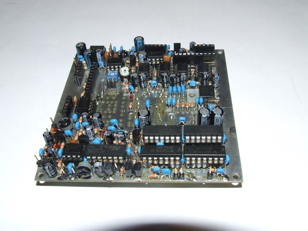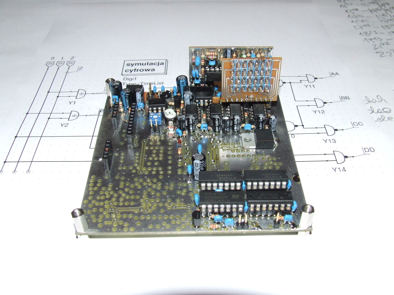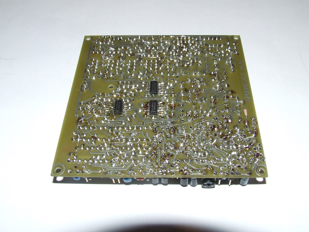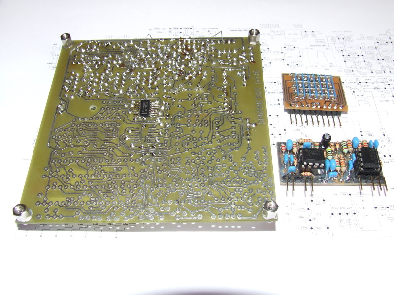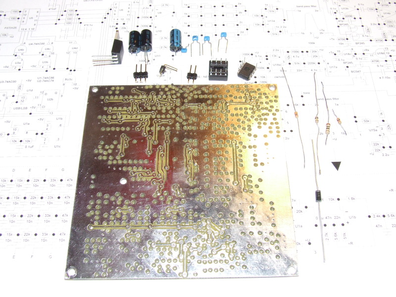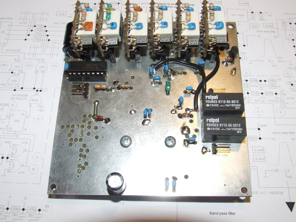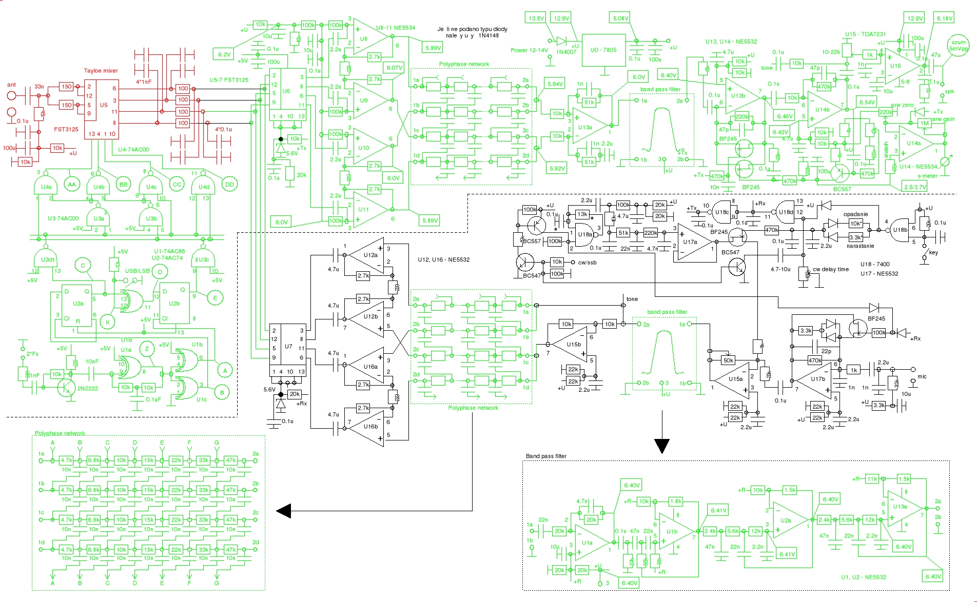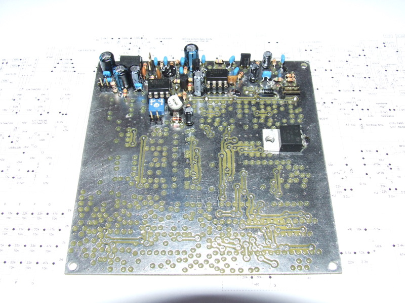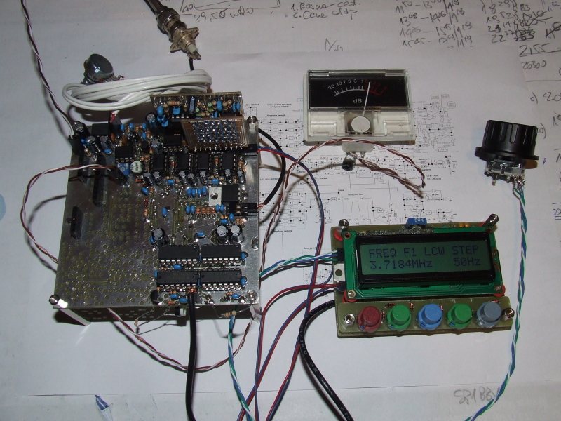 Krok1 - obwody drukowane Jeśli potrafisz sam zrobić obwody drukowane to ich opis znajdziesz w sekcji. prototyp funkcjonalny. Mozna jednak już nabyć gotowy komplet wszystkich płytek, łącznie z płytkami do DDS-a w firmie ZUF w Poznaniu. Komplet płytek do DDS-a to koszt ok. 25 PLN a do transceivera DC01 to koszt ok. 100 PLN. Płytki są jedno i dwustronne, pokryte cyną oraz wiercone. Zamawiając płytki należy podać nazwę DDS oraz DC01. W ostateczności mozna użyć zdjęcia na którym są wszystkie płytki do DC01. Przy zamówieniu należy podac również średnicę otworów. Proponuję podać wartość 0.8mm co pozwoli montować zarówno elementy o typowych rozmiarach jak i np. diodę 1N4007 oraz piny styków. Na zdjęciach pokazane są tylko płytki drukowane do DC01. Na pierwszym zdjęciu widać wszystkie płytki, na drugim sposób zmontowania dwóch głównych płytek (mniejsze płytki znajdą się wewnątrz tej konstrukcji) a na trzecim zdjęciu pokazane są płytki, które będą użyte w pierwszych etapach montażu. Opis płytek do DDS-a znajdziesz w sekcji Tiny DDS. Na początek proponuję montować zgodnie z zaproponowaną kolejnością. Ponieważ nie miałem okazji sprawdzić prawidłowości wykonania płytek to postaram się zamieścić wszystkie uwagi na ten temat więc posuwanie się moim śladem może okazać się najbezpieczniejszą metodą i pozwoli uniknąć moich ewentualnych będów. Na początek ostrzegam, że płytki cynowane, są z jednej strony bardzo wygodne w lutowaniu ale z drugiej strony, z tego samego powodu, bardzo łatwo jest złączyć sąsiednie ścieżki nadmiarem cyny. Należy więc lutować cienkim grotem, najlepiej używając tinolu oraz robić to ostrożnie a w razie zwarcia używać większej ilości kalafonii, która ułatwia rozdzielenie zwarcia. Krok2 - wzmacniacz końcowy m.cz odbiornika Do budowy wzmacniacza użyłem prostego ukladu scalonego TDA 7231 działającego z reguły w sprzęcie przenośnym audio. Uklad świetnie spisuje się ze słuchawkami ale może pracować również z głośnikiem - w tym przypadku lepsze efekty dają głośniki o oporności 8 omów i wyższej. Aktualnie montowane elementy zaznaczał będę na czerwono, elementy już zmontowane będą miały kolor zielony. W węzłowych punktach w prostokątach zaznaczę napięcia zakładając, że zasilam trx z napięcia ok. 13.5V a w kółkach podam wartości zmiennoprądowe odczytane z ekranu oscyloskopu. Pierwszy krok montażowy polega na złożeniu wzmacniacza końcowego m.cz. Na rysunku montazowym zaznaczyłem wszystkie elementy, które należy zamontować, a które czasami nie należą bezpośrednio do montowanego zespołu ale jak w tym przypadku opornik 100k. stanowią połączenie do masy minusa kondensatora 100uF. Grubszą czerowna linią zaznaczam połączenia w ciągu których znajdują się połączenia przewlekane prowadzone z obu stron płytki. W pierwszym kroku montażu należy zamontować również diodę szeregową 1N4007, stabilizator 7805 oraz piny służące do podłączenia zasilania co przyda się oczywiście w dalszej pracy. Na pierwszym zdjęciu widać wszystkie elementy (zwracam uwagę na zagięcie wyprowadzeń 7805 tuż przy samej obudowie pod kątem prostym) a na drugim zmontowany już podukład. Przed uruchomieniem zalecam sprawdzenie omomierzem czy oporność pomiędzy katodą diody 1N4007 a masą nie wykazuje zwarcia co mogłoby wskazywać na jakiś generalny błąd w ścieżce zasilania. Jeśli oporność jest większa niż 1k dla obu kierunków pomiaru to można podłączyć napięcie i sprawdzić czy stabilizator pracuje poprawnie a na pinie 1 układu TDA napięcie wynosi prawie 13.5V. Po tej próbie można wstawić w podstawkę układ TDA, dołączyć słuchawki oraz koniecznie potencjometr lub co najmniej opornik o wartości kilku k pomiędzy wejście 4 TDA a masę. Dopiero w takich warunkach poprawnie działający układ będzie miał na wyjściu (wyprowadzenie 2) napięcie w przybliżeniu równe połowie napięcia zasilania (wyprowadzenie 1). Poprawną pracę można zweryfikować także zbliżając rękę do wyprowadzenia 4 układu TDA lub do zewnętrznego krańca potencjometru co powinno wzbudzać dżwięk w słuchawkach. Układ generuje na wyjściu napięcie szumów ok. 5mVpp z obciążeniem słuchawkowym ok. 18 omów. Krok3 - wzmacniacz m.cz/ARW/s-meter W trakcie montażu tego stopnia okazało się, że na płytce odnalazło się kilka błędów w warstwie masy, które oznakowałem czerwonymi kółkami oraz stosownym opisem. W trzech punktach zabrakło podtrawień a w jednym miejscu takie podtrawienie zostało wykonane choć nie powinno być zrobione bo przez to miejsce uziemiany jest styk masy wzmacniacza pasmowego m.cz. Oczywiście tam gdzie brak podtrawień należy otwory sfazować od strony masy wiertłem a tam gdzie podtrawienie zostało omyłkowo wykonane należy dokonać stosownego połączenia z masą (patrz rysunek w formacie pdf!). Zwracam również uwagę na konieczność uziemienia pinów 4 obu układów scalonych. Ponieważ wewnątrz przestrzeni na układy scalone znajdują się montowane elementy to należy używać zamiast tradycyjnych podstawek linijki pinów precyzyjnych. Ten stopień jest z jednej strony dość ważny a z drugiej może sprawiać kłopoty z uruchomieniem. Dodatkowo należy pamiętać, że od układu U13a na lewo schematu patrząc zaczyna się część gdzie należy zadbać o symetrię elementów więc już teraz rezystory 51k, 10k, oraz kondensatory 1n montowane przy U13a powinny być dobierane jako identyczne. Sam układ U13a w tym kroku nie będzie uruchamiany ale ponieważ znajduje się w jednej obudowie z U13b więc i elementy z jego otoczenia warto zamontować teraz. Pierwszym krokiem montażowym powinno być wykonanie połączeń przewlekanych od strony masy. Ta część układu stanowi o wzmocnieniu odbiornika, pełni funkcję automatycznej regulacji wzmocnienia - ARW oraz może sterować w