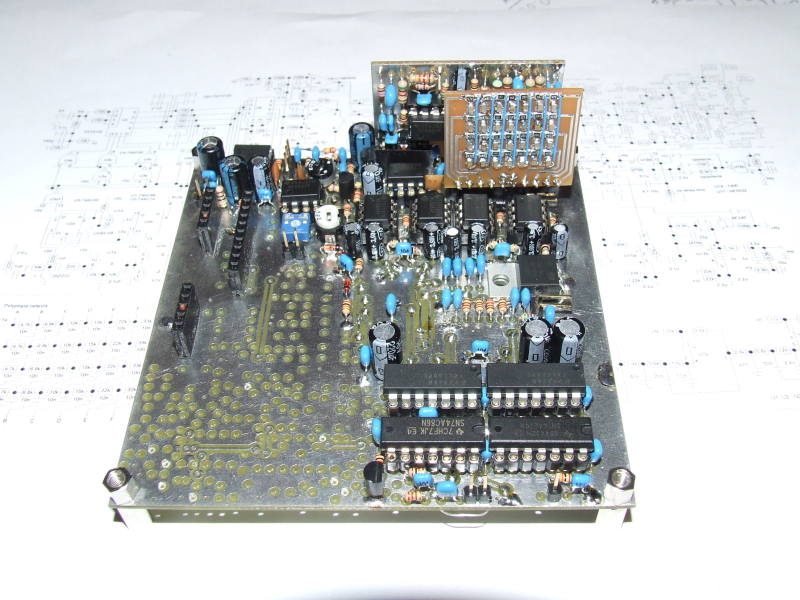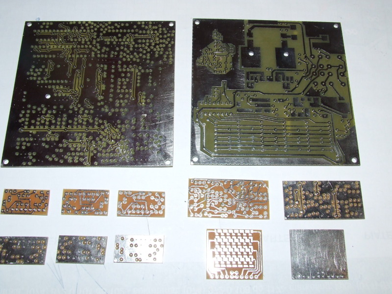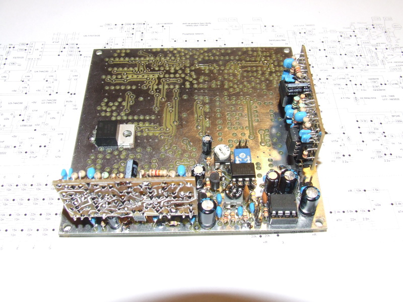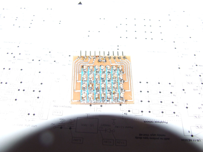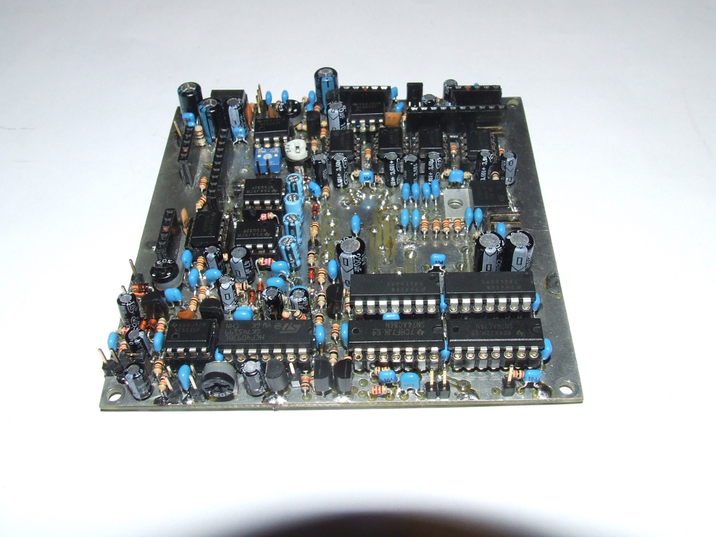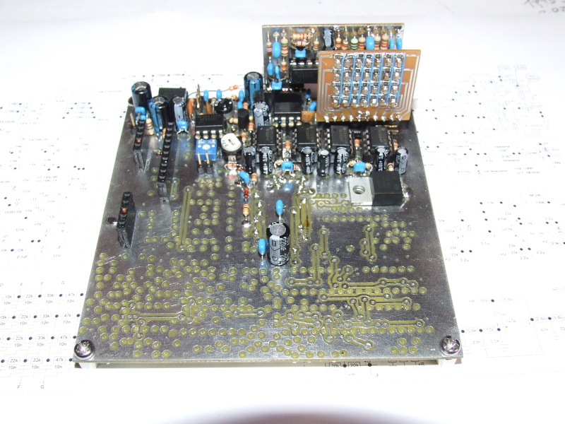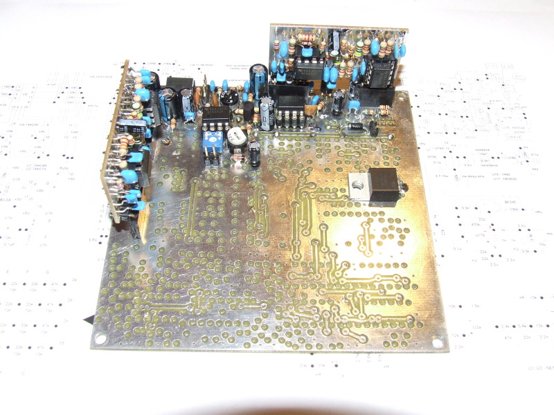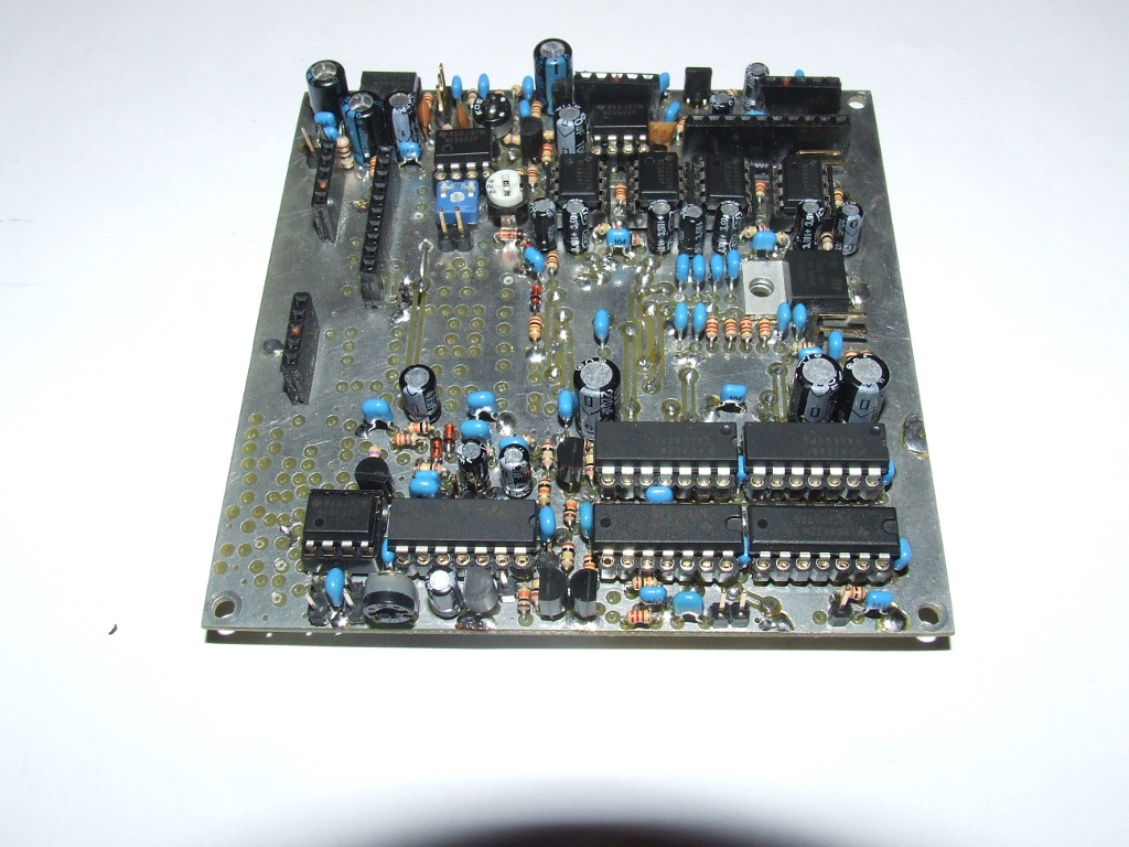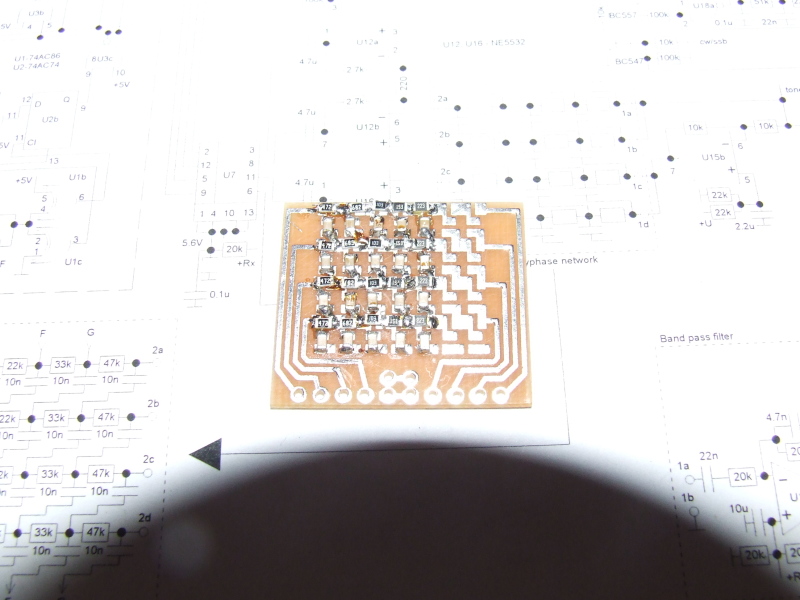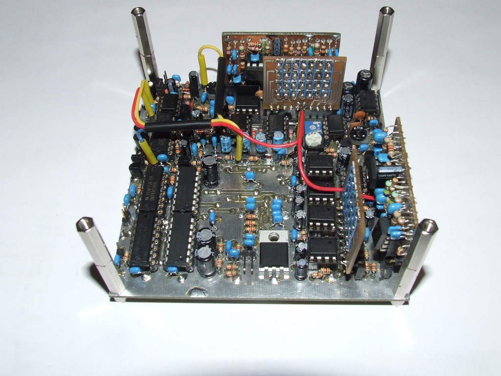 Krok1 - obwody drukowane Jeśli potrafisz sam zrobić obwody drukowane to ich opis znajdziesz w sekcji. prototyp funkcjonalny. Mozna jednak już nabyć gotowy komplet wszystkich płytek, łącznie z płytkami do DDS-a w firmie ZUF w Poznaniu. Komplet płytek do DDS-a to koszt ok. 25 PLN a do transceivera DC01 to koszt ok. 100 PLN. Płytki są jedno i dwustronne, pokryte cyną oraz wiercone. Zamawiając płytki należy podać nazwę DDS oraz DC01. W ostateczności mozna użyć zdjęcia na którym są wszystkie płytki do DC01. Przy zamówieniu należy podac również średnicę otworów. Proponuję podać wartość 0.8mm co pozwoli montować zarówno elementy o typowych rozmiarach jak i np. diodę 1N4007 oraz piny styków. Na zdjęciach pokazane są tylko płytki drukowane do DC01. Na pierwszym zdjęciu widać wszystkie płytki, na drugim sposób zmontowania dwóch głównych płytek (mniejsze płytki znajdą się wewnątrz tej konstrukcji) a na trzecim zdjęciu pokazane są płytki, które będą użyte w pierwszych etapach montażu. Opis płytek do DDS-a znajdziesz w sekcji Tiny DDS. Na początek proponuję montować zgodnie z zaproponowaną kolejnością. Ponieważ nie miałem okazji sprawdzić prawidłowości wykonania płytek to postaram się zamieścić wszystkie uwagi na ten temat więc posuwanie się moim śladem może okazać się najbezpieczniejszą metodą i pozwoli uniknąć moich ewentualnych będów. Na początek ostrzegam, że płytki cynowane, są z jednej strony bardzo wygodne w lutowaniu ale z drugiej strony, z tego samego powodu, bardzo łatwo jest złączyć sąsiednie ścieżki nadmiarem cyny. Należy więc lutować cienkim grotem, najlepiej używając tinolu oraz robić to ostrożnie a w razie zwarcia używać większej ilości kalafonii, która ułatwia rozdzielenie zwarcia. Krok2 - wzmacniacz końcowy m.cz odbiornika Do budowy wzmacniacza użyłem prostego ukladu scalonego TDA 7231 działającego z reguły w sprzęcie przenośnym audio. Uklad świetnie spisuje się ze słuchawkami ale może pracować również z głośnikiem - w tym przypadku lepsze efekty dają głośniki o oporności 8 omów i wyższej. Aktualnie montowane elementy zaznaczał będę na czerwono, elementy już zmontowane będą miały kolor zielony. W węzłowych punktach w prostokątach zaznaczę napięcia zakładając, że zasilam trx z napięcia ok. 13.5V a w kółkach podam wartości zmiennoprądowe odczytane z ekranu oscyloskopu. Pierwszy krok montażowy polega na złożeniu wzmacniacza końcowego m.cz. Na rysunku montazowym zaznaczyłem wszystkie elementy, które należy zamontować, a które czasami nie należą bezpośrednio do montowanego zespołu ale jak w tym przypadku opornik 100k. stanowią połączenie do masy minusa kondensatora 100uF. Grubszą czerowna linią zaznaczam połączenia w ciągu których znajdują się połączenia przewlekane prowadzone z obu stron płytki. W pierwszym kroku montażu należy zamontować również diodę szeregową 1N4007, stabilizator 7805 oraz piny służące do podłączenia zasilania co przyda się oczywiście w dalszej pracy. Na pierwszym zdjęciu widać wszystkie elementy (zwracam uwagę na zagięcie wyprowadzeń 7805 tuż przy samej obudowie pod kątem prostym) a na drugim zmontowany już podukład. Przed uruchomieniem zalecam sprawdzenie omomierzem czy oporność pomiędzy katodą diody 1N4007 a masą nie wykazuje zwarcia co mogłoby wskazywać na jakiś generalny błąd w ścieżce zasilania. Jeśli oporność jest większa niż 1k dla obu kierunków pomiaru to można podłączyć napięcie i sprawdzić czy stabilizator pracuje poprawnie a na pinie 1 układu TDA napięcie wynosi prawie 13.5V. Po tej próbie można wstawić w podstawkę układ TDA, dołączyć słuchawki oraz koniecznie potencjometr lub co najmniej opornik o wartości kilku k pomiędzy wejście 4 TDA a masę. Dopiero w takich warunkach poprawnie działający układ będzie miał na wyjściu (wyprowadzenie 2) napięcie w przybliżeniu równe połowie napięcia zasilania (wyprowadzenie 1). Poprawną pracę można zweryfikować także zbliżając rękę do wyprowadzenia 4 układu TDA lub do zewnętrznego krańca potencjometru co powinno wzbudzać dżwięk w słuchawkach. Układ generuje na wyjściu napięcie szumów ok. 5mVpp z obciążeniem słuchawkowym ok. 18 omów. Krok3 - wzmacniacz m.cz/ARW/s-meter W trakcie montażu tego stopnia okazało się, że na płytce odnalazło się kilka błędów w warstwie masy, które oznakowałem czerwonymi kółkami oraz stosownym opisem. W trzech punktach zabrakło podtrawień a w jednym miejscu takie podtrawienie zostało wykonane choć nie powinno być zrobione bo przez to miejsce uziemiany jest styk masy wzmacniacza pasmowego m.cz. Oczywiście tam gdzie brak podtrawień należy otwory sfazować od strony masy wiertłem a tam gdzie podtrawienie zostało omyłkowo wykonane należy dokonać stosownego połączenia z masą (patrz rysunek w formacie pdf!). Zwracam również uwagę na konieczność uziemienia pinów 4 obu układów scalonych. Ponieważ wewnątrz przestrzeni na układy scalone znajdują się montowane elementy to należy używać zamiast tradycyjnych podstawek linijki pinów precyzyjnych. Ten stopień jest z jednej strony dość ważny a z drugiej może sprawiać kłopoty z uruchomieniem. Dodatkowo należy pamiętać, że od układu U13a na lewo schematu patrząc zaczyna się część gdzie należy zadbać o symetrię elementów więc już teraz rezystory 51k, 10k, oraz kondensatory 1n montowane przy U13a powinny być dobierane jako identyczne. Sam układ U13a w tym kroku nie będzie uruchamiany ale ponieważ znajduje się w jednej obudowie z U13b więc i elementy z jego otoczenia warto zamontować teraz. Pierwszym krokiem montażowym powinno być wykonanie połączeń przewlekanych od strony masy. Ta część układu stanowi o wzmocnieniu odbiornika, pełni funkcję automatycznej regulacji wzmocnienia - ARW oraz może sterować w