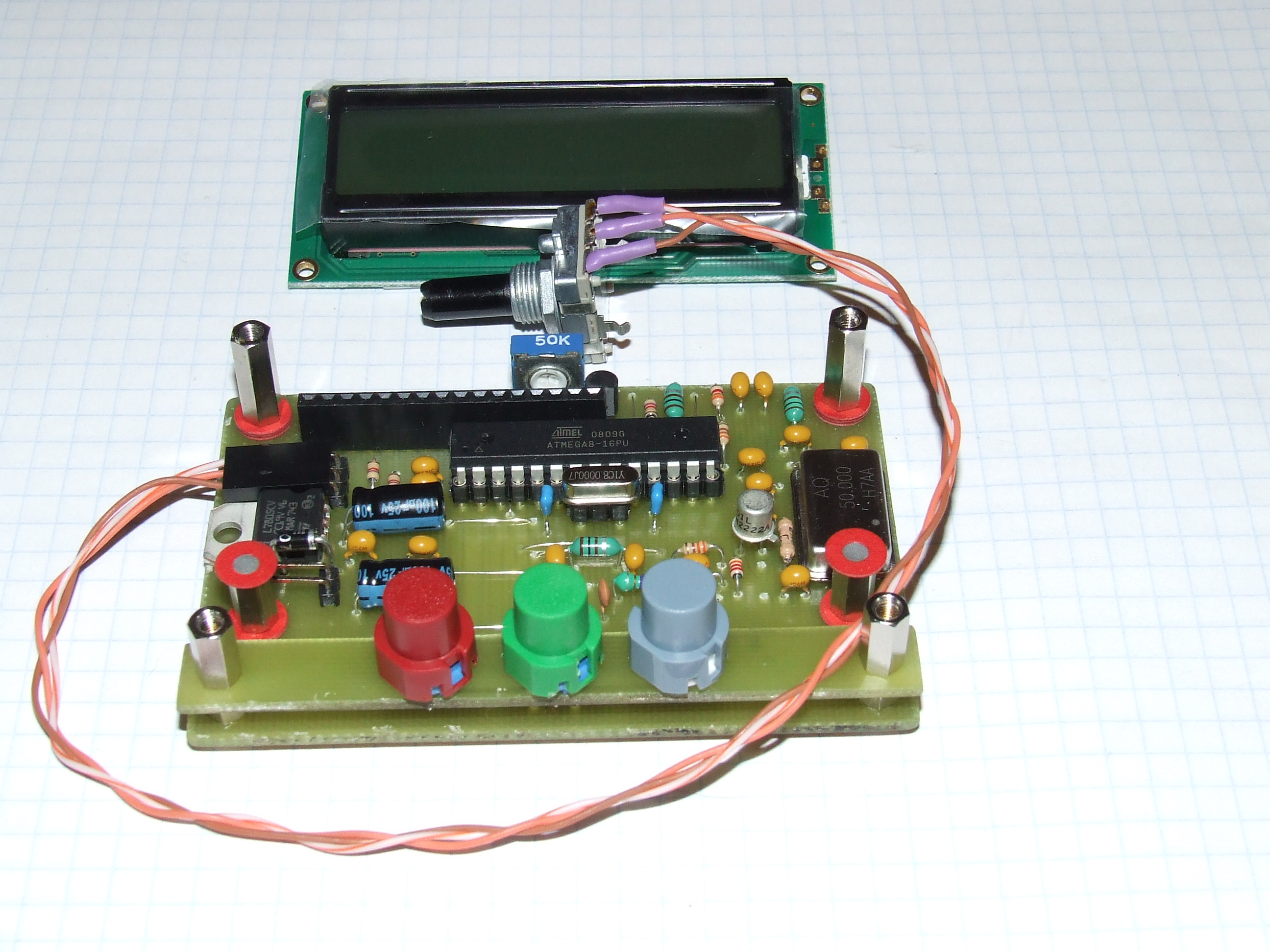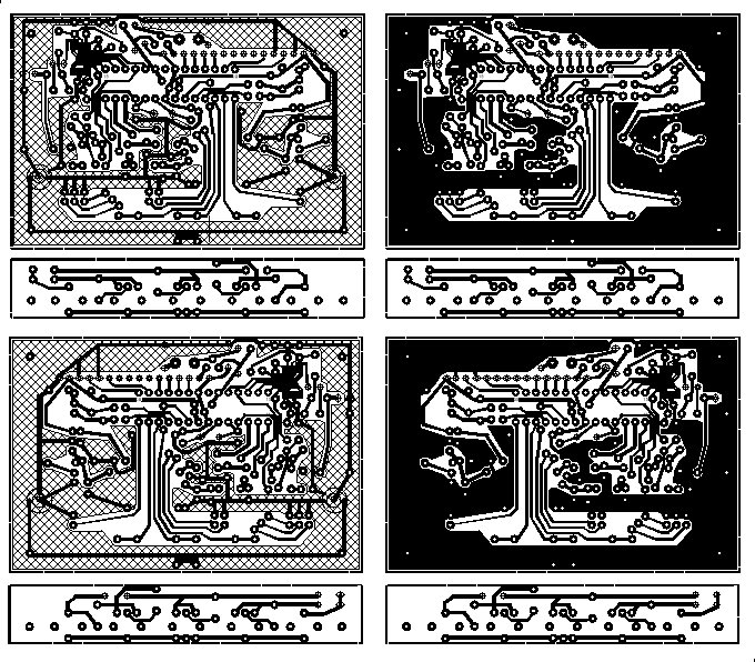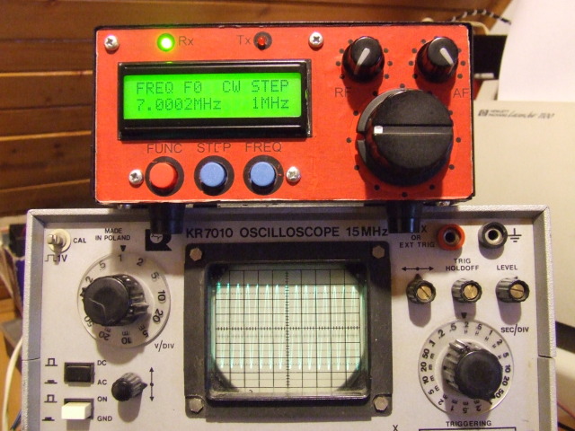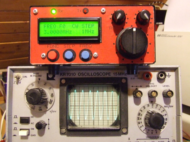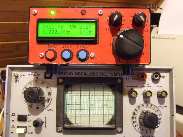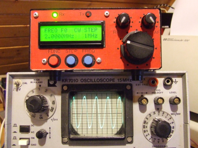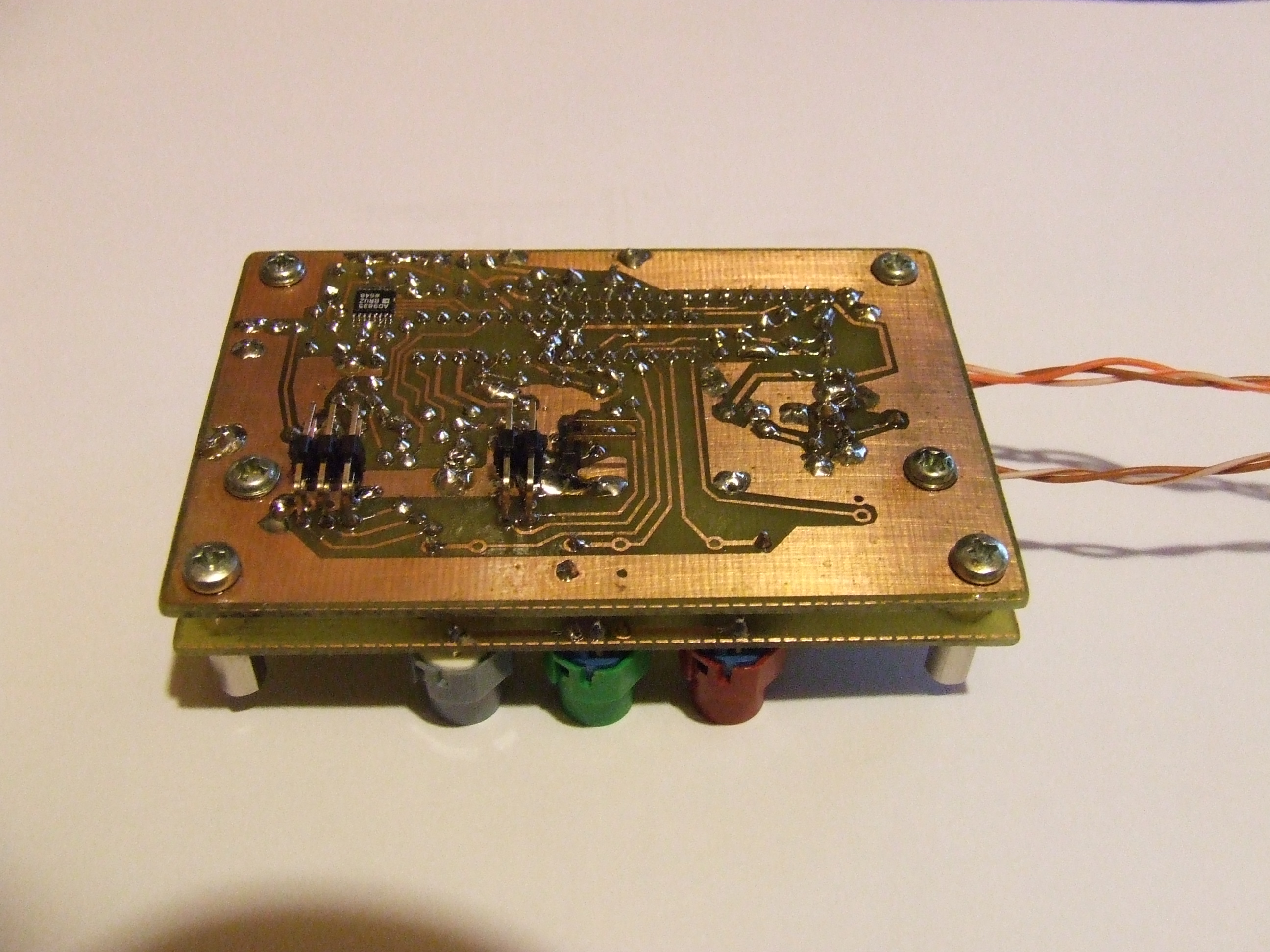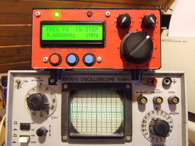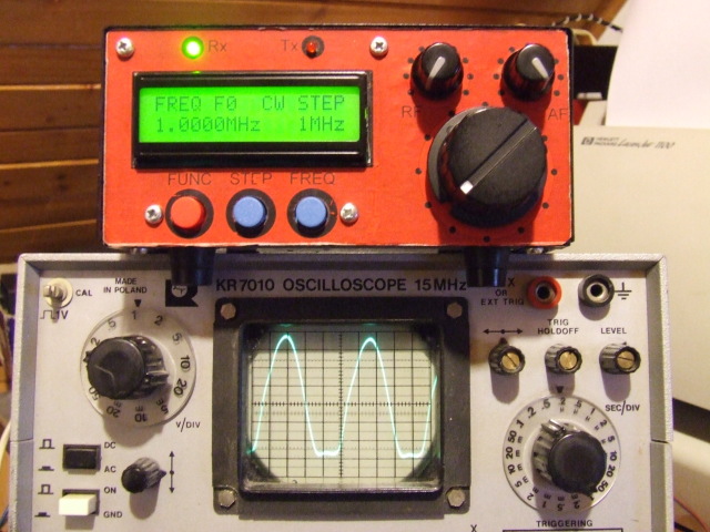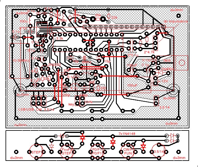 Sercem systemu Tiny DDS jest mikrokontroler AT Mega 8 o pamięci 8kB gdzie umieszczony został kod programu sterującego działaniem układu scalonego DDS i reagujący na zewnętrzne sygnały sterujące od klawiszy funkcyjnych i impulsatora. Dodatkowo, stan urządzenia obserwować można na wyświetlaczu LCD 2*12 z podświetleniem. Jako impulsator zastosowałem tani (9PLN) fabryczny element ELFA (typ 35-847-60) zasilany przez rezystory polaryzujące oraz podłączony do wejść mikrokontrolera przez pojemności separujące. Impulsator pełni oczywiście rolę pokrętła strojenia podczas normalnej pracy ale wykorzystuję go również do ustawiania innych parametrów systemu. Podświetleniem wyświetlacza LCD steruje tranzystor BC557 a regulację jasności zapewnia potencjometr montażowy 25k. Sygnał użyteczny (pin 14 AD9835) wzmocniony jest na tranzystorze 2N2222 w układzie z charakterystyką nieco podniesioną dla wyższych częstotliwości a następnie filtrowany jest w jednostopniowym filtrze dolnoprzepustowym typu pi. Zastosowany generator kwarcowy zapewnia odpowiednią stabilność częstotliwości wyjściowej. Sygnał użyteczny jaki można uzyskać z generatora o częstotliowści F wynosi F/2. ![]() Obwód drukowany jest jednostronny i składa się z dwóch płytek na których montuje się systm DDS oraz klawisze funkcyjne. Impulsator montowany do płyty czołowej urządzenia dołączony jest do systemu DDS za pomocą rozłączanego konektora. Montaż należy rozpocząć od założenia wszystkich zwor. Następnie należy wlutować układ AD9835 co jest najtrudniejszą częścią montażu. Układ ten montowany jest oczywiście od strony druku a zastosowana technika zależy od umiejętności i dostępnych narzędzi. Autor używał do tego celu lutownicy transformatorowej z dokręconą, za pomocą wkrętu M3 ze śrubą, końcówką lutowniczą w formie zaostrzonego drutu miedzianego 1.2mm ze wspomaganiem w postaci silnej lupy oraz imadła, w którym zamocowana została płytka na czas lutowania. Inna zasłyszna technika lutowania takich układów polega na szybkim, jednorazowym przeciągnięciu po wyprowadzeniach, układu ułożonego na płytce drukowanej, rozgrzanej lutownicy z grotem o szerokości umożliwiającej objęcie wielu wyprowadzeń jednocześnie. Technika ta wymaga dobrego oczyszczenia lutowanych powierzchni i wyprowadzeń oraz porządnego pokrycia ich odpowiednim topnikiem. Poza tym wymaga nieco odwagi i zdecydowania. Podobno można nawet w tej technice dojść do wprawy ale autor na razie zamierza pozostać przy swojej prymitywnej ale skutecznej metodzie. ![]() Płytki drukowane wykonane zostały metodą termotransferową z użyciem cienkiego papieru kredowego, drukarki laserowej oraz zwykłego żelazka. Po wytrawieniu należy powierzchnie miedziane dokładnie oczyścić a następnie pokryć topnikiem i wysuszyć je przed wierceniem i montażem. Wiercąc otwory należy pamiętać o 6 otworach M3 w głównej płytce oraz 2 otworach w płytce klawiszy. Otwory te służą do połączenia płytek ze sobą oraz stanowią jednocześnie miejsca gdzie zamontowane zostaną wsporniki układu dystansujące go od płyty czołowej na której będzie zwykle zamontowany oraz ustalające jednakowy poziom wyświetlacza i klawiszy. Pokazane na rysunkach obrazy druku mają rozmiary 1:1 (60/90 mm) i mogą być wykorzystane w metodzie termotransferowej. Rysunki w górnym rzędzie to faktyczny obraz druku a rysunki w dolnym rzędzie to lustrzane odbicia i w zasadzie te rysunki powinny być używane w metodzie termotransferowej. Wszystkie rysunki można również pobrać w formie pliku a rysunek druku również jako Montaż układu należy rozpocząć od wytrawienia płytek drukowanych. Pomimo niewielkich odległości pomiędzy ścieżkami układu AD9835 udaje się to przy zachowaniu minimum staranności. Płytki należy starannie oczyścić po wytrawieniu a następnie należy je pokryć topnikiem i odstawić do wyschnięcia. Kolejną czynnością jest powiercenie płytek z uwzględnieniem otworów 3mm na wsporniki wyświetlacza i mocujące cały układ DDS. Na zdjęciach pokazane zostały wszystkie detale mechaniczne służące do tego celu oraz sposób ich zamocowania i miejsce użycia. Pokazałem również wyświetlacz do którego należy wlutować listwę pinów oraz symetryczną listwę złącza do płytki DDS.. Jako wspornik wyświetlacza użyta jest tulejka sześciokątna 10mm uzupełniona o 3 podkładki (2 na spodzie i jedna doklejona poxipolem od strony wyświetlacza) mająca w sumie 11.5mm. Płytka z klawiszami mocowana jest za pomocą tulejki 5mm do której następnie dołożona jest tulejka 10mm co w sumie daje dystans 16.5mm z płytką klawiszy licząc. Na górze płytki użyte są tulejki dystansowe 15mm uzupełnione do wymiaru 16.5mm o trzy podkładki dystansowe. Większość wkrętów i podkładki pochodzą z zestawów montażowych do PC. Jedynie wkręty mocujące płytkę z klawiszami mają długość 10mm. W ten sposób następuje zrównanie klawiszy z poziomem wyświetlacza a dystans mocowania całej płytki DDS do płytki czołowej umożliwia zamontowanie DDS bez dodatkowego dystansowania. Kolejną czynnością jest założenie wszystkich zwor. W szczególności należy pamiętać o zworze pod podstawką układu mikrokontrolera, która powinna być zakładana przed montażem podstawki. Kolejne zdjęcie pokazuje jak główne elementy układu DDS złozone zostają w kompletny zestaw. Oczywiście można je rozłączyć a nawet należy to zrobić bo montaż nie został jeszcze ukończony. Ostatnie zdjęcie w tej serii pokazuje sprzęt jaki mi służy do lutowania układu AD9835 a jest to kolejna czynność montażowa. Na zdjęciu widać płytkę z nalutowanym już układem, lutownicę z opisaną wcześniej zaostrzoną końcówką lutowniczą wykonaną z drudu miedzianego z jakiego robiony jest grot a także nieodzowną do tego celu lupę. Na zdjęciu nie zmieściło się ty