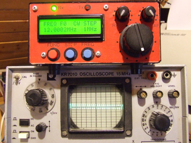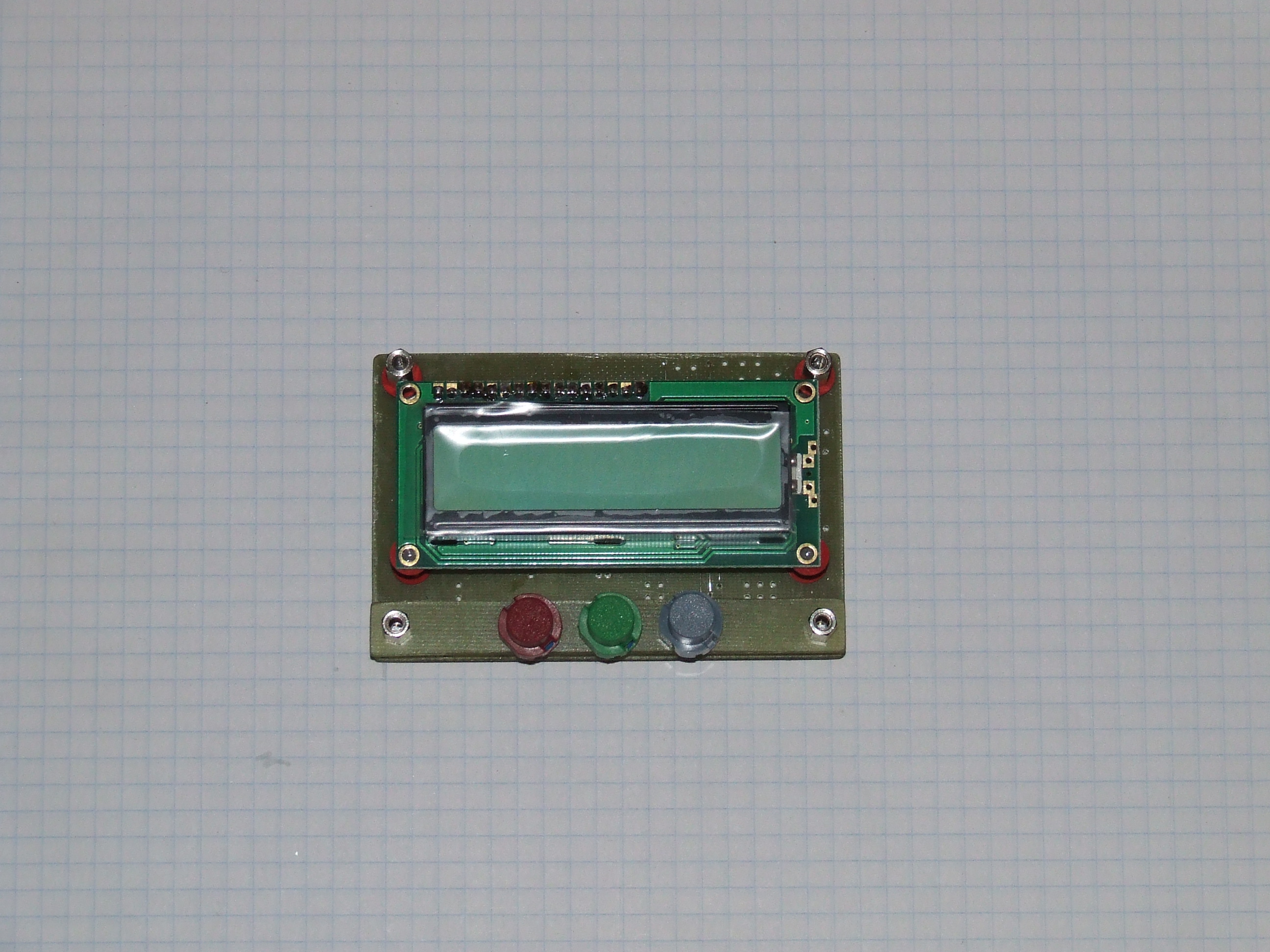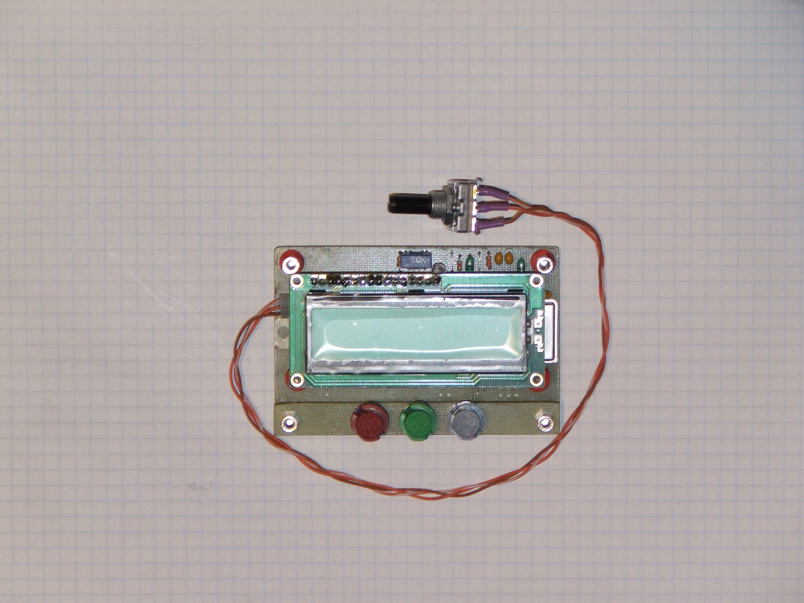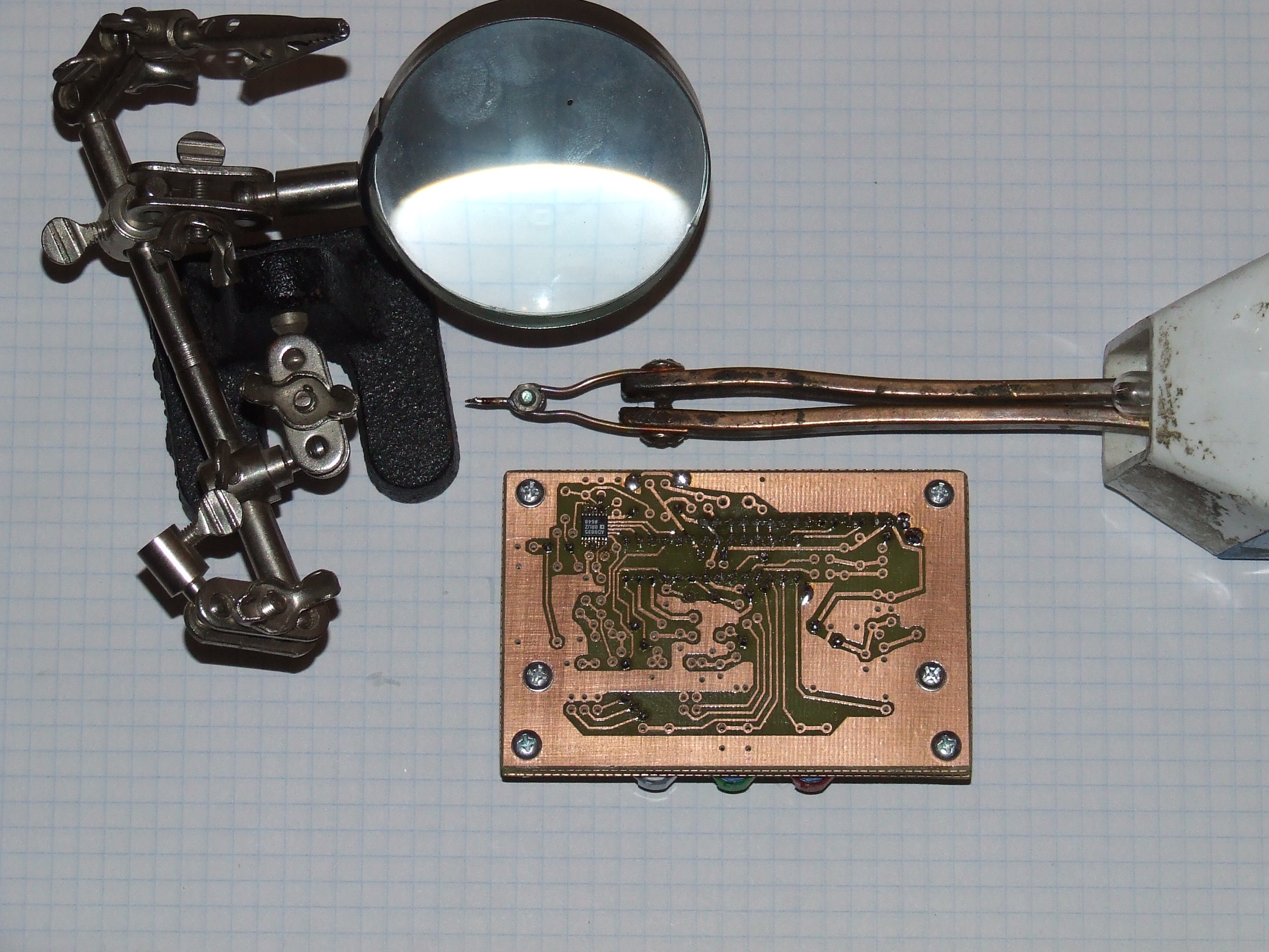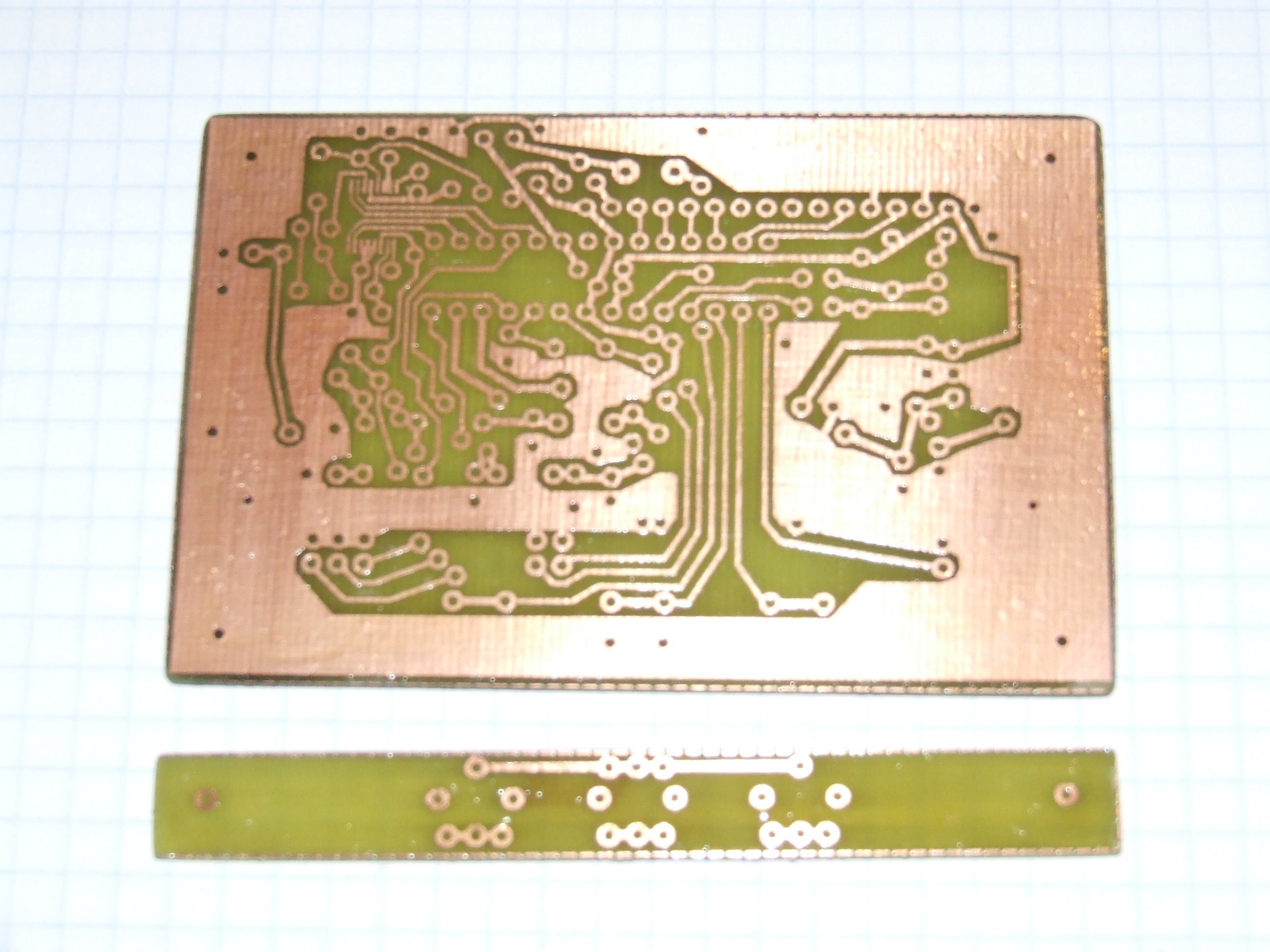 Sercem systemu Tiny DDS jest mikrokontroler AT Mega 8 o pamięci 8kB gdzie umieszczony został kod programu sterującego działaniem układu scalonego DDS i reagujący na zewnętrzne sygnały sterujące od klawiszy funkcyjnych i impulsatora. Dodatkowo, stan urządzenia obserwować można na wyświetlaczu LCD 2*12 z podświetleniem. Jako impulsator zastosowałem tani (9PLN) fabryczny element ELFA (typ 35-847-60) zasilany przez rezystory polaryzujące oraz podłączony do wejść mikrokontrolera przez pojemności separujące. Impulsator pełni oczywiście rolę pokrętła strojenia podczas normalnej pracy ale wykorzystuję go również do ustawiania innych parametrów systemu. Podświetleniem wyświetlacza LCD steruje tranzystor BC557 a regulację jasności zapewnia potencjometr montażowy 25k. Sygnał użyteczny (pin 14 AD9835) wzmocniony jest na tranzystorze 2N2222 w układzie z charakterystyką nieco podniesioną dla wyższych częstotliwości a następnie filtrowany jest w jednostopniowym filtrze dolnoprzepustowym typu pi. Zastosowany generator kwarcowy zapewnia odpowiednią stabilność częstotliwości wyjściowej. Sygnał użyteczny jaki można uzyskać z generatora o częstotliowści F wynosi F/2. ![]() Obwód drukowany jest jednostronny i składa się z dwóch płytek na których montuje się systm DDS oraz klawisze funkcyjne. Impulsator montowany do płyty czołowej urządzenia dołączony jest do systemu DDS za pomocą rozłączanego konektora. Montaż należy rozpocząć od założenia wszystkich zwor. Następnie należy wlutować układ AD9835 co jest najtrudniejszą częścią montażu. Układ ten montowany jest oczywiście od strony druku a zastosowana technika zależy od umiejętności i dostępnych narzędzi. Autor używał do tego celu lutownicy transformatorowej z dokręconą, za pomocą wkrętu M3 ze śrubą, końcówką lutowniczą w formie zaostrzonego drutu miedzianego 1.2mm ze wspomaganiem w postaci silnej lupy oraz imadła, w którym zamocowana została płytka na czas lutowania. Inna zasłyszna technika lutowania takich układów polega na szybkim, jednorazowym przeciągnięciu po wyprowadzeniach, układu ułożonego na płytce drukowanej, rozgrzanej lutownicy z grotem o szerokości umożliwiającej objęcie wielu wyprowadzeń jednocześnie. Technika ta wymaga dobrego oczyszczenia lutowanych powierzchni i wyprowadzeń oraz porządnego pokrycia ich odpowiednim topnikiem. Poza tym wymaga nieco odwagi i zdecydowania. Podobno można nawet w tej technice dojść do wprawy ale autor na razie zamierza pozostać przy swojej prymitywnej ale skutecznej metodzie. ![]() Płytki drukowane wykonane zostały metodą termotransferową z użyciem cienkiego papieru kredowego, drukarki laserowej oraz zwykłego żelazka. Po wytrawieniu należy powierzchnie miedziane dokładnie oczyścić a następnie pokryć topnikiem i wysuszyć je przed wierceniem i montażem. Wiercąc otwory należy pamiętać o 6 otworach M3 w głównej płytce oraz 2 otworach w płytce klawiszy. Otwory te służą do połączenia płytek ze sobą oraz stanowią jednocześnie miejsca gdzie zamontowane zostaną wsporniki układu dystansujące go od płyty czołowej na której będzie zwykle zamontowany oraz ustalające jednakowy poziom wyświetlacza i klawiszy. Pokazane na rysunkach obrazy druku mają rozmiary 1:1 (60/90 mm) i mogą być wykorzystane w metodzie termotransferowej. Rysunki w górnym rzędzie to faktyczny obraz druku a rysunki w dolnym rzędzie to lustrzane odbicia i w zasadzie te rysunki powinny być używane w metodzie termotransferowej. Wszystkie rysunki można również pobrać w formie pliku a rysunek druku również jako Montaż układu należy rozpocząć od wytrawienia płytek drukowanych. Pomimo niewielkich odległości pomiędzy ścieżkami układu AD9835 udaje się to przy zachowaniu minimum staranności. Płytki należy starannie oczyścić po wytrawieniu a następnie należy je pokryć topnikiem i odstawić do wyschnięcia. Kolejną czynnością jest powiercenie płytek z uwzględnieniem otworów 3mm na wsporniki wyświetlacza i mocujące cały układ DDS. Na zdjęciach pokazane zostały wszystkie detale mechaniczne służące do tego celu oraz sposób ich zamocowania i miejsce użycia. Pokazałem również wyświetlacz do którego należy wlutować listwę pinów oraz symetryczną listwę złącza do płytki DDS.. Jako wspornik wyświetlacza użyta jest tulejka sześciokątna 10mm uzupełniona o 3 podkładki (2 na spodzie i jedna doklejona poxipolem od strony wyświetlacza) mająca w sumie 11.5mm. Płytka z klawiszami mocowana jest za pomocą tulejki 5mm do której następnie dołożona jest tulejka 10mm co w sumie daje dystans 16.5mm z płytką klawiszy licząc. Na górze płytki użyte są tulejki dystansowe 15mm uzupełnione do wymiaru 16.5mm o trzy podkładki dystansowe. Większość wkrętów i podkładki pochodzą z zestawów montażowych do PC. Jedynie wkręty mocujące płytkę z klawiszami mają długość 10mm. W ten sposób następuje zrównanie klawiszy z poziomem wyświetlacza a dystans mocowania całej płytki DDS do płytki czołowej umożliwia zamontowanie DDS bez dodatkowego dystansowania. Kolejną czynnością jest założenie wszystkich zwor. W szczególności należy pamiętać o zworze pod podstawką układu mikrokontrolera, która powinna być zakładana przed montażem podstawki. Kolejne zdjęcie pokazuje jak główne elementy układu DDS złozone zostają w kompletny zestaw. Oczywiście można je rozłączyć a nawet należy to zrobić bo montaż nie został jeszcze ukończony. Ostatnie zdjęcie w tej serii pokazuje sprzęt jaki mi służy do lutowania układu AD9835 a jest to kolejna czynność montażowa. Na zdjęciu widać płytkę z nalutowanym już układem, lutownicę z opisaną wcześniej zaostrzoną końcówką lutowniczą wykonaną z drudu miedzianego z jakiego robiony jest grot a także nieodzowną do tego celu lupę. Na zdjęciu nie zmieściło się ty
