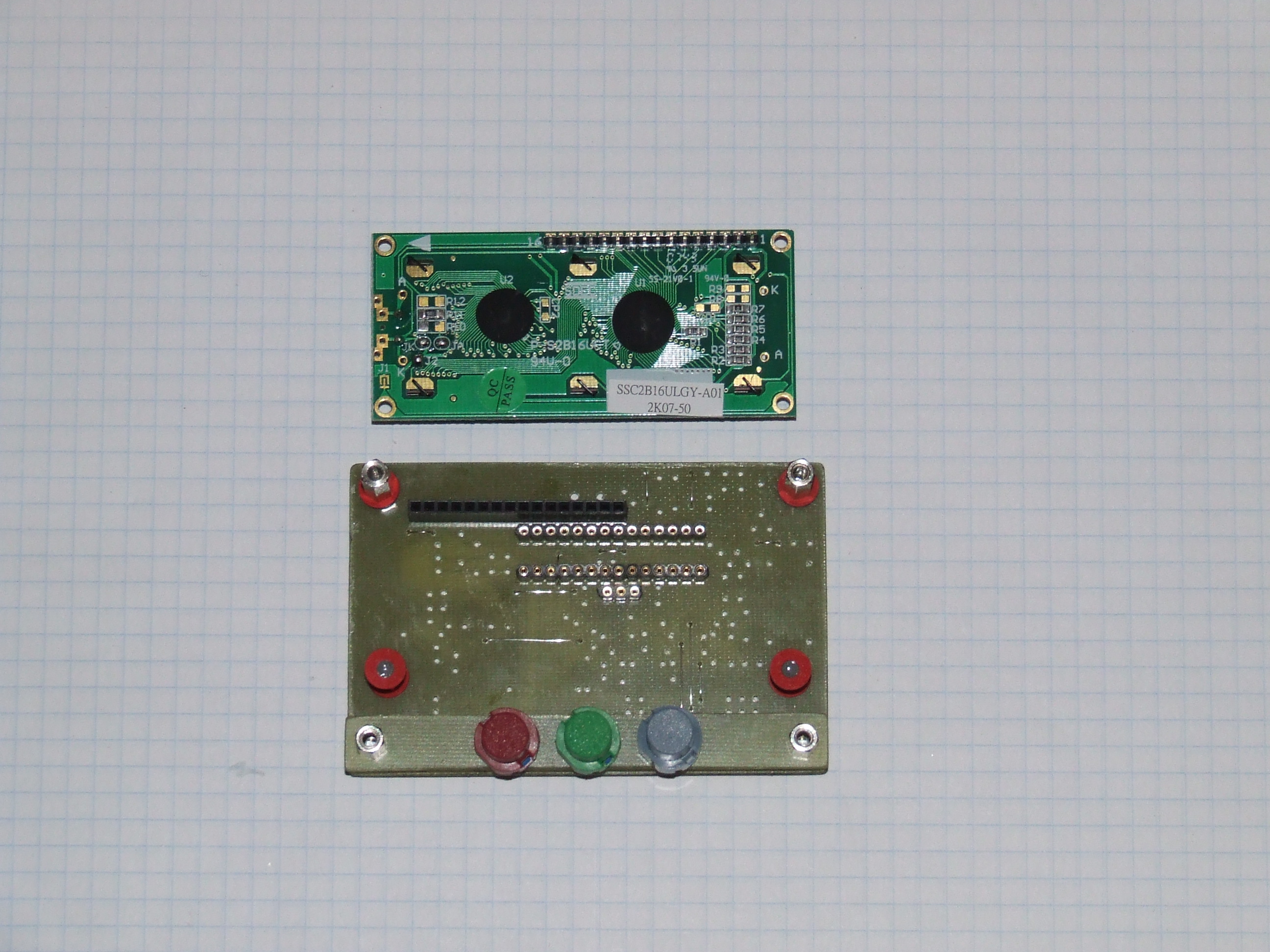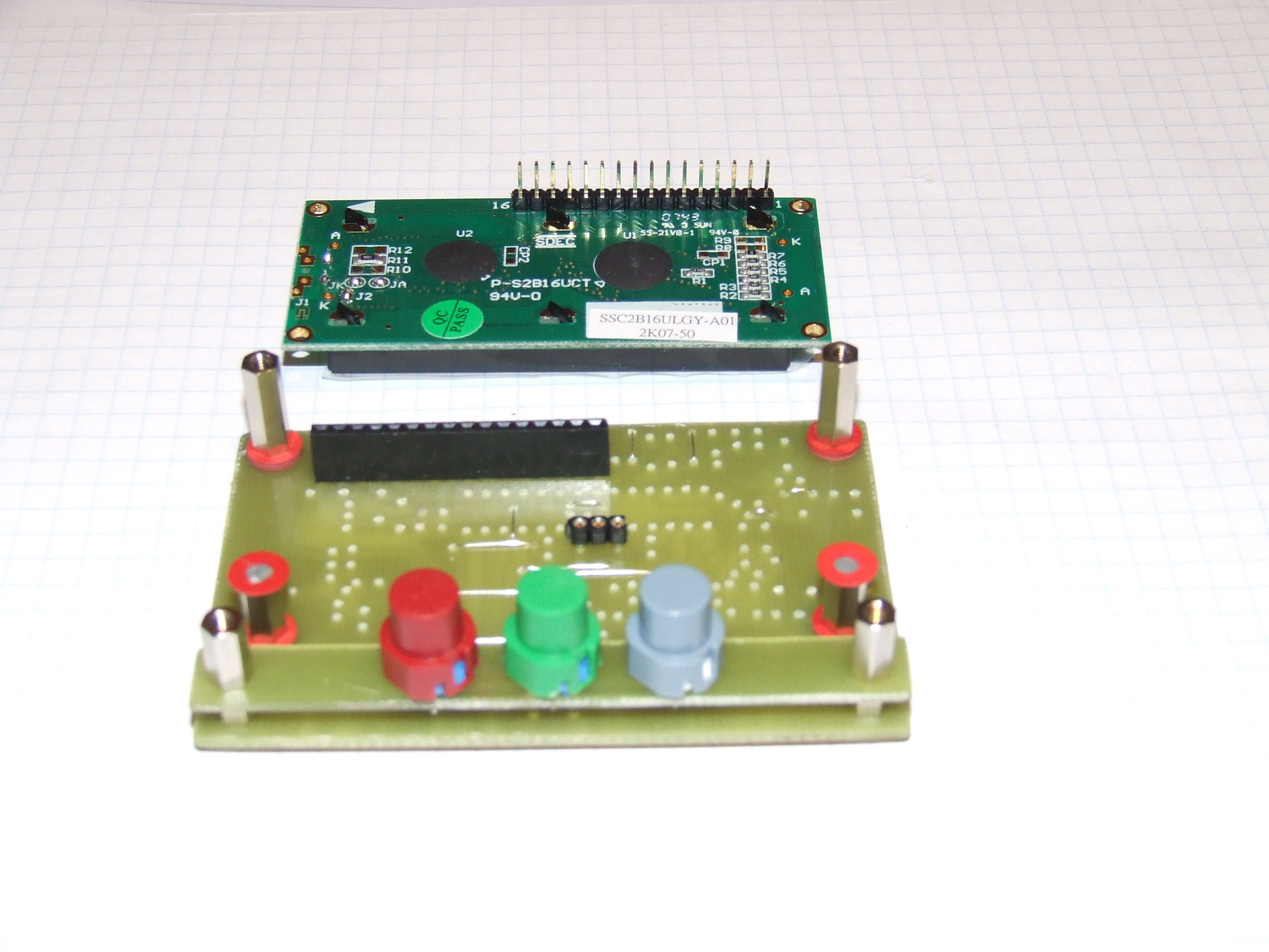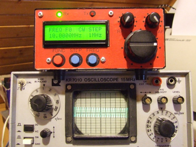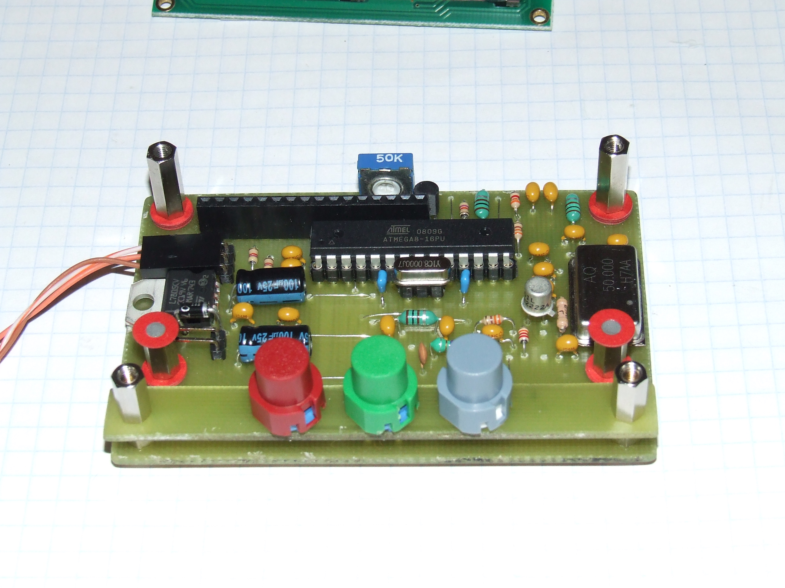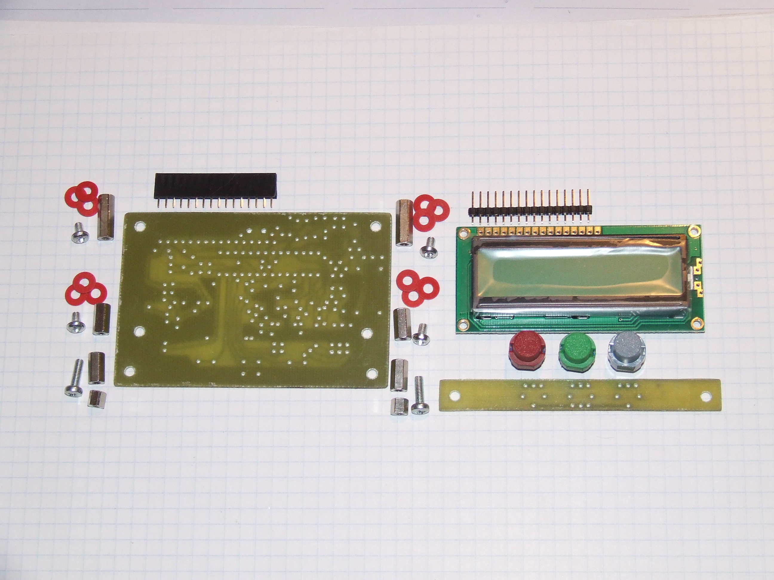 Sercem systemu Tiny DDS jest mikrokontroler AT Mega 8 o pamięci 8kB gdzie umieszczony został kod programu sterującego działaniem układu scalonego DDS i reagujący na zewnętrzne sygnały sterujące od klawiszy funkcyjnych i impulsatora. Dodatkowo, stan urządzenia obserwować można na wyświetlaczu LCD 2*12 z podświetleniem. Jako impulsator zastosowałem tani (9PLN) fabryczny element ELFA (typ 35-847-60) zasilany przez rezystory polaryzujące oraz podłączony do wejść mikrokontrolera przez pojemności separujące. Impulsator pełni oczywiście rolę pokrętła strojenia podczas normalnej pracy ale wykorzystuję go również do ustawiania innych parametrów systemu. Podświetleniem wyświetlacza LCD steruje tranzystor BC557 a regulację jasności zapewnia potencjometr montażowy 25k. Sygnał użyteczny (pin 14 AD9835) wzmocniony jest na tranzystorze 2N2222 w układzie z charakterystyką nieco podniesioną dla wyższych częstotliwości a następnie filtrowany jest w jednostopniowym filtrze dolnoprzepustowym typu pi. Zastosowany generator kwarcowy zapewnia odpowiednią stabilność częstotliwości wyjściowej. Sygnał użyteczny jaki można uzyskać z generatora o częstotliowści F wynosi F/2. ![]() Obwód drukowany jest jednostronny i składa się z dwóch płytek na których montuje się systm DDS oraz klawisze funkcyjne. Impulsator montowany do płyty czołowej urządzenia dołączony jest do systemu DDS za pomocą rozłączanego konektora. Montaż należy rozpocząć od założenia wszystkich zwor. Następnie należy wlutować układ AD9835 co jest najtrudniejszą częścią montażu. Układ ten montowany jest oczywiście od strony druku a zastosowana technika zależy od umiejętności i dostępnych narzędzi. Autor używał do tego celu lutownicy transformatorowej z dokręconą, za pomocą wkrętu M3 ze śrubą, końcówką lutowniczą w formie zaostrzonego drutu miedzianego 1.2mm ze wspomaganiem w postaci silnej lupy oraz imadła, w którym zamocowana została płytka na czas lutowania. Inna zasłyszna technika lutowania takich układów polega na szybkim, jednorazowym przeciągnięciu po wyprowadzeniach, układu ułożonego na płytce drukowanej, rozgrzanej lutownicy z grotem o szerokości umożliwiającej objęcie wielu wyprowadzeń jednocześnie. Technika ta wymaga dobrego oczyszczenia lutowanych powierzchni i wyprowadzeń oraz porządnego pokrycia ich odpowiednim topnikiem. Poza tym wymaga nieco odwagi i zdecydowania. Podobno można nawet w tej technice dojść do wprawy ale autor na razie zamierza pozostać przy swojej prymitywnej ale skutecznej metodzie. ![]() Płytki drukowane wykonane zostały metodą termotransferową z użyciem cienkiego papieru kredowego, drukarki laserowej oraz zwykłego żelazka. Po wytrawieniu należy powierzchnie miedziane dokładnie oczyścić a następnie pokryć topnikiem i wysuszyć je przed wierceniem i montażem. Wiercąc otwory należy pamiętać o 6 otworach M3 w głównej płytce oraz 2 otworach w płytce klawiszy. Otwory te służą do połączenia płytek ze sobą oraz stanowią jednocześnie miejsca gdzie zamontowane zostaną wsporniki układu dystansujące go od płyty czołowej na której będzie zwykle zamontowany oraz ustalające jednakowy poziom wyświetlacza i klawiszy. Pokazane na rysunkach obrazy druku mają rozmiary 1:1 (60/90 mm) i mogą być wykorzystane w metodzie termotransferowej. Rysunki w górnym rzędzie to faktyczny obraz druku a rysunki w dolnym rzędzie to lustrzane odbicia i w zasadzie te rysunki powinny być używane w metodzie termotransferowej. Wszystkie rysunki można również pobrać w formie pliku a rysunek druku również jako Montaż układu należy rozpocząć od wytrawienia płytek drukowanych. Pomimo niewielkich odległości pomiędzy ścieżkami układu AD9835 udaje się to przy zachowaniu minimum staranności. Płytki należy starannie oczyścić po wytrawieniu a następnie należy je pokryć topnikiem i odstawić do wyschnięcia. Kolejną czynnością jest powiercenie płytek z uwzględnieniem otworów 3mm na wsporniki wyświetlacza i mocujące cały układ DDS. Na zdjęciach pokazane zostały wszystkie detale mechaniczne służące do tego celu oraz sposób ich zamocowania i miejsce użycia. Pokazałem również wyświetlacz do którego należy wlutować listwę pinów oraz symetryczną listwę złącza do płytki DDS.. Jako wspornik wyświetlacza użyta jest tulejka sześciokątna 10mm uzupełniona o 3 podkładki (2 na spodzie i jedna doklejona poxipolem od strony wyświetlacza) mająca w sumie 11.5mm. Płytka z klawiszami mocowana jest za pomocą tulejki 5mm do której następnie dołożona jest tulejka 10mm co w sumie daje dystans 16.5mm z płytką klawiszy licząc. Na górze płytki użyte są tulejki dystansowe 15mm uzupełnione do wymiaru 16.5mm o trzy podkładki dystansowe. Większość wkrętów i podkładki pochodzą z zestawów montażowych do PC. Jedynie wkręty mocujące płytkę z klawiszami mają długość 10mm. W ten sposób następuje zrównanie klawiszy z poziomem wyświetlacza a dystans mocowania całej płytki DDS do płytki czołowej umożliwia zamontowanie DDS bez dodatkowego dystansowania. Kolejną czynnością jest założenie wszystkich zwor. W szczególności należy pamiętać o zworze pod podstawką układu mikrokontrolera, która powinna być zakładana przed montażem podstawki. Kolejne zdjęcie pokazuje jak główne elementy układu DDS złozone zostają w kompletny zestaw. Oczywiście można je rozłączyć a nawet należy to zrobić bo montaż nie został jeszcze ukończony. Ostatnie zdjęcie w tej serii pokazuje sprzęt jaki mi służy do lutowania układu AD9835 a jest to kolejna czynność montażowa. Na zdjęciu widać płytkę z nalutowanym już układem, lutownicę z opisaną wcześniej zaostrzoną końcówką lutowniczą wykonaną z drudu miedzianego z jakiego robiony jest grot a także nieodzowną do tego celu lupę. Na zdjęciu nie zmieściło się ty