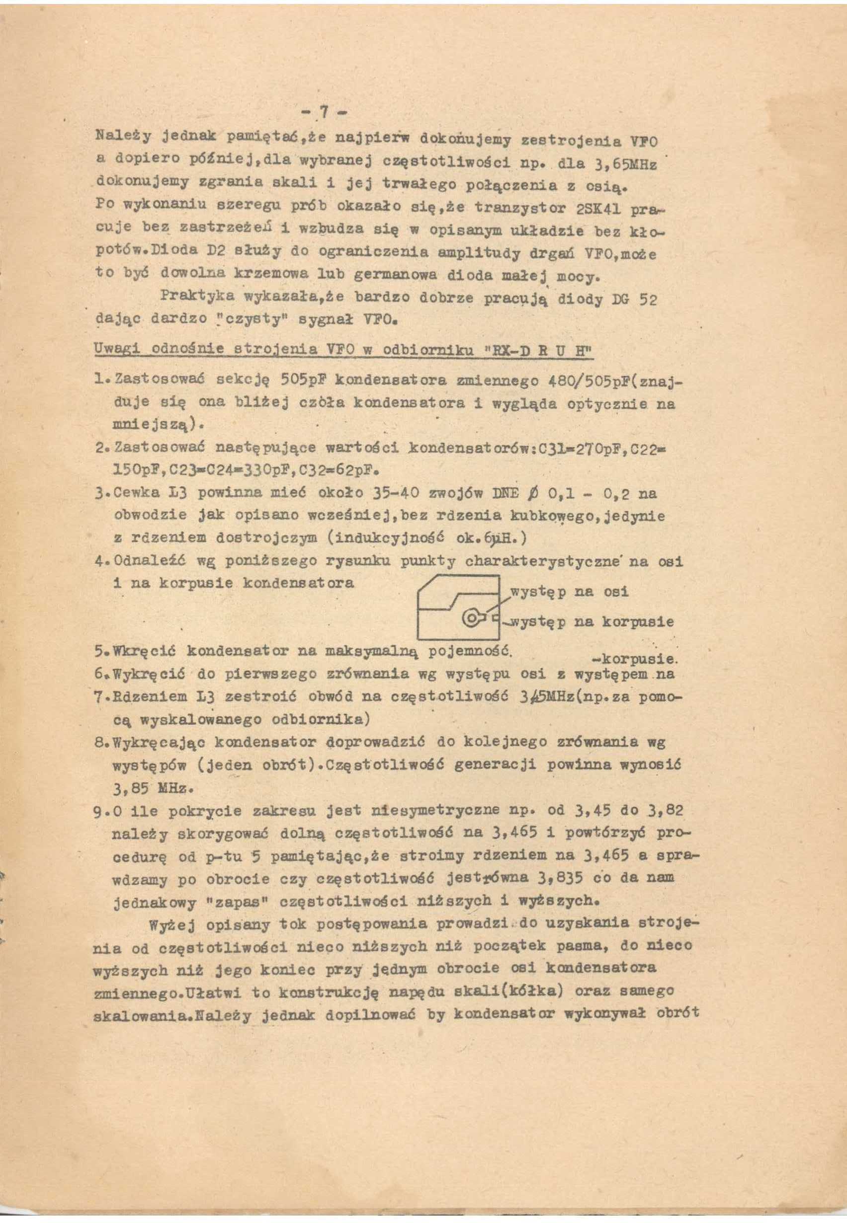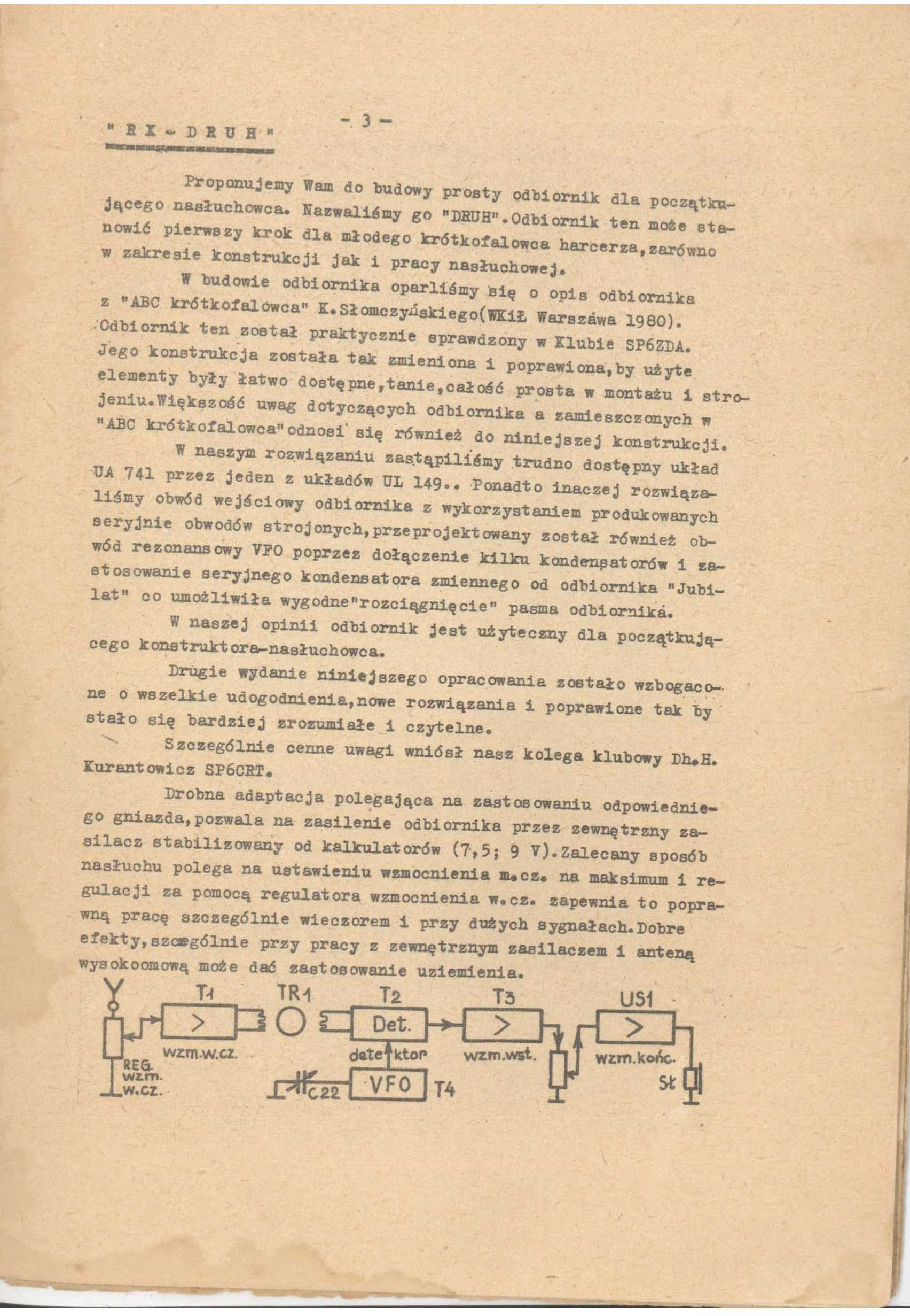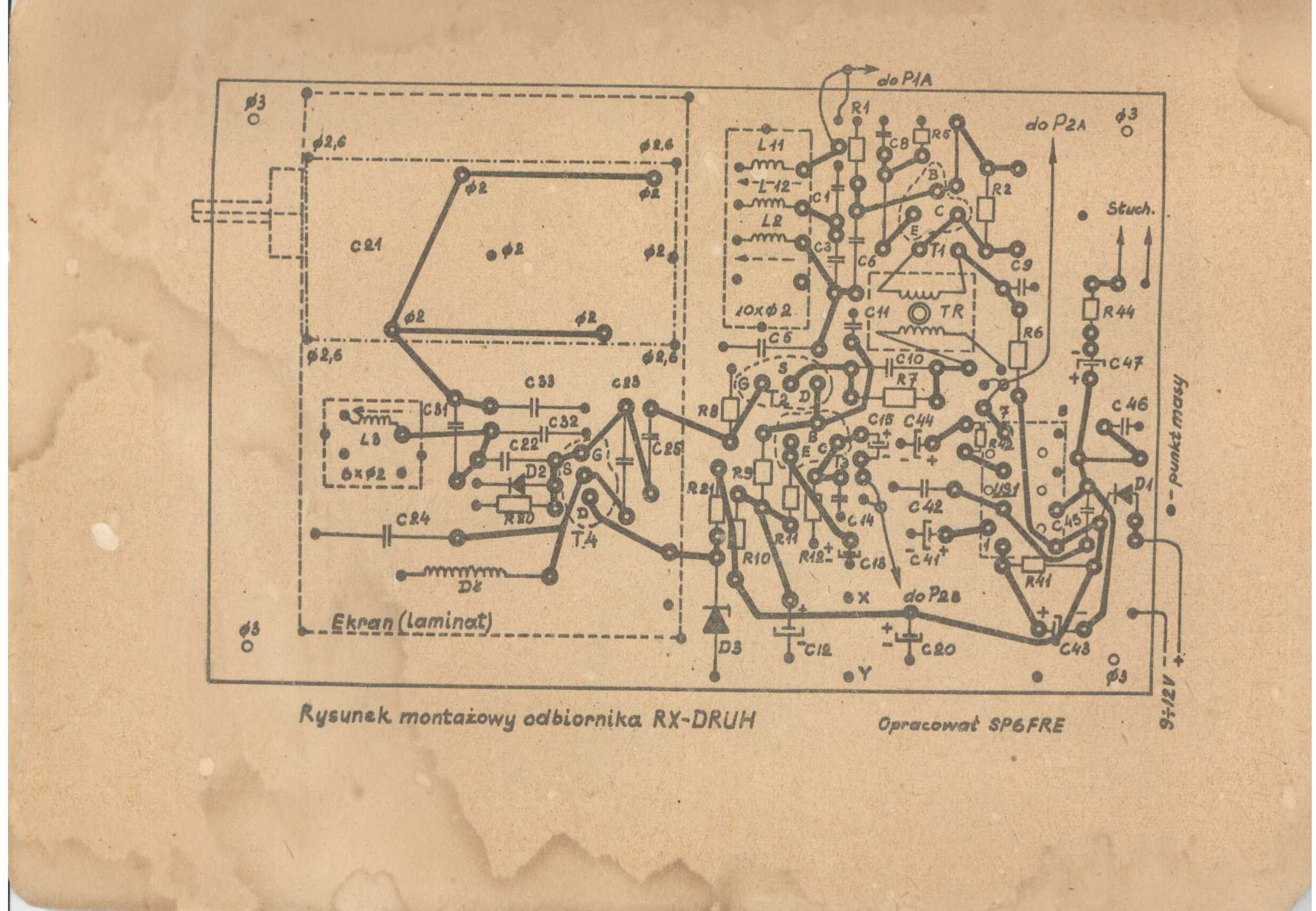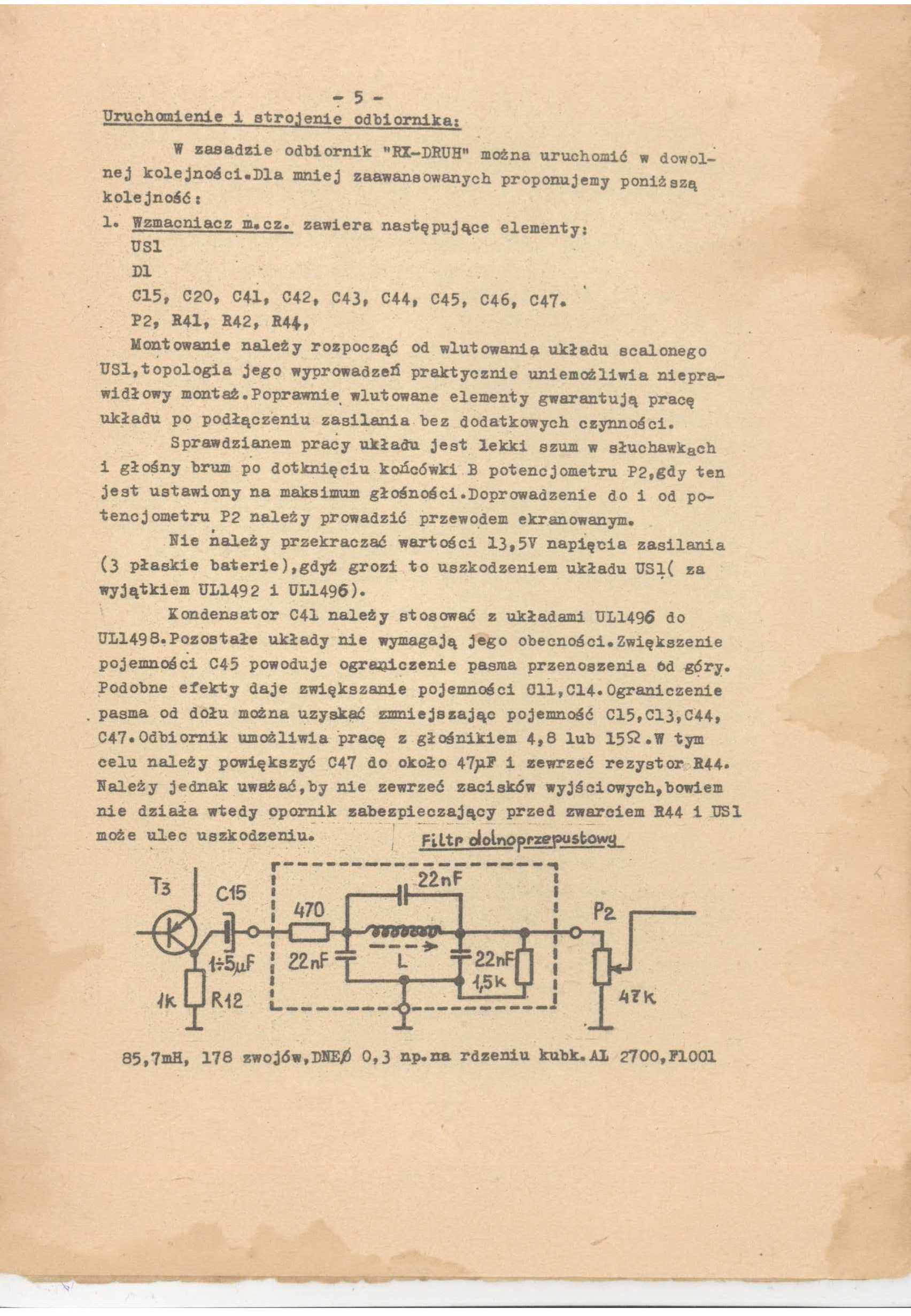 Dokumentacja składa się z kilkunastu stron i zawiera szczegółowy opis montażu i uruchomienia odbiornika mający służyć jako manual przy powielaniu konstrukcji przez harcerzy z drużyn łączności ZHP. Jak widać czas obszedł się surowo z papierem dokumentacji, który w tych czasach nie był najwyższej jakości ;-) |