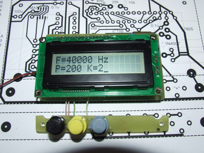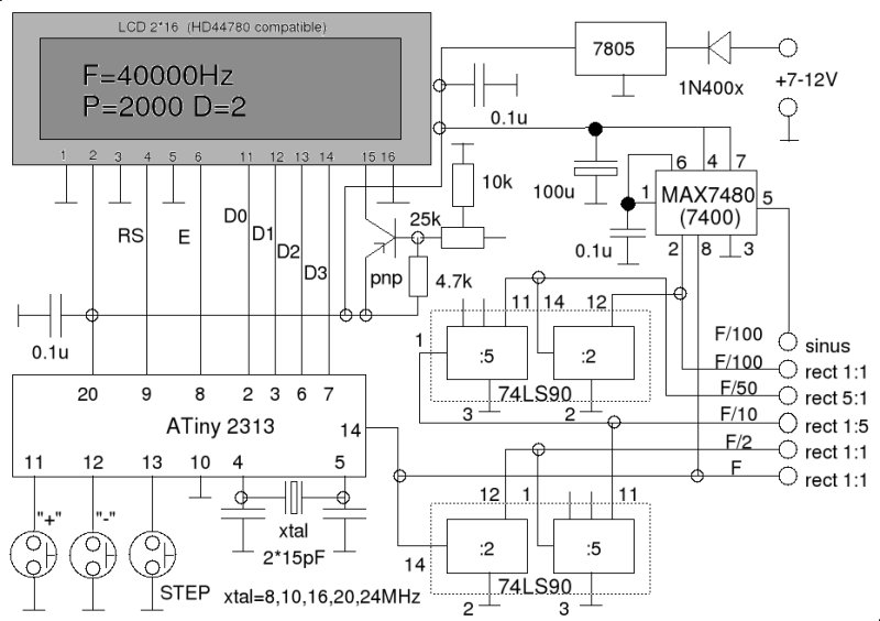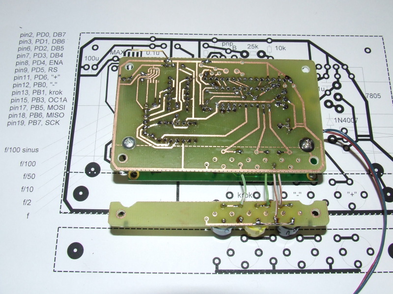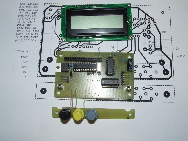 Prosty generator Pomysł na generator narodził się w czasie mojej próby (nieudanej niestety) pomiaru filtra polifazowego stosowanego w transceiverze DC01. Taką próbę podjąłem zakładając wątek na forum Home Made. Zamierzałem zbudować układ pomiarowy badający charakterystykę filtra i pokazujący jak wygląda w paśmie pracy. Przyrząd pomiarowy powstał ale dopiero po jego wykonaniu okazało się, że w założeniach pomiaru tkwił podstawowy błąd związany z naturą filtrów polifazowych i cała idea pomiaru upadła. Niemniej, elementem składomym przyrządu pomiarowego był generator sinusoidany sterowany automatycznie przez mikroprocesor organizujący procedurę pomiarową. "Sercem" generatora jest mikrokontroler ATiny 2313 sterowany zegarem o częstotliwości 8, 10, 16, 20 lub 24MHz. Do generowania częstotliwości wyjściowej użyty jest wewnętrzny rejesstr liczący układu, który może zliczać impulsy zegara generując na wyjściu 14 impuls po zliczeniu od 1 do 65536 impulsów. Ponieważ każdorazowe zliczenie ustalonej liczby impulsów x zmienia stan na przeciwny to na wyjściu 14 pojawi się częstotliwość powstałą przez podział zegara przez 2x. W praktyce więc częstotliwość na wyjściu można określić jako częstotliwość zegara podzieloną przez wartość podzielnika w zakresie od 2 do 131072 z krokiem 2. Impulsy na wyjścu 14 mikroprocesora są prostokątne i symetryczne. Poddawane są one kolejnym podziałom w dwóch dzielnikach 74LS90 z wyprowadzeniem częstotliwości pośrednich co powoduje, że do dyspozycji są impulsy o częstotliwości podstawowej F, F/2, F/10, F/50 oraz o częstotliwości F/100. Wszystkie te sygnały mają charakter prostokątny a dodatkowo sygnały F/10 i F/50 są wypełnione w proporcji 1:5 (1/5 jedynka, 4/5 zero). Pozostałe sygnały mają charakter symetryczny o wypełnieniu 1:1. Sygnały o częstotliwościach F oraz F/100 kierowane są do cyfrowego filtra dolnoprzepustowego MAX7480 na wyjściu którego otrzymuje się sygnał sinusoidalny (w zakresie 0-2.8kHz). Jeśli zamiast ukladu MAX7480 zastosuje się układ MAX7400 będzie można na wyjściu sinusoidalnym uzyskać częstotliwości do ok. 10kHz. Tranzystor pnp wraz z rezystorami 4.7k, 10k i potencjometrem zapewnia podświetlenie wyświetlacza i można go pominąć. Do obsługi generatora służą 3 klawisze z których dwa pierwsze zmieniają podzielnik na minus i na plus z ustalonym skokiem a trzeci z klawiszy zmienia skok w zamkniętym cyklu 2->20->200->2000->2->20..... W ten sposób możliwe jest szybkie ustawienie pożądanego podzielnika oraz przestawienie w żadany zakres częstotliwości.Układ został zaprojektowany na płytce 60/90mm.w taki sposób, że możliwe jest zamontowanie klawiszy funkcyjnych bezpośrednio na płytce podstawowej lub na dodatkowej płytce, którą można zamontować w innym miejscu płyty przedniej obudowy. W pokazanym modelu funkcjonalnym nie został zamontowany układ MAX7480, który montowany jest od strony druku. Wyświetlacz generatora pokazuje dane w dwóch liniach. W górnej linii wyświetlana jest częstotliwość F w Hz a w dolnej linii wyświetlany jest aktualnie zastosowany podzielnik P oraz krok K zmiany częstotliwości w wartościach podzielnika (2, 20, 200, 2000). Generator ma istotne ograniczenia dotyczące możliwości uzyskania sygnału sinusoidalengo jedynie w zakresie do 2.8kHz dla układu MAX7480 oraz ok. 10kHz dla układu MAX7400. Poza tym sam sygnał na wyjściu układów MAX po bliższym przyjrzeniu się zbudowany jest z elementów łączonych w sinusoidę z częstotliwością 100 krotnie większą (stąd niezbędny do sterowania układem zestaw częstotliwości F oraz F/100). Ograniczony jest również zakres przestrajania generatora oraz precyzja z jaką można ustawić częstotliwość pracy. Mając kwarc o częstotliwości X (ze zbioru 8, 10, 16, 20 i 24MHz) można uzyskać największą częstotliwość F równą X/2 oraz najmniejszą równą F/131070 (ok. 61Hz dla zegara 8MHz). Jednocześnie do dyspozycji są częstotliwości F/2, F/10, F/50. Dokładność ustawienia częstotliwości jest najlepsza dla dużych podzielników gdzie osiąga się ułamki Hz a dla największych częstotliwości krok może wyności i kilka MHz. Dla przykładu z zegarem 8MHz nawiększą osiągalną częstotliwością jest 4MHz a następnie 2MHz, 1.33MHz, 1MHz, 0.8MHz, 0.67MHz, 0.571MHz, 0.5MHz, 0.444MHz, 0.4MHz .... aby w okolicach 100kHz zmniana wnosiła ok. 2.5kHz, w okolicach 10kHz 25Hz a w okolicach 1kHz tylko 1Hz. Z odpowiednio mniejszym ziarnem zmieniają się częstotliwości pochodne czyli F/2, F/10, F/50 i F/100. Generalnie więc biorąc generator pozwala na ustawienie z dość dużą dokładnością dowolnej częstotliwości w pasmie akustycznym i może służyć do sporadycznych zastosowań na ustalonych częstotliwościach w wyższym paśmie. Oczywiście mikroprocesor ATiny 2313 wymaga odpowiedniego zaprogramowania. W zależności od wybranego kwarca zegara należy wybrać odpowiednią wersję oprogramowania. We wszystkich jednak przypadkach należy układ ATiny 2313 ustawić za pomocą bitów Fuse na następujące wartości: Fusebit C 1: Divide clock by 8 disable Fusebit KL 01: 6 CK 4ms delay Fusebit A987 1111:1111 external XTAL Fusebit J 0: Preserve EEPROM when chip is erased Wybór właściwej wersji oprogramowania wynika z zastosowanych przeliczników oraz ze względu na konieczność zachowania odpowiednich opóźnień czasowych podczas obsługi klawiszy funkcyjnych. Chcąc pozyskać oprogramowanie najedź na odpowiednią ikonę a następnie za pomocą prawego klawisza wybierz opcję "Zapisz element docelowy jako". Oprogramowanie jest darmowe do celów amatorskich, użycie komercyjne wymaga mojej zgody i oddzielnego uzgodnienia. |