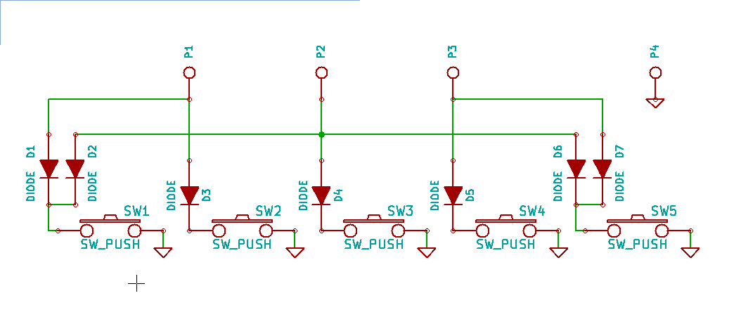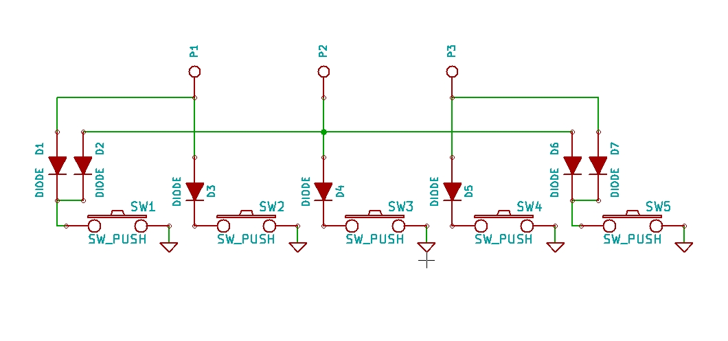 Płytka klawiszy przyda się po pierwszym etapie montażu urządzenia więc warto właśnie od niej zacząć prace. Jak wynika ze schematu kodowanie sygnalizacji pięciu klawiszy wykonane zostało za pomocą 3 linii sygnałowych poprzez sumowanie wykonane na diodach półprzewodnikowych. Można tu w zasadzie użyć dowolnych diod, na zdjęciach widać dioty Schottky BAT42, równie dobre będą popularne 1N4148.