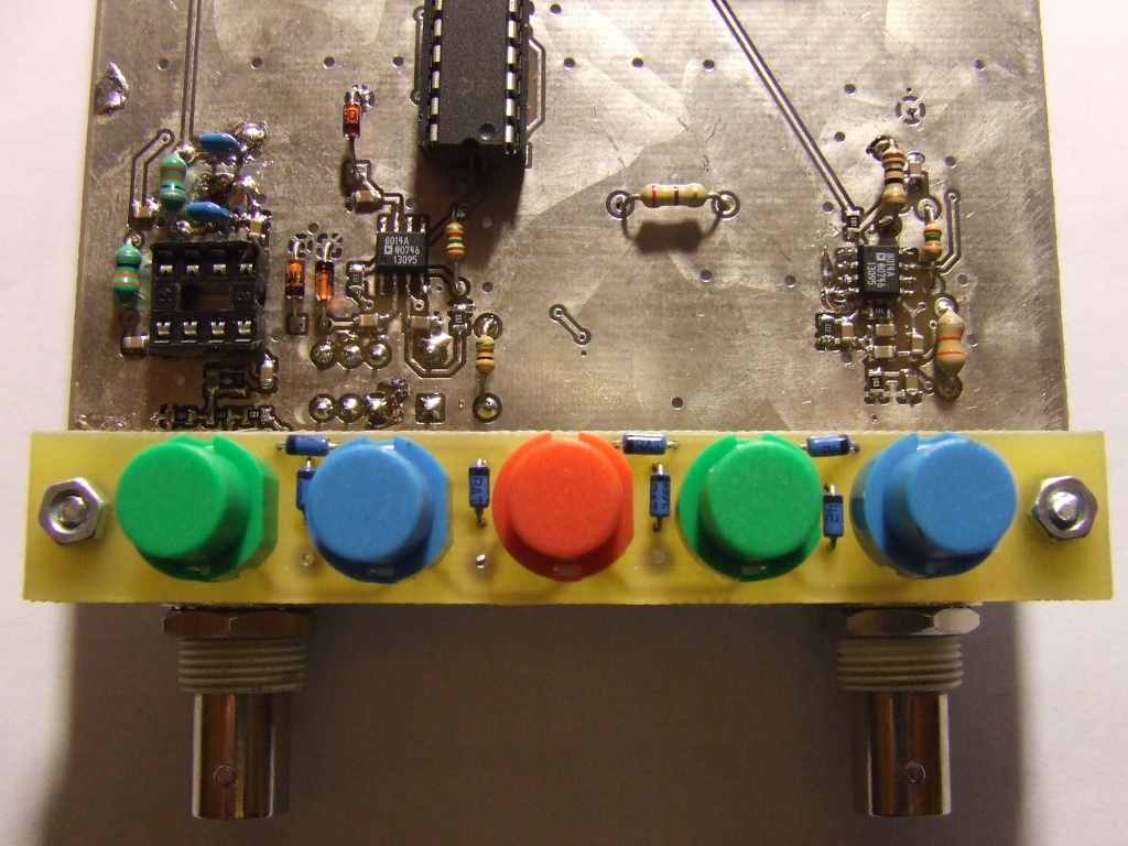 Podobnie jak poprzednio zalecam rozpoczęcie montażu od elementów smd. Wszystkie powierzchnie, gdzie odbywać się będzie lutowanie, należy pokryć topnikiem a wszystkie elementy należy zidentyfikować przed wlutowaniem. Każdy wmontowany element należy sprawdzić ze względu na zwarcie za pomocą omomierza z sygnalizacją akustyczną. Płytka drukowana zawiera niewielki błąd związany z gniazdem BNC, które należy wlutować od spodu (od strony druku). Otwory pod bolce mocujące gniazda mają zbyt dużą średnicę co wymaga dokładniejszego pozycjonowania bolców w otworze podczas lutowania aby gniazdo było wlutowane prostopadle do krawędzi płytki.