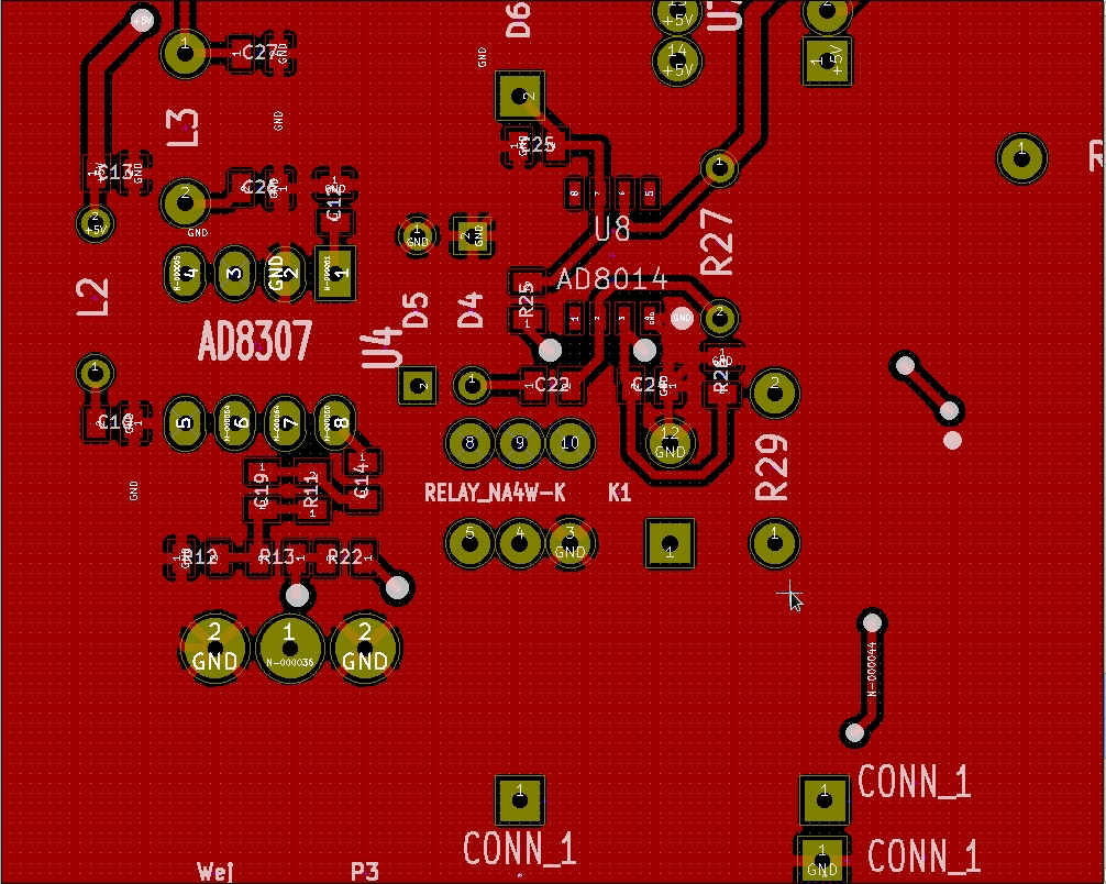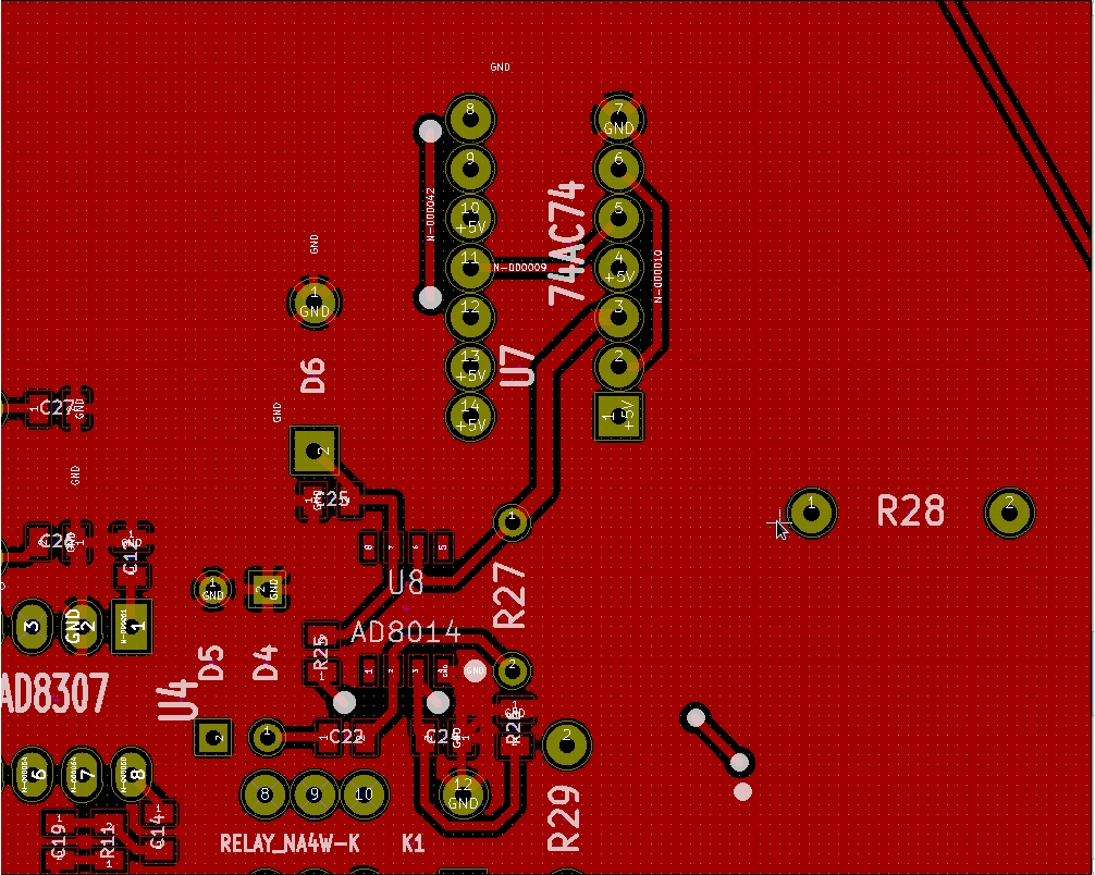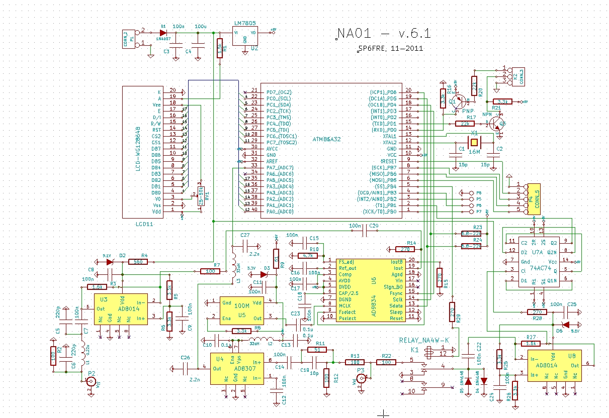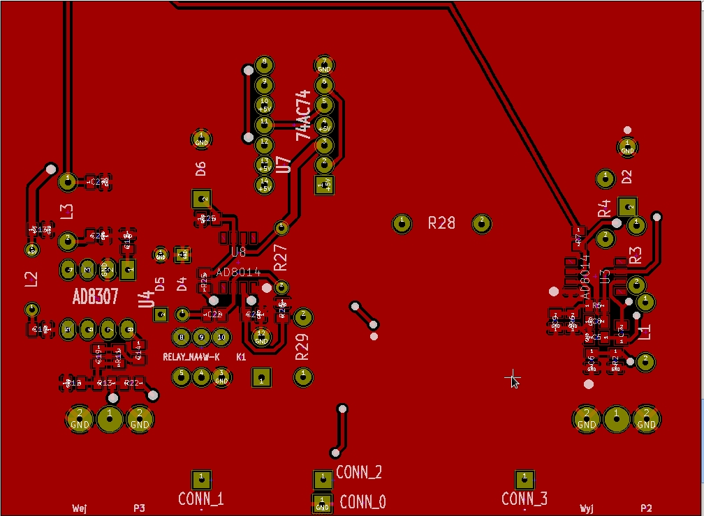 Wzmacniacz AD8307 jest detektorem sygnału zmiennego o dużej dynamice dający na wyjściu napięcie stałe, proporcjonalne do poziomu napięcia wejściowego w relacji 25mV na 1 dB mocy na wejściu układu. Pomiar sprowadza się zatem do określenia różnicy w poziomach mocy w badanym układzie w stosunku do poziomu mocy referencyjnej. Kondensatory C26 i C27 decydują o filtracji napięcia wyjściowego układu detektora. Zbyt duża wartość tych kondensatorów może zniekształcać pomiar na początku zakresu częstotliwości pomiarowych. Zastosowana wartość 2.2nF jest kompromisem pomiędzy stabilnością tego sygnału a szybkością zmian na wyjściu wzmacniacza.