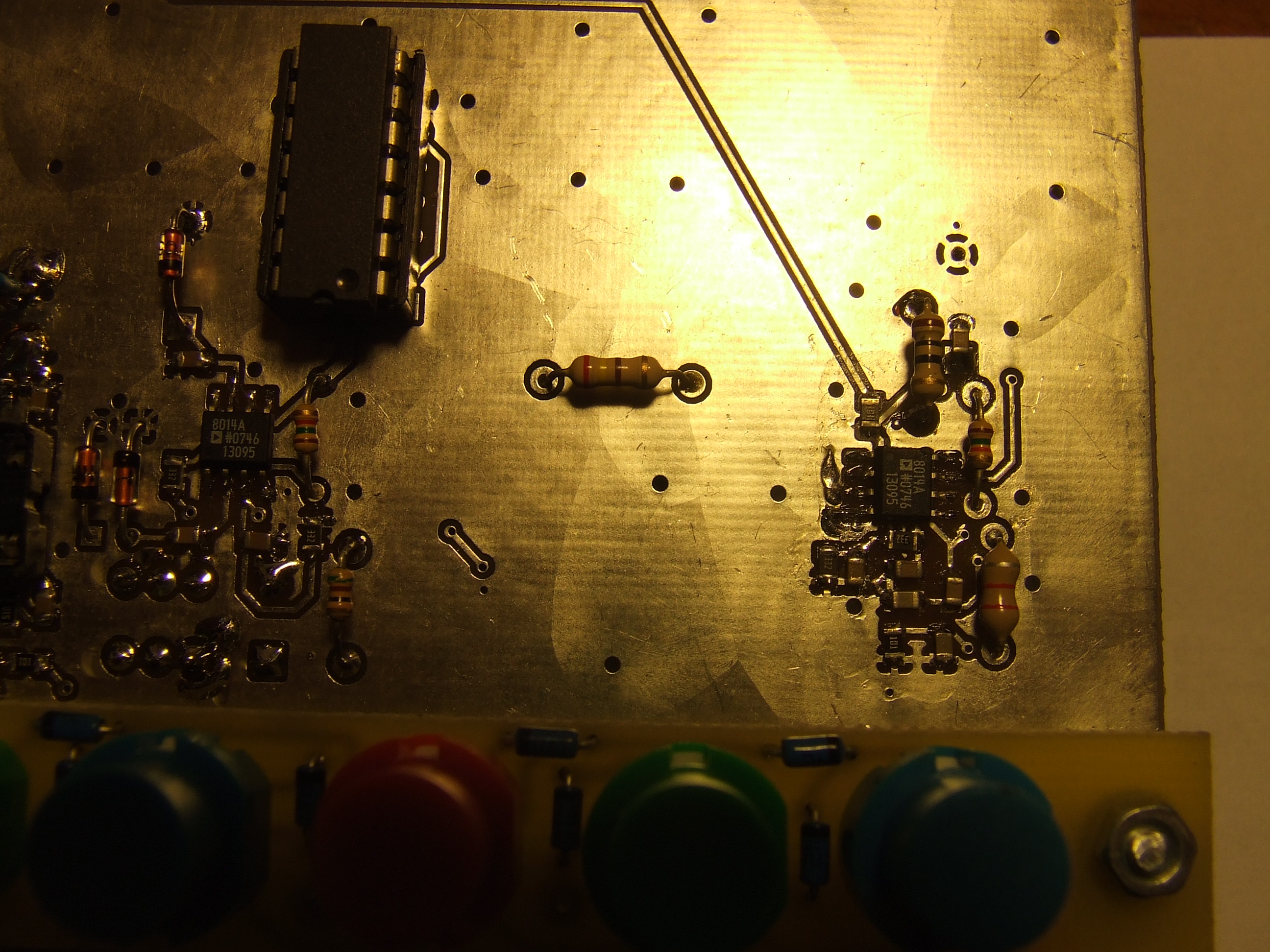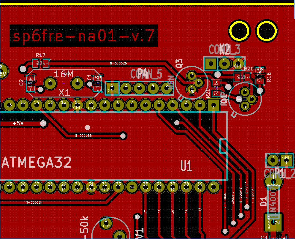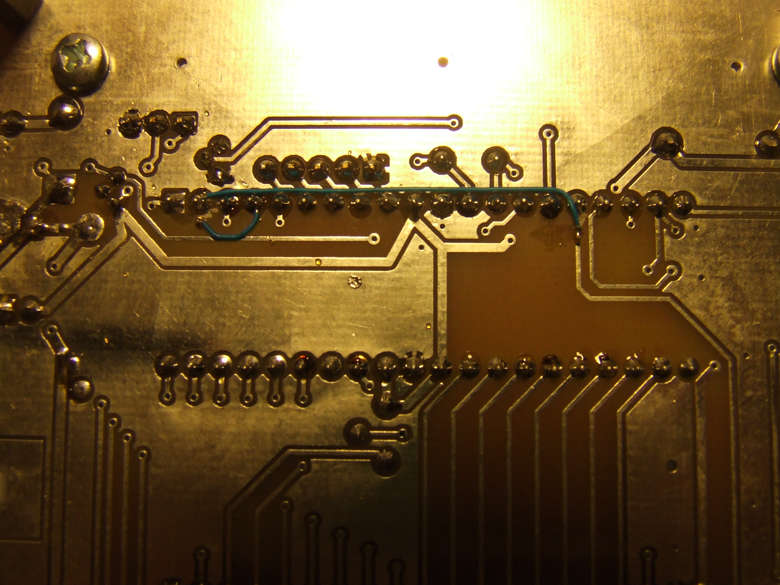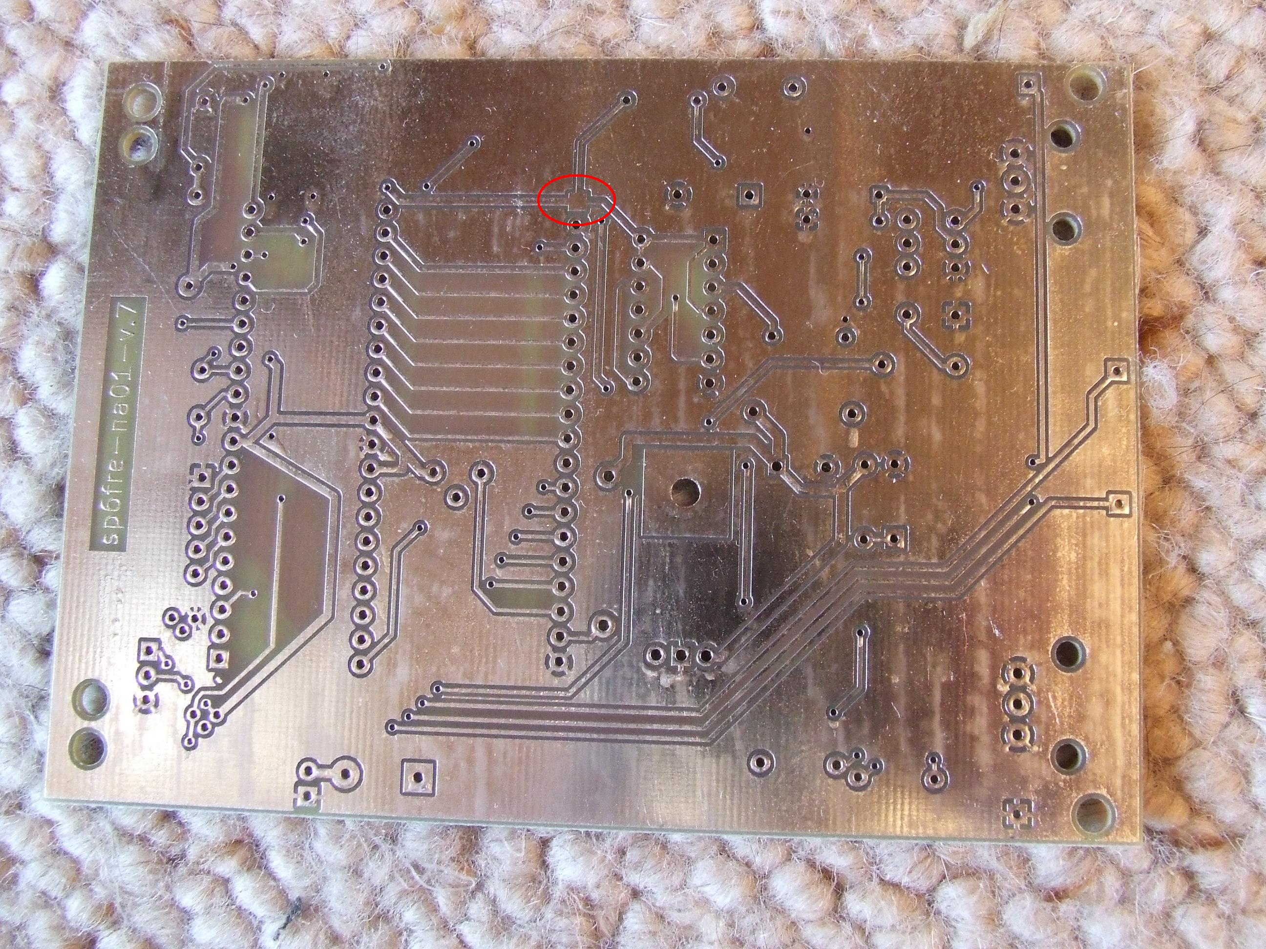 (gdzie go szukać?) od strony druku co pozwala na usunięcie błędu druku zasilania cewki przekaźnika spolaryzowanego. Błąd polega na nieprawidłowej polaryzacji tego przekaźnika. Alternatywnym sposobem usunięcia tego błędu jest zamiana miejscami zasilania cewki przekaźnika przez odłączenie jednego padu od masy (z obu stron płytki) i dołączenie go do linii sterującej z procesora, która powinna być odłączona od pada dołączonego do tej linii obecnie. Odłączony od sterowania pad przekaźnika powinien być oczywiście dołączony do masy. Ta zmiana w układzie druku pozwoli na wlutowanie przekaźnika od strony elementów. Autor uważa jednak, że wlutowanie przekaźnika od strony druku jest rozwiązaniem prostszym, tym bardziej, że przekaźnik jest niższy niż gniazda wejścia i wyjścia, które lutowane są od strony druku.