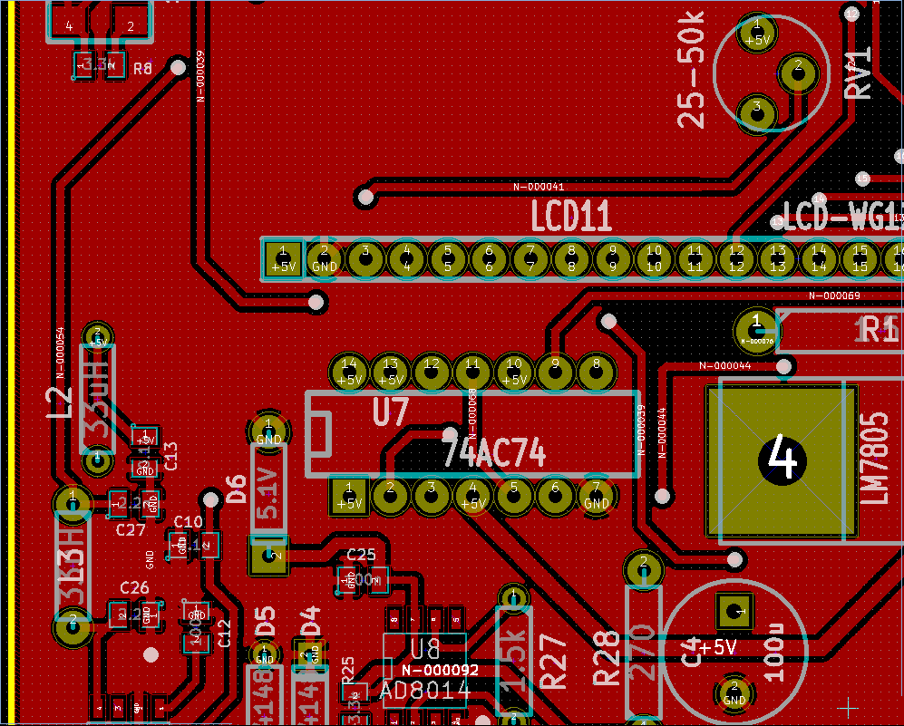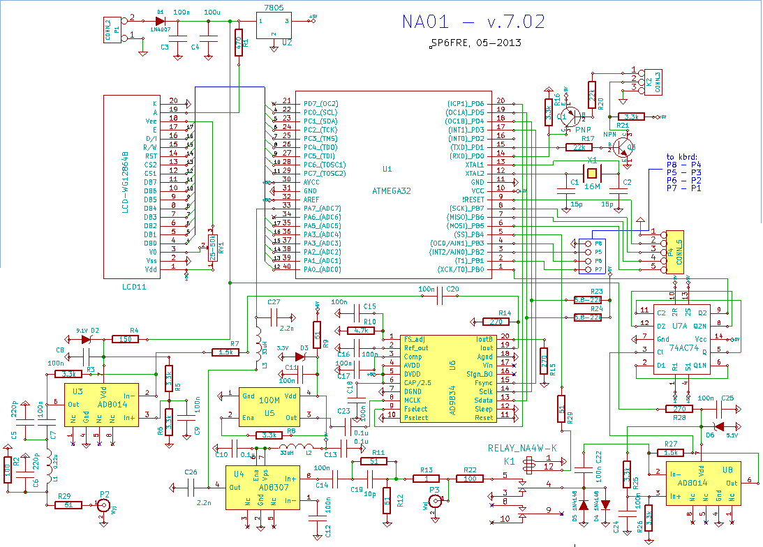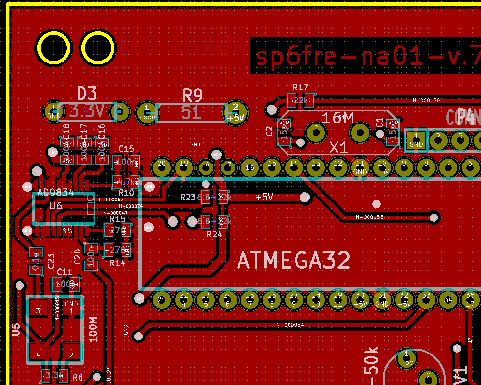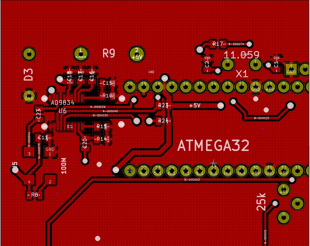 Zalecam rozpoczęcie montażu od wlutowania generatora DDS AD9834, generatora referencyjnego 100MHz, podstawki mikrokontrolera oraz pozostałych elementów tej części układu. Wszędzie tam, gdzie zaprojektowane zostały elementy smd należy ich użyć, choć w wyjątkowych sytuacjach można również zastosować elementy osiowe z odpowiednio krótkimi wyprowadzeniami.