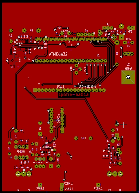 Najnowsza wersja miernika zawiera niewielkie poprawki dotyczące brakującego połączenia zasilania oraz pozwala na montaż bardziej dostępnego układu detektora AD8307 w obudowie do montażu powierzchniowego. Niestety, i tym razem nie udało się uniknąć pomyłki, pole 1 wyświetlacza nie ma otworu i trzeba go zrobić ręcznie :-).