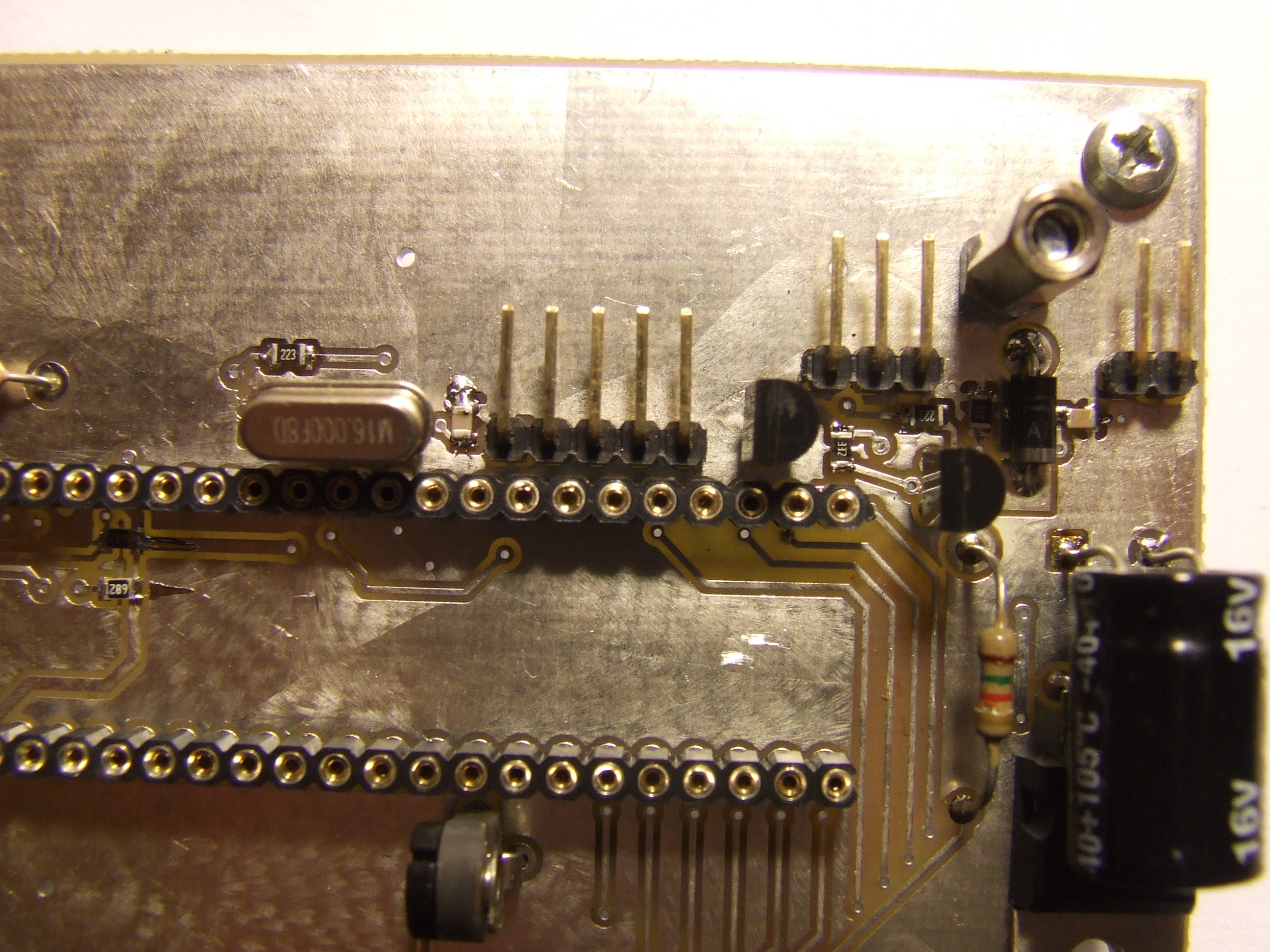 Montaż tej części układu należy rozpocząć od elementów smd. Oczywiście uprzednio wszystkie powierzchnie, gdzie odbywać się będzie lutowanie, należy pokryć topnikiem. Wszystkie elementy należy zidentyfikować przed wlutowaniem, dotyczy to z reguły kondensatorów bo oporniki mają zwykle dość czytelny opis. Zalecam sprawdzenie po wlutowaniu każdego elementu czy nie pojawiły się zwarcia jego styków do masy za pomocą omomierza z sygnalizacją akustyczną. Mikroprocesor sterowany jest własnym zegarem o częstotliwości 16MHz Kondensatory C1 i C2 powinny mieć wartość nie przekraczającą 20pF. Inne elementy w tej części układu można dobierać wokół wartości podanych na schemacie. Tranzystory Q1 i Q2 są typu p-n-p oraz n-p-n więc należy zwrócić uwagę na ich miejsce położenia i prawidłowość montażu. W końcowej fazie montażu należy wlutować stabilizator zasilania 7805 oraz większe elementy mechaniczne: podstawki, rezystor nastawny, podstawkę rezonatora kwarcowego, a także piny wyprowadzeń sygnalizacji oraz zasilania. Sam obwód zasilania, za pomocą diody D1 (1N4007), zabezpiecza przed omyłkową zmianą polaryzacji zasilania. Kondensator C4 (100uF/16V) powinien mieć małe wymiary i jeśli jest nie wyższy niż ok. 10.5mm to może być zamontowany jako stojący, jeśli jest wyższy to można zamontować go jak na zdjęciu w pozycji poziomej na stabilizatorze 7805.