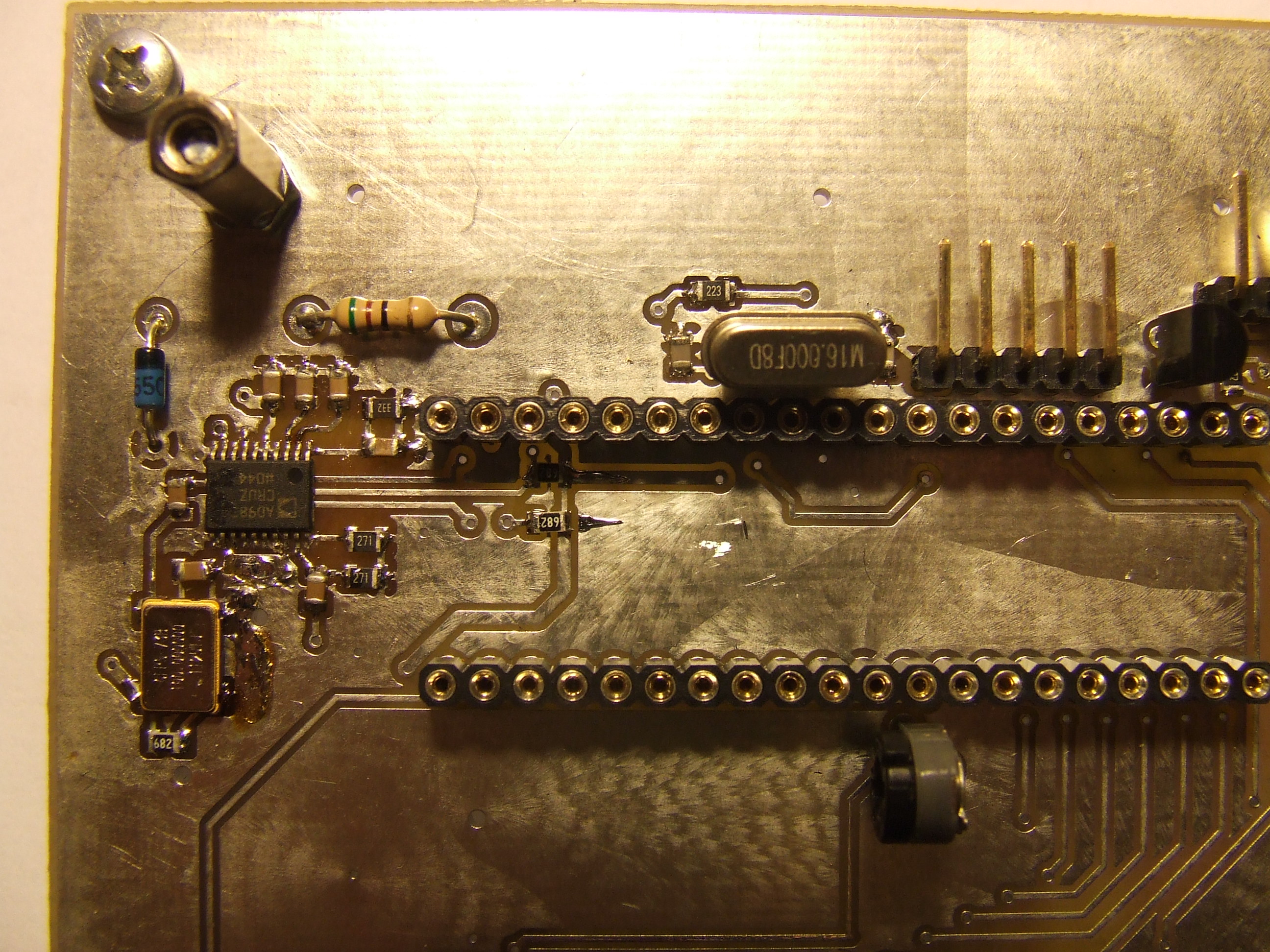 W końcowej fazie montażu należy wykonać niezbędne poprawki w druku co sprowadza się do przecięcia dwóch ścieżek oraz wykonania dwóch zwor. Zmiany dotyczą pinów 2 oraz 16 układu ATMega 32 i należy je wykonać od strony druku (na spodzie płytki - uwaga: rysunek druku widziany jest od góry a więc jest odwrócony). W obu przypadkach należy na wstępie wykonać przerwanie ścieżki tuż przy pinie. W przypadku pinu 2 należy przerwać połączenie przelotki oraz pinu 2 a następnie należy połączyć przelotkę z pinem 4, który w oryginale był nie podłączony. Z kolei należy przerwać, tuż przy pinie 16, ścieżkę jaka prowadzi do niego a następnie dołączyć tą ścieżkę do odłączonego uprzednio pinu 2. W ten sposób pin 16 zostanie niepodłączony. Zmiany połączeń powinny być wykonane za pomocą cienkiego. izolowanego przewodu, np. za pomocą kynara. Opisane zmiany są niezbędne ze względu na wprowadzoną funkcjonalność pomiaru częstotliwości i mają wpływ również na pracę zespołu klawiszy nawigacyjnych i muszą być wprowadzone przed pierwszym uruchomieniem urządzenia. Niezbędne zmiany zostały zobrazowane na pokazanych poniżej zdjęciach i rysunkach.