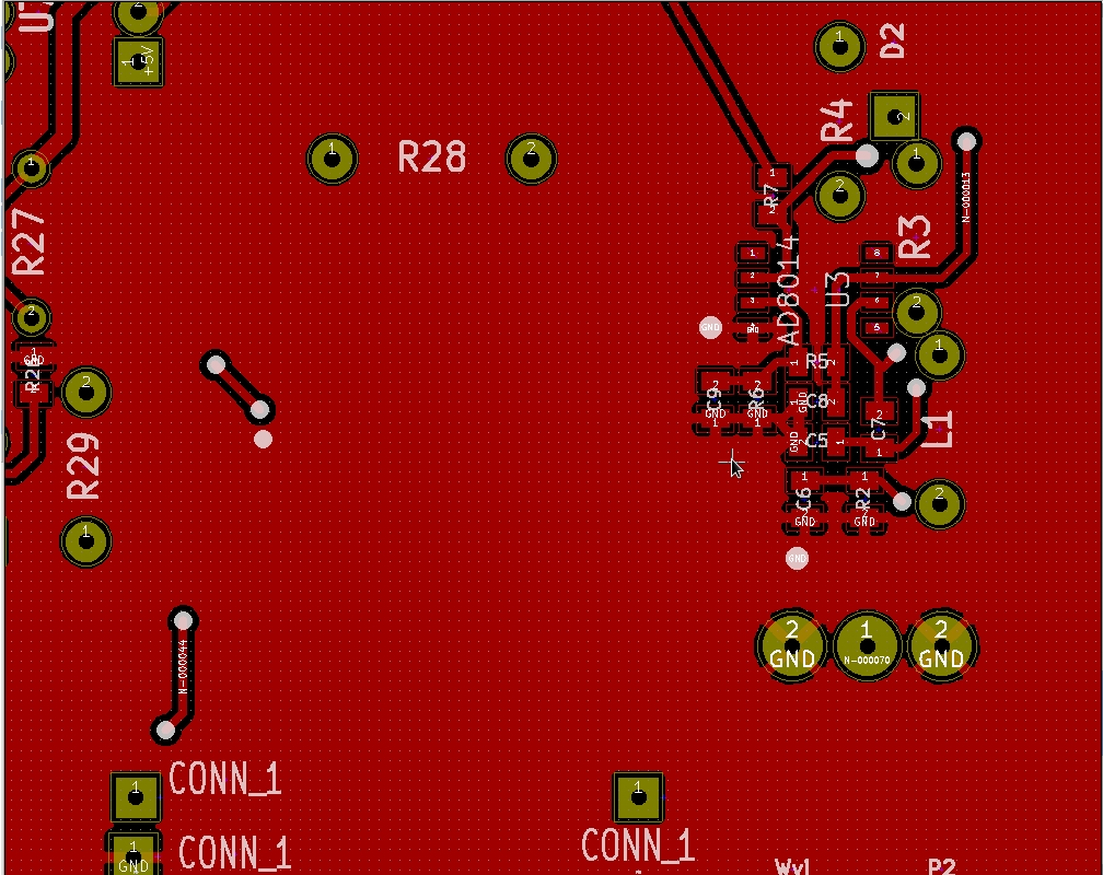 O wzmocnieniu układu wyjściowego decyduje wzajemna proporcja oporności R3 i R7 ale na dynamikę wzmacniacza ma również poziom napięcia zasilania. Dlatego zalecam sprawdzenie za pomocą oscyloskopu kształtu napięcia na wyjściu wzmacniacza. W razie stwierdzenia zniekształceń należy usunąć z obwodu diodę D2 a w jej miejsce wlutować kondensator 0.1uF. Dodatkowo, opornik R4 należy wymienić na 10 omów. Prawidłowa praca wzmacniacza wymaga aby napięcie na pinie 3 układu U3 AD8014 miało wartość połowy napięcia zasilania mierzonego na pinie 7 tego układu.