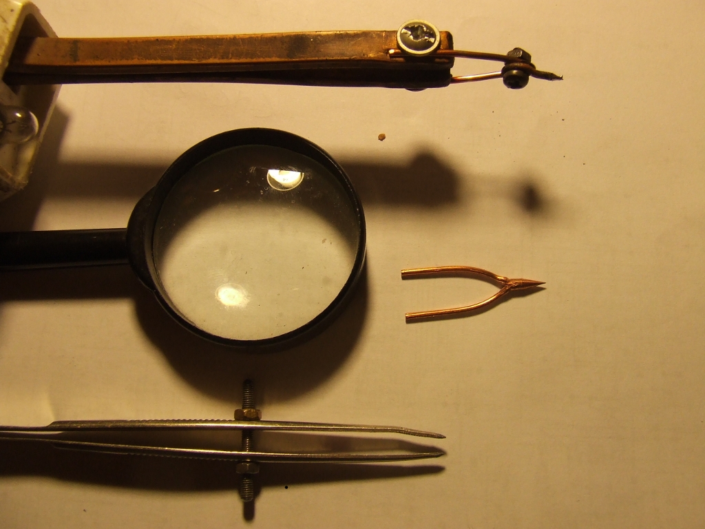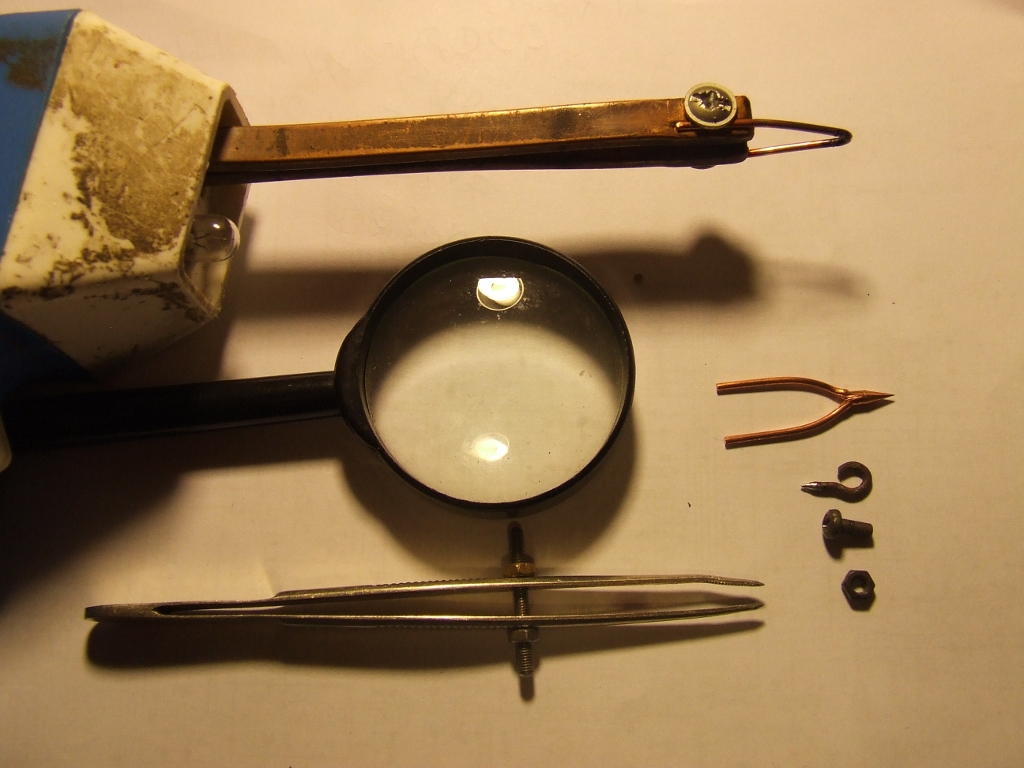 Zdjęcia pokazują narzędzia, które wydają się niezbędne przy pracach montażowych: lutownica (ja zawsze używam lutownicy transformatorowej), lupa (mam również zestaw szkła powiększającego na stojaku) oraz pęseta. Bardzo przydatna jest również drewniana wykałaczka lub po prostu zapałka ułatwiająca utrzymanie elementów smd na miejscu w trakcie lutowania. Lutownica musi mieć odpowiednio precyzyjny grot do lutowania. Ja używam specjalnego grotu zrobionego z kawałka drutu miedzianego odpowiednio wygiętego i połączonego z normalnym grotem lutownicy śrubą M3 tak jak to pokazuje drugie zdjęcie. Taki grot ma zaostrzoną końcówkę. Na allegro można zakupić również gotowy, precyzyjny grot do lutownicy transformatorowej pokazany na obu zdjęciach.