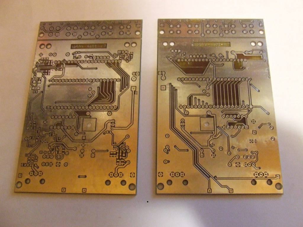 Zestaw dwóch płytek do budowy miernika - analizatora Na01. Na zdjęciu pokazano zestaw dwóch kompletów płytek z obu stron druku. Płytkę klawiszy oddziela się od płytki głównej przez przełamanie na granicy frezowania. Płytki wykonane są jako dwustronne, metodą przemysłową z metalizacją otworów i przelotek. Powierzchnie miedzi są cynowane bez soldermaski i opisów. Cena za płytki: 51 PLN + 6 PLN za przesyłkę