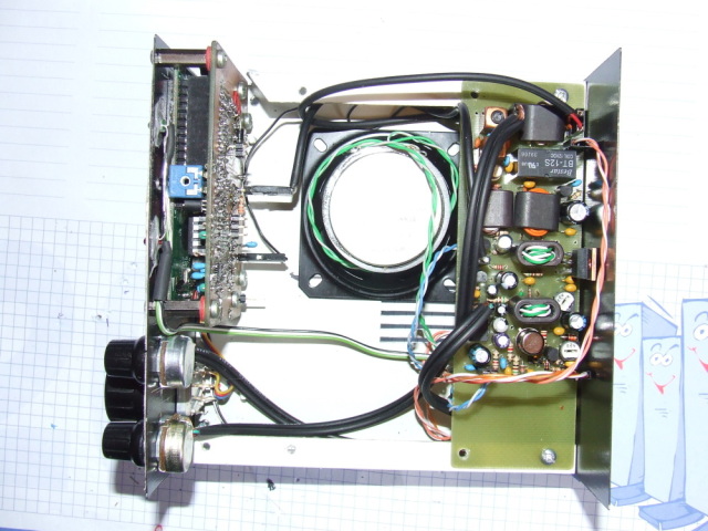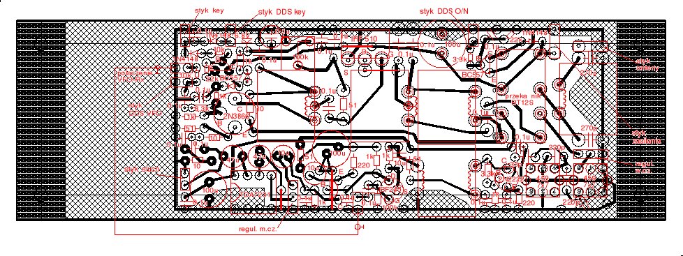 Transceiver wykonany został w typowej obudowie z blachy o wymiarach 140x65x150mm. Do płyty czołowej zamocowany został układ DDS a z jego lewej strony znajdują się pokrętła wzmocnienia w.cz, m.cz oraz pokrętło strojenia (impulsator). Na zdjęciu widać 4 wkręty mocujące układ DDS do płyty czołowej co wynika przede wszystkim z małej grubości ścianki przedniej obudowy. Gdyby jednak dokręcić do niej płytkę aluminiową o grubości 2mm wtedy można zastosować wkręty z łbem stożkowym i schować śruby pod atrapą. ![]() Wnętrze obudowy wydaje się puste bo uklad DDS zajmuje przestrzeń z przodu a płytka transceivera jest niewielka i zajmuje miejce z tyłu obudowy. Pośrodku widoczny jest głośnik ale ze względu na niewielką moc wzmacniacza końcowego odbiornika najlepsze warunki pracy zapewniają słuchawki. W podobnej obudowie wykonany zostanie transceiver 3.5/14, CW/SSB a wtedy zapewne wolna przestrzeń obudowy będzie przydatna. ![]() Testowa płytka transceivera wykonana została przy założeniu dość dużej gęstości upakowania elementów. Wszytkie połączenia zewnętrzne wykonane zostały z wykorzystaniem rozłączanych konektorów co ułatwia demontaż i ewentualne modyfikacje. Niestety, w pokazanym egzemplarzu obwód drukowany nie został wykonany bezbłędnie a właściwie okazało się, że wymaga modyfikacji więc jego postać w wersji ostatecznej będzie nieco inna. Transceiver wyposażony został w atrapę płyty czołowej maskującą wykonane w płycie otwory. Załączony rysunek może pomóc w wykonaniu własnej atrapy lub użycia tej w podobnej obudowie. Można również wykorzystać wyłącznie zaproponowany sposób rozmieszczenia otworów mocujących (50/80mm) oraz miejsc wykonania otworów na klawisze i wyświetlacz do naniesienia miejsca na mocowanie DDS we własnej konstrukcji. Rysunek ten zamieściłem również w zestawie rysunków Tiny DDS.Cały układ DDS ma wymiary o 5mm większe z każdej strony niż rozstaw śrub mocujących czyli 60/90mm. Wybór atrapy urządzenia zależy od sposobu wykorzystania układu Tiny DDS. Jeśli budujemy transceiver CW wyłącznie na jedno pasmo to najlepszym rozwiązaniem jest sterowanie za pomocą 3 klawiszy i atrapa dopasowana do tej ilości przycisków. Jeśli Tiny DDS ma pracowac w urządzeniu wielopasmomym oraz z emisjami CW i SSB to lepsza będzie klawiatura z 5 przyciskami i odpowienia do niej atrapa. Uwaga: w obu tych przypadkach należy wgrać do sterownika ATMega8 inny program sterujący. ![]() Płytka drukowana ma rozmiary przystosowane do rozmiarów obudowy. Montując transceiver w inny sposób można ją oczywiście 'przyciąć do pola montażowego elementów. Rysunek górny to widok druku od strony lutowania a rysunek dolny nadaje się do metody termotransferowej. ![]() Montaż układu należy rozpocząć od wykonania zwor. Zalecam zmontowanie części wspólnej jako pierwszej, następnie odbiornika a na końcu nadajnika. |