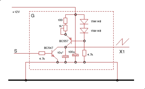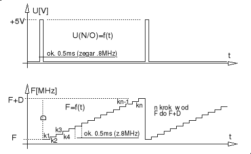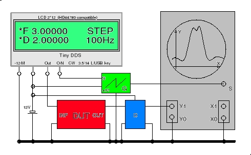Zasada działania wobulatora polega na badaniu odpowiedzi badanego układu na wyjściu po pobudzeniu go na wejściu sygnałem o znanej i zmieniającej się w czasie częstotliwości. Z pomocą oscyloskopu można dosłownie zobaczyć jak wygląda charakterystyka badanego układu w układzie częstotliwość/wzmocnienie. Jest to więc idealny sprzęt do badania urządzeń radiowych, wzmacniaczy, filtrów, i innych urządzeń pasywnych oraz aktywnych. Widząc w czasie rzeczywistym charakterystykę częstotliwościową układu można dobierać elementy badanego układu tak aby jego parametry odpowiadały założeniom. ![]() Zgodnie z zasadami działania oprogramowania wuobulatora na wyjściu synchronizacyjnym O/N układu Tiny DDS pojawia się impuls synchronizacyjny 5V (logiczna jedynka) trwający 500us a częstotliwość wyjściowa ustawiona zostaje na wartość startową (na wyświetlaczu F). Druga pokazana na wyświetlaczu wartość D to przedział częstotliwości w jakiej następuje przestrajanie generatora. Obie te wartości wyrażone są w MHz. Po zakończeniu jednego cyklu generatora częstotliwość wyjściowa zmienia się z F do wartości F+D w ciągu N kolejnych kroków trwających po 500us każdy. Ilość kroków potrzebnych do zmiany z częstotliwości F do częstotliwości F+D ustawia się w SETUP-ie w zakresie od 10 do 200. Oznacza to, że generator przyjmuje dyskretne wartości zmieniające się od F do F+D z krokiem D/N a jeden cykl generatora może trwać od 10*500us=5ms do 200*500us=100ms. Podane czasy obowiązują dla zegara 8MHz. Użycie zegara o dwukrotnie większej częstotliwości oczywiście dwukrotnie skróci te czasy. ![]() Rysunek pokazuje jak wykorzystać Tiny DDS z oprogramowaniem wobulatora do budowy najprostszego systemu pomiarowego. Układ Tiny DDS dostarcza dwóch sygnałów: sygnału wcz. oraz sygnału synchroniazcji na wyprowadzeniu O/N. W systemie pomiarowym znajduje się dodatkowo detektor D. Sygnał S dołączony do wejścia synchronizacji zewnętrznej oscyloskopu uruchamia podstawę czasu w oscyloskopie (X). Jednocześnie z krokiem D/N następuje przestrajanie częstotliwości pomiarowej Tiny DDS podawanej na wejście badanego układu (DUT). Na wyjściu badanego układu działa detektor wcz. (D) skąd otrzymuje się napięcie stałe proporcjonalne do wzmocnienia (tłumienia) mierzonego układu na danej częstotliwości. Napięcie to podane na wejście Y oscyloskopu tworzy wykres charakterystyki częstotliwościowej badanego układu. ![]() Pewną odmianą powyższego systemu pomiarowego jest kolejny układ gdzie dodatkowo działa zewnętrzny, wyzwalany generator piłokształtny G zastępujący podstawę czasu w oscyloskopie i dołączony do wejścia wzmacniacza X oscyloskopu. Oczywiście jeśli badany układ (DUT) jest aktywny to wymaga zasilania. Zasilania wymaga również detektor D oraz generator podstawy czasu G. ![]() Detektor zamienia napięcie wcz z wyjścia badanego układu na napięcie stałe podawane na wejście wzmacniacza Y oscyloskopu. Sercem detektora jest dioda szeregowa wcz. z polaryzacją pozwalającą na wielokrotne zwiększenie czułości detekcji. Druga identyczna dioda, zasilana napięciem stałym, tworzy napięcie polaryzujące diodę detekcyjną jednocześnie stabilizując termicznie punkt pracy diody detekcyjnej. Można tu użyć na przykład dwóch diod 1N4148, ja używam diod Schottk'y np. BAT 42 ze względu na niższe napięcie odcięcia. ![]() Jeśli oscyloskop nia ma wyzwalania zewnętrznego podstawy czasu lub żle działa ten typ sterowania wtedy można sterować podstawę czasu za pomocą prostego, wyzwalanego generatora piłokształtnego. Zasada działania układu polega na ładowaniu kondensatora 10uF ze źródła prądowego zbudowanego na tranzystorze pnp. Taki sposób ładowania tworzy na kondesatorze 10u liniowy wzrost napięcia od zera do wartości bliskiej napieciu zasilania z prędkością ustaloną przez rezystor 1K w obwodzie emitera tranzystora pnp. Kolejny, dodatni impuls synchronizacyjny na wejściu S włącza na chwilę tranzystor npn, który w bardzo krótkim czasie rozładowuje kondensator 10u prawie do wartości zerowej. Impuls synchronizacji trwa krótko więc następuje kolejny liniowy cykl ładowania kondensatora 10u a napięcie na nim przyjmuje kształt piły. Dobierając wartość kondensatora 10u oraz potencjometru 1k należy tak ustalić prędkość narastania napięcia na kondensatorze aby nie narastało do wartości maksymalnej wcześniej niż pojawi się kolejny impuls synchronizacyjny. |