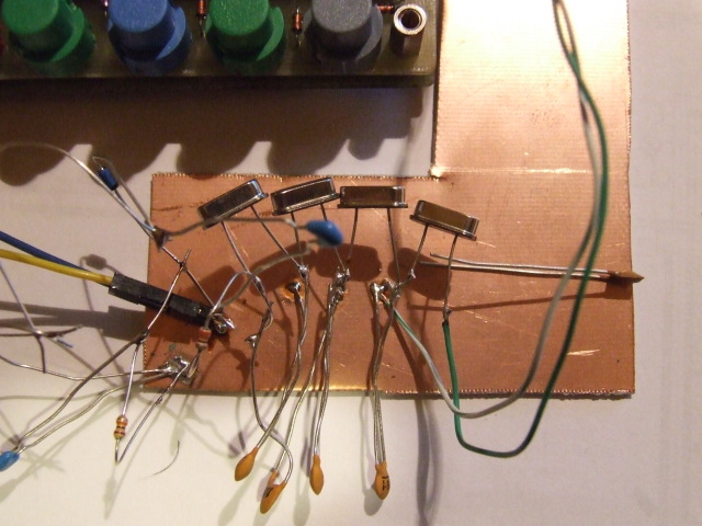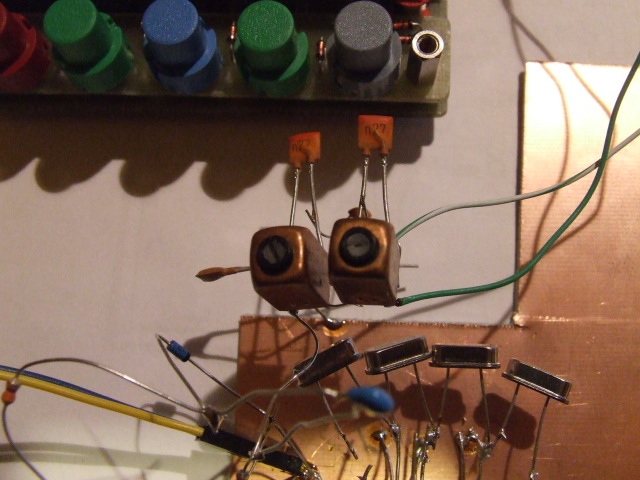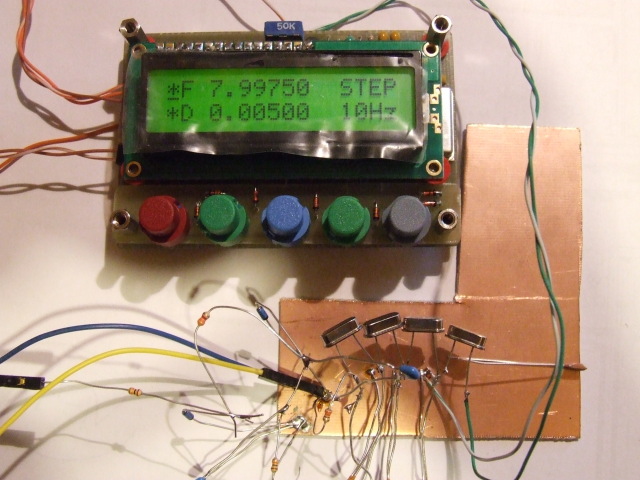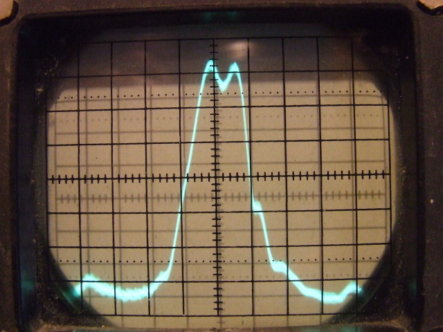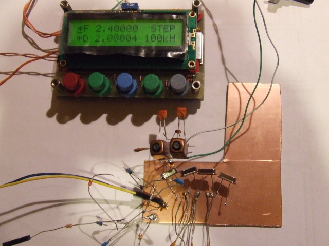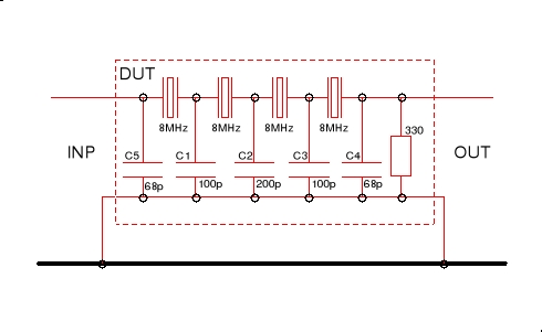 Z posiadanych kilku rezonatorów 8MHz użwanych zwykle do sterowania mikrokontrolerami złożyłem filtr według poniższego schematu (początkowo nie działały w układzie kondensatory C4 i C5). ![]() W naturze ten układ wyglądał nieco mniej imponująco ale za to dał się zrobić w kilka minut ![]() Cały układ pomiarowy z generatorem Tiny DDS oraz detektorem wyglądał następująco. ![]() Jak widać na wyświetlaczu Tiny DDS zakres przestrajania wynosił 5kHz w pobliżu częstotliwości 8MHz a na ekranie oscyloskopu charakterystyka wyglądała następująco: ![]() Na tym i na kolejnych zdjęciach filtra kwarcowego skala to ok. 400Hz na jedną działakę a więc pasmo przenoszenia wynosi ok. 800Hz a więc prawie jak na filtr CW. ![]() Do pokazanego układu dołączyłem najpierw pojemność C4 co poprawiło charakterystykę filtru z jednej strony: ![]() Następnie zastosowałem pojemność C5 co poprawiło charakterystykę z drugiej strony oraz wyrównało charakterystykę w paśmie przenoszenia. Całość prac zajęła mi kilkanaści minut. Kolejnym moim celem stał się filtr pasmowy zbudowany z dwóch seryjnych obwodów 7x7 typu 459 oraz trzech kondensatorów: ![]() Filtr zmontowałem tuż obok mierzonego wcześniej filtru kwarcowego i użyłem tego samego detektora ![]() Tym razem częstotliwość startowa to 2.4MHz a pasmo przestrajania generatora pomiarowego to 2MHz. ![]() Celowałem na filtr pasmowy dla pasma 3.5MHz ale okazało się, że pasmo przenoszenia wynoszące ok. 400kHz leży nieco niżej bo od ok. 3 do 3.4 MHz ![]() |