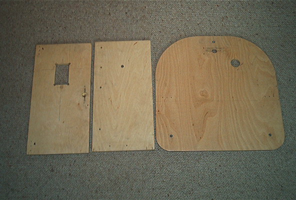 | Zdjęcie pokazuje elementy konstrukcyjne przed złożeniem. wymiary płyt ruchomych zawierają rysunki: płyty 1 oraz płyty 2. W szczególności płyta 1 ma w rogach wycięcia na mechanizm napędowy nawiercone otwory o średnicy 6-8mm ułatwiające wycięcie otworu piłką włosową. Płyty ruchome połączone są ze sobą w dwóch miejscach zawiasami o wymiarach skrzydełka 13/30mm z dwoma otworami. Płyta 1 połączona jest z podstawą za pomocą zawiasów o wymiarach skrzydełka 20/40mm i trzech otworach na śruby mocujące. | ![]() |