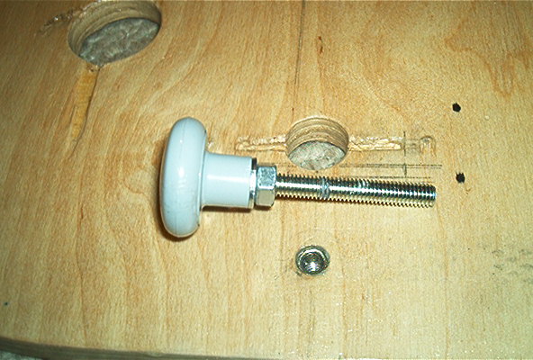 | Podstawa "Koziołka" ma możliwość ustawienia poziomu ponieważ podparta jest w 3 punktach za pomocą regulowaych nóżek wykonanych z plastykowej gałki meblowej oraz śruby M6 znajdującej się w komplecie z gałką. Ponieważ w podstawie wklejone zostały nakrętki (po odcięciu zaślepionej główki) to możliwa jest regulacja poziomu podstawy a zatem całej konstrukcji urządzenia. | ![]() |