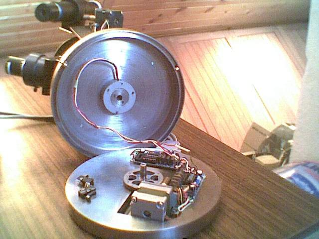 Zdjęcie 3. Napęd osi pionowej (azymutalny) mieści się w podstawie teleskopu składającej się z dwóch części: nieruchomej podstawy właściwej oraz talerza napędowego ślizgającego się po podstawie na 3 rolkach. Napęd azymutalny jest identyczny z napędem wysokości (te same elementy i przełożenia). Dla zmiejszenia wymiarów silnik krokowy został 'wpuszczony' w dolną część podstawy. Na zdjęciu widoczne są także układy sterujące silnikami krokowymi obu napędów. |