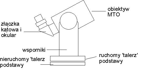 Rysunek 4. Na teleskop składa się podstawa, ramiona wsporcze zamontowane na ruchomej części podstawy, oraz mocowanie obiektywu MTO. Górna część podstawy zapewnia obrót teleskopu w pionie (azymut) a uchwyt obiektywu MTO wykonany w formie 'kołyski' zapewnia obrót teleskopu w poziomie (wysokość). |