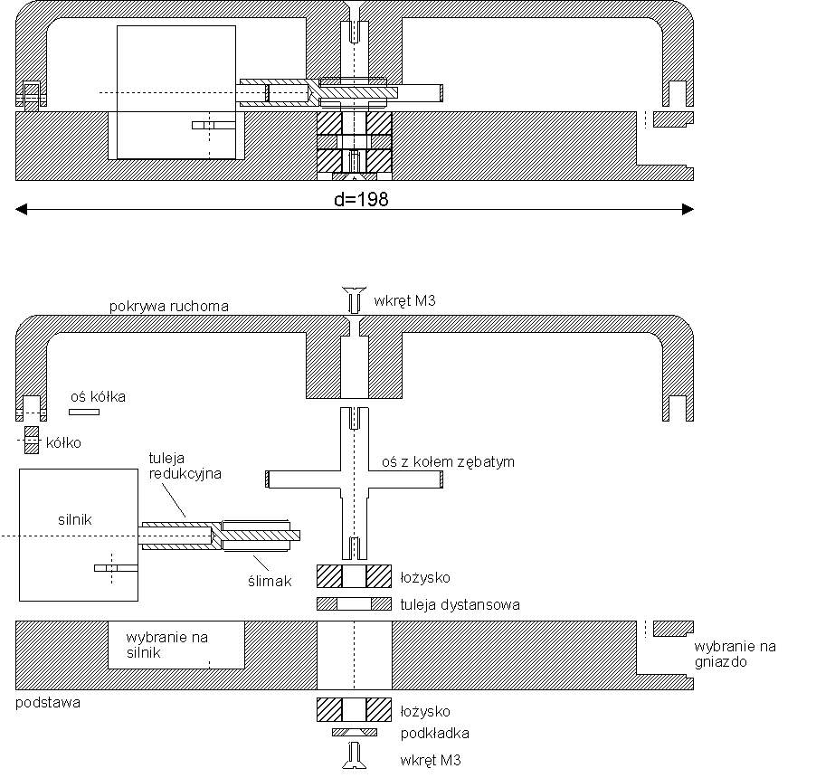 Rysunek 6. Rysunek pokazuje w jaki sposób wykonana została podstawa. Stała i ruchoma część podstawy wykonana jest ze stali. Oś pionowa obrotu górnej części podstawy łożyskowana jest za pomocą dwóch łożysk mocowanych przez wklejenie w dolną część podstawy. |