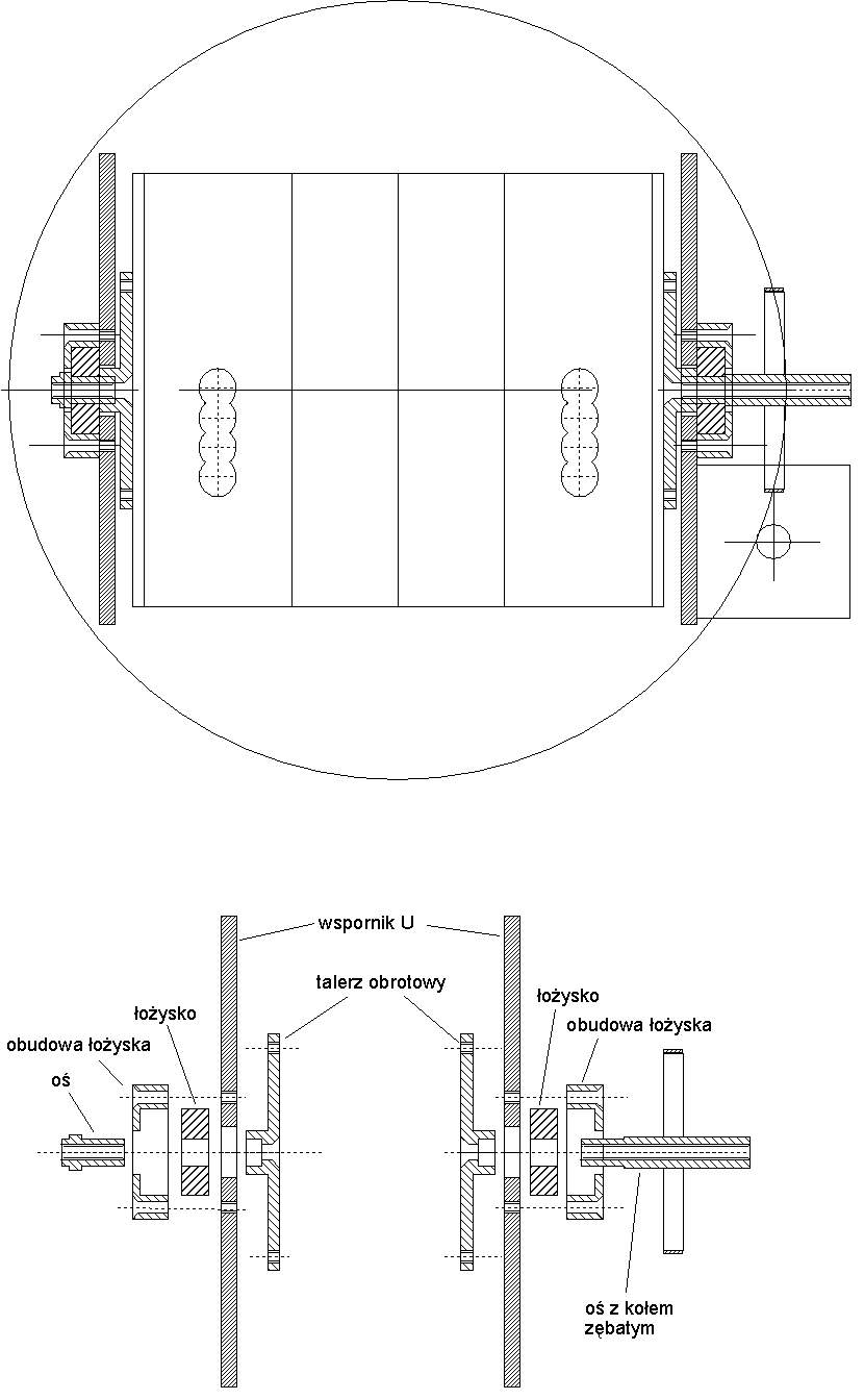 Rysunek 7. Obiektyw MTO zamontowany w 'kołysce' łożyskowany jest w ramionach wspornika za pomocą dwóch półosi i łożyska oraz kilku dodatkowych elementów wsporczych i mocujących. Na jednej z półosi zamocowane jest koło zębate napędu a na drugiej koło z podziałką. |