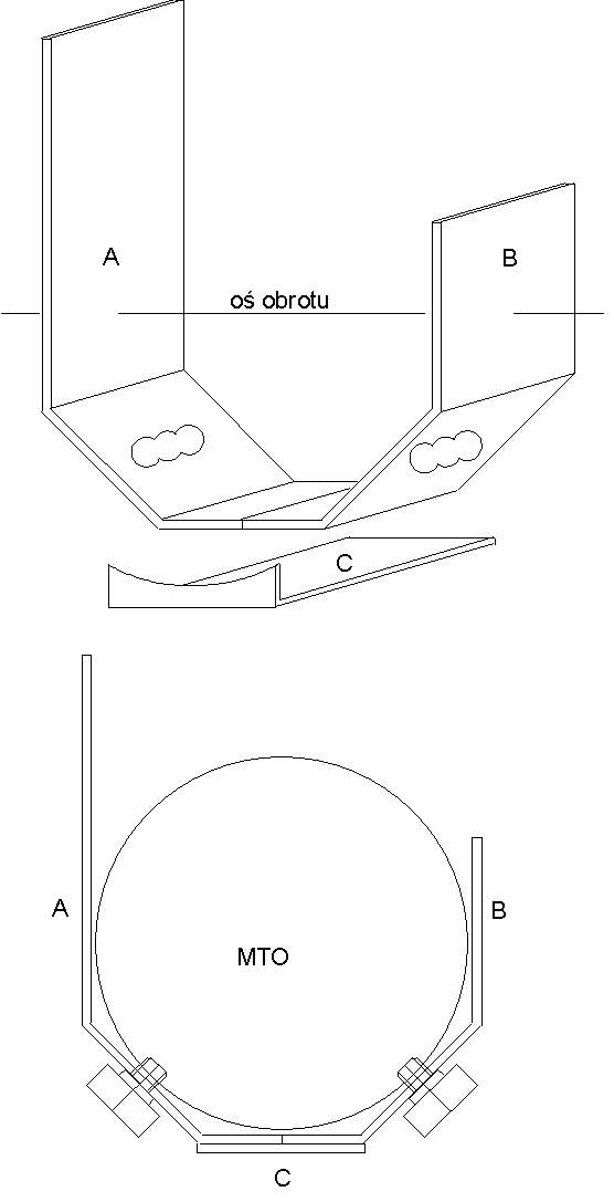 Rysunek 8. Do mocowania obiektywu MTO służy 'kołyska' wykonana z trzech części: dwóch ramion A i B oraz podstawy C łączącej ramiona. Elementy łączone są ze sobą ośmioma wkrętami M3. Jedno z ramion - A jest nieco dłuższe - na tym ramieniu mocowana jest lunetka celownicza. W bocznych ściankach ramion 'kołyski' znajduje się kilka otworów do mocowania MTO - miejsce mocowania dobiera się w zależności od konfiguracji teleskopu tak aby zachować punkt równowagi teleskopu (np. z dokręconym aparatem) możliwie blisko osi obrotu kołyski. |