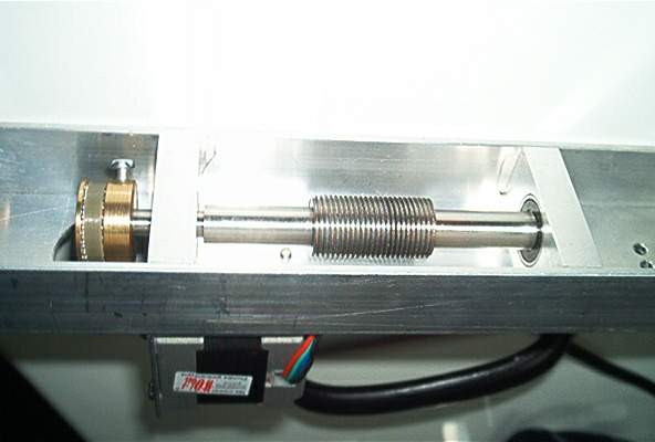 . Mechanizm napędowy zbudowany jest z wykorzystaniem aluminiowego kątownika 45/25/2.5mm Oś napędowa wykonana jest z jednego kawałka metalu i w swojej środkowej jest nagwintowana gwintem odpowiadającym temu jaki jest na śrubie zwiniętej na kole napędowym. Oś napędowa łożyskowana jest w dwóch miejscach za pomocą małych łożysk kulkowych (607RS) więc jej ruch jest płynny i bezluzowy. Z prawej strony widoczne jest większe koło zębate przekładni paskowej. Silnik mocowany jest z drugiej strony profilu a pasek przekładni przechodzi przez profil dzięki otworowi w jego powierzchni środkowej |