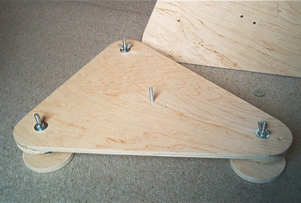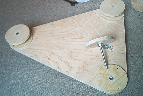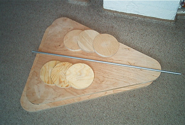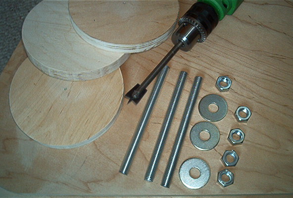 Zdjęcie pokazuje podstawowe elementy z jakich zbudowana jest platforma. Są to dwie płyty ze sklejki o grubości 18mm, 3 koła na stopy ze sklejki o grubości 18mm, 3 koła ze sklejki o grubości 12mm, pręt gwintowany M12 o długości ok. 50cm oraz nie pokazane tu nakrętki i podkładki M12. Płyty i koła zleciłem do wykonania w najbliższym punkcie 'Zrób sam'. Wykonanie oceniam na 4 w skali 5 punktowej. Wykonanie otworów w kołach i płytach zostawiłem sobie. Wykonanie elementów kosztowało ok. 130 PLN z materiałem.