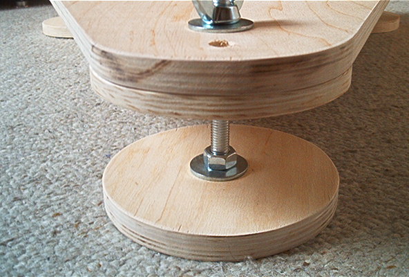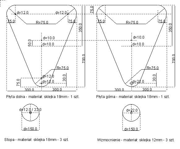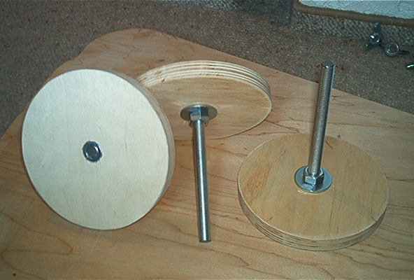Pierwszym elementem do zrobienia są stopy regulacyjne. Każda stopa to okrągła podstawa ze sklejki 18mm na gwintowanej nodze zrobionej z odcinka śruby M12 o długości 150mm. Do kompletu potrzebne sa jeszcze po dwie nakrętki M12 i podkładka na każdą ze stóp. W każdym z kół należy wykonać dwustopniowy otwór o średnicy 22.0/12.0mm zaczynając oczywiście od odtworu 22.0mm. Otwór ten powinien mieć głębokość ok. 10mm po to aby schowała się w nim całkowicie nakrętka M12. Nakrętkę tę należy wcisnąć w otwór o średnicy 22mm podczas skręcania stopy. |